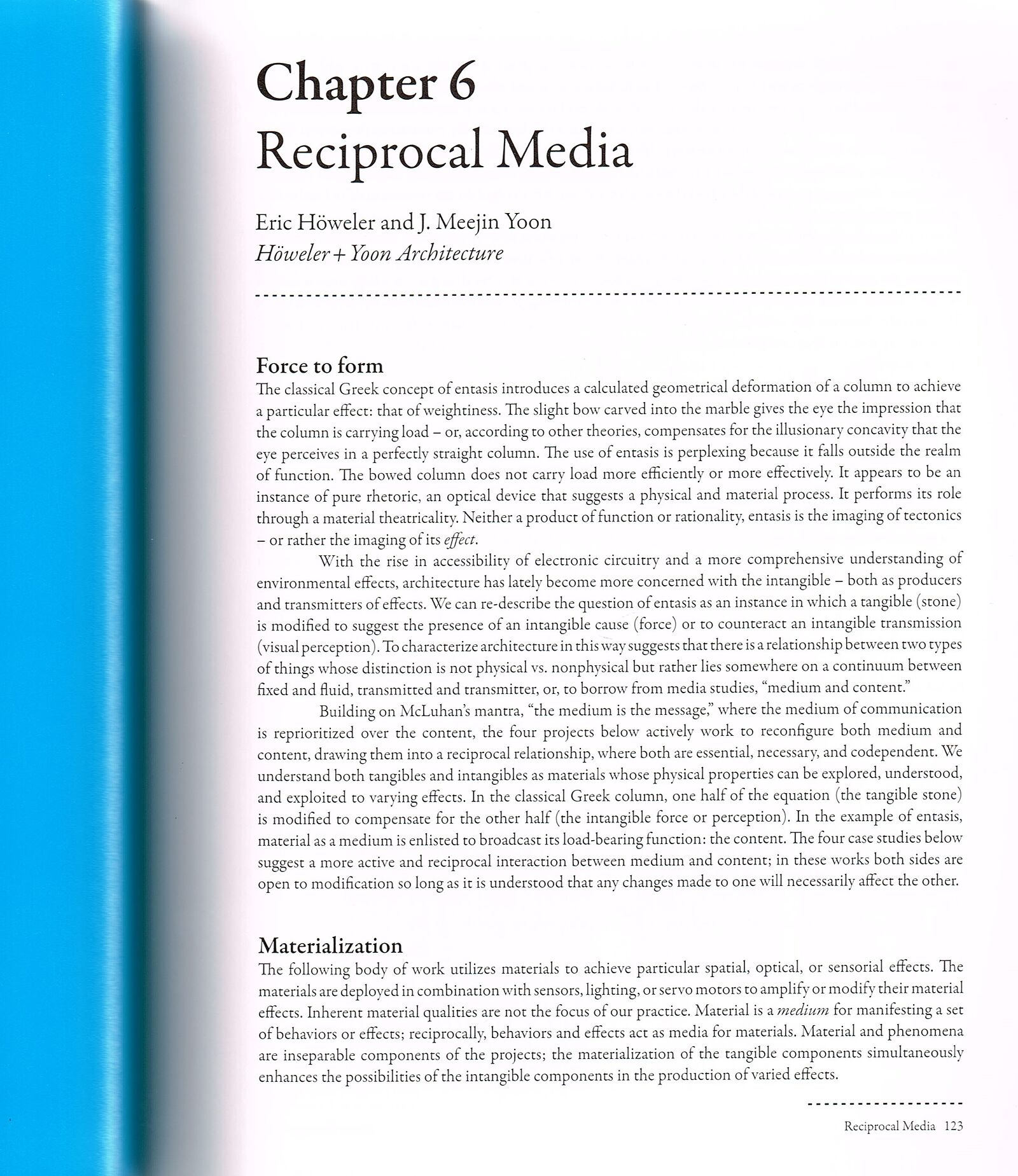 Höweler, Eric; J. Meejin Yoon. “Reciprocal Media,” in Gail Peter Borden and Michael Meredith (Eds.) Matter: Material Processes in Architectural Production. Oxon, UK: Routledge, 2012: p. 123-141.