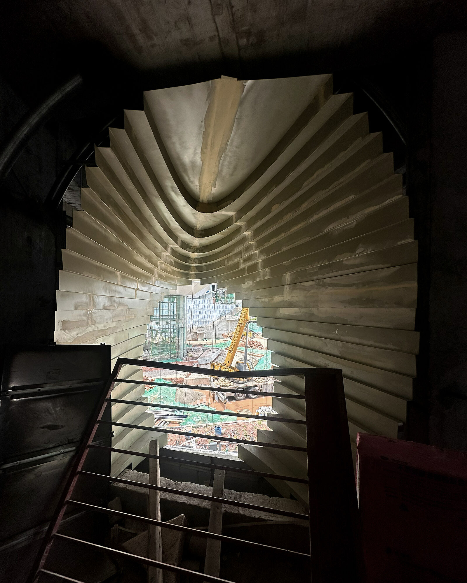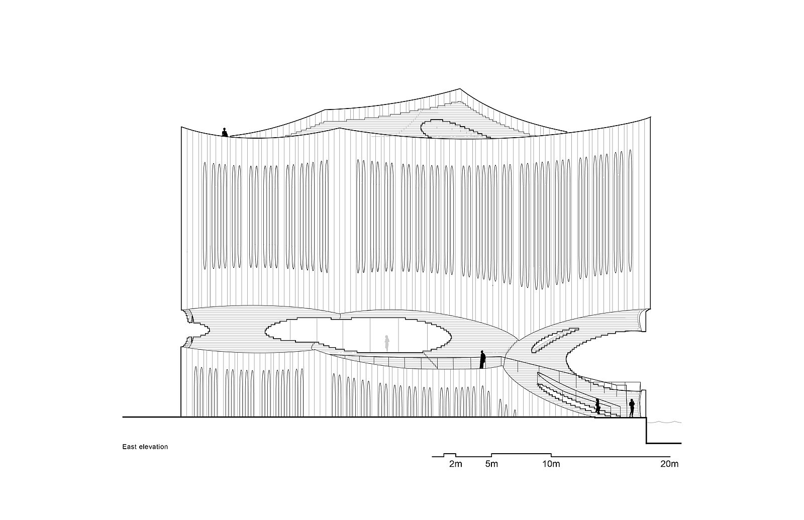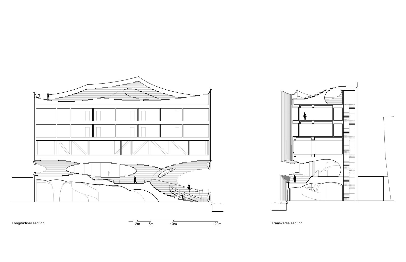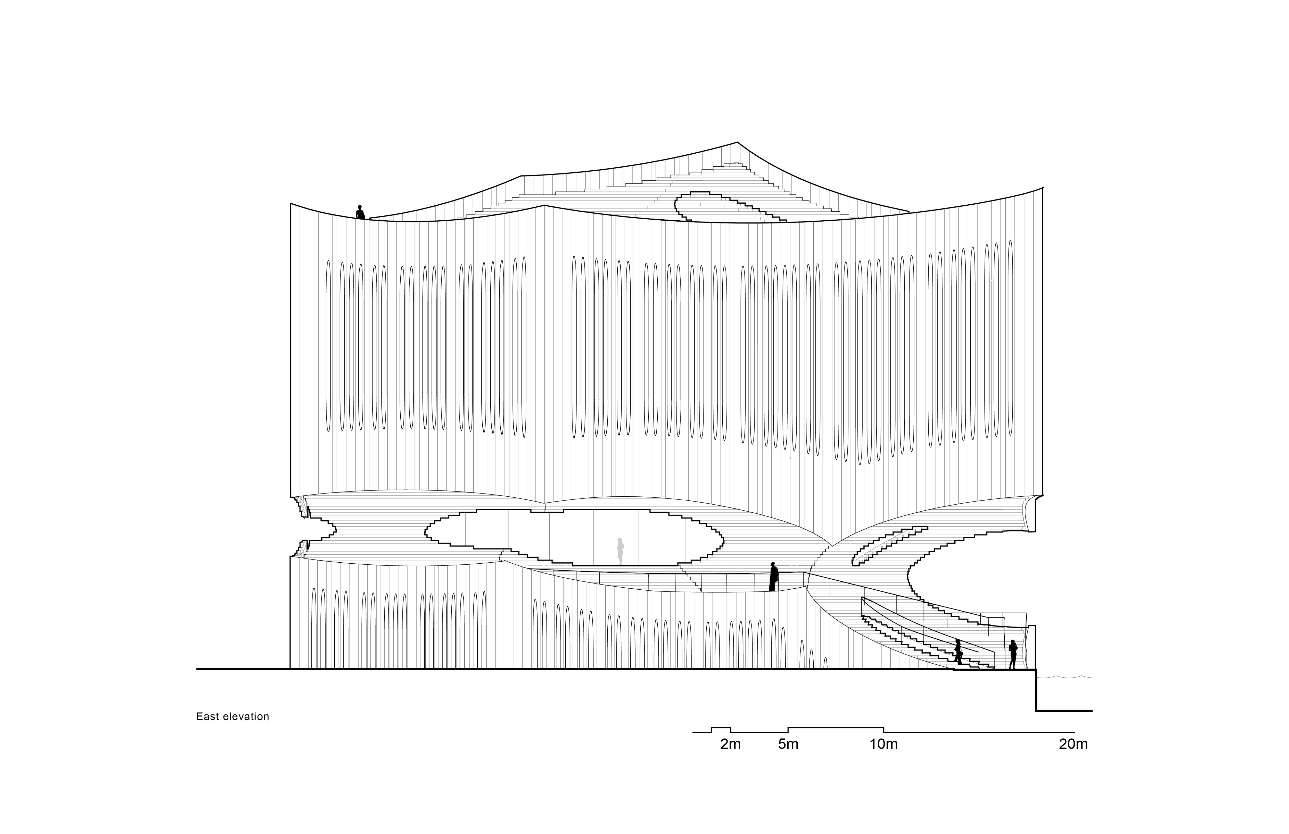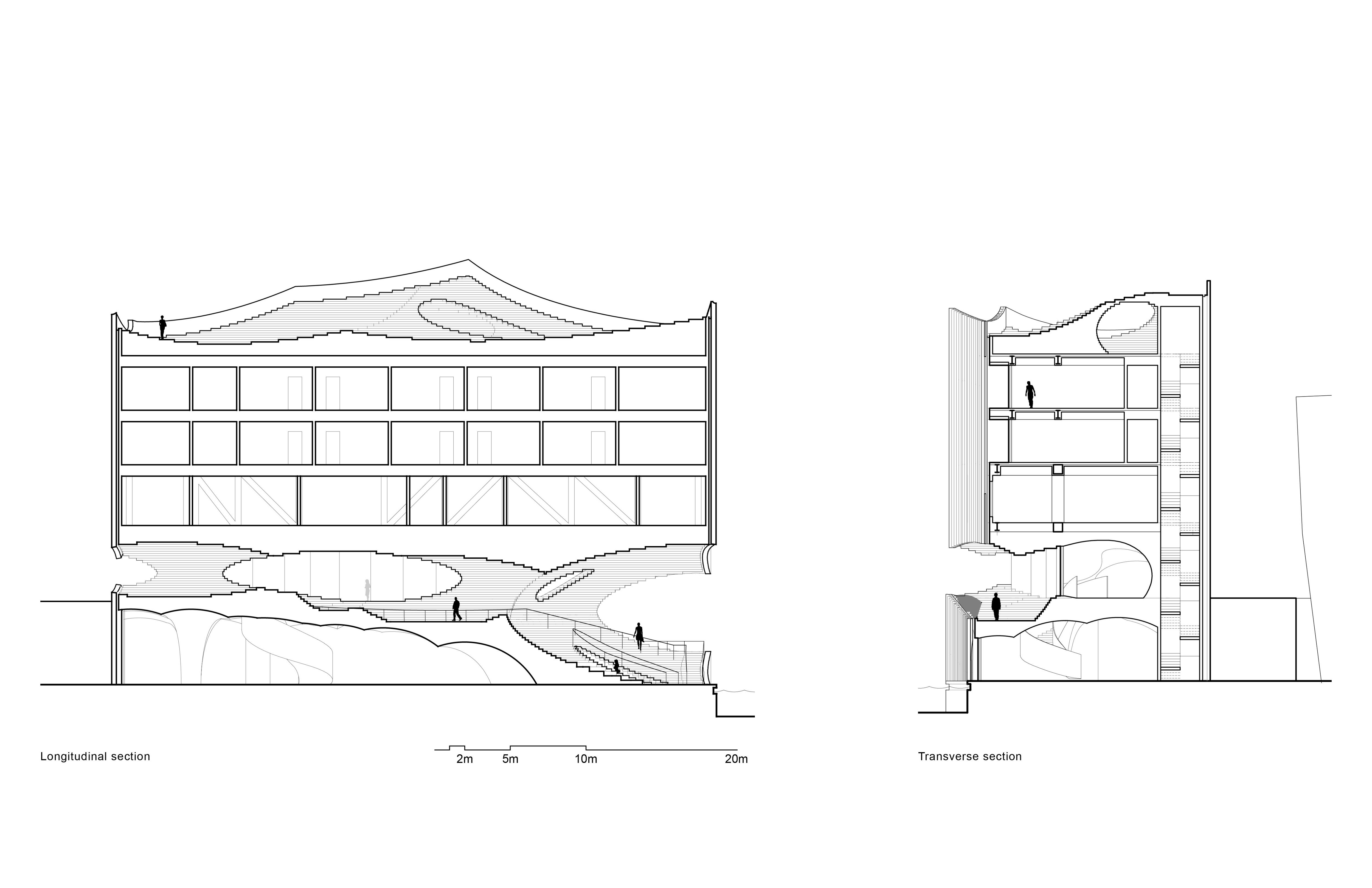 Guests will arrive by boat and will dock under the fifteen-meter long cantilevered space. Under this cantilever, contoured steps bring people up from the water level (1B) to an upper cafe level (1F). These steps form an outdoor amphitheater that can be programmed for group yoga sessions, small concerts, and performances. The second floor consists of the yoga reception area and a retail space, with the fourth and fifth floors comprising of eighteen rooms and yoga studios. To support the fifteen-meter cantilever span above the Boolean space, a truss is used at the third-floor level. The stepped expression that is introduced at the hotel's main access point continues onto the roof garden where people can observe the vast scenery without obstruction.