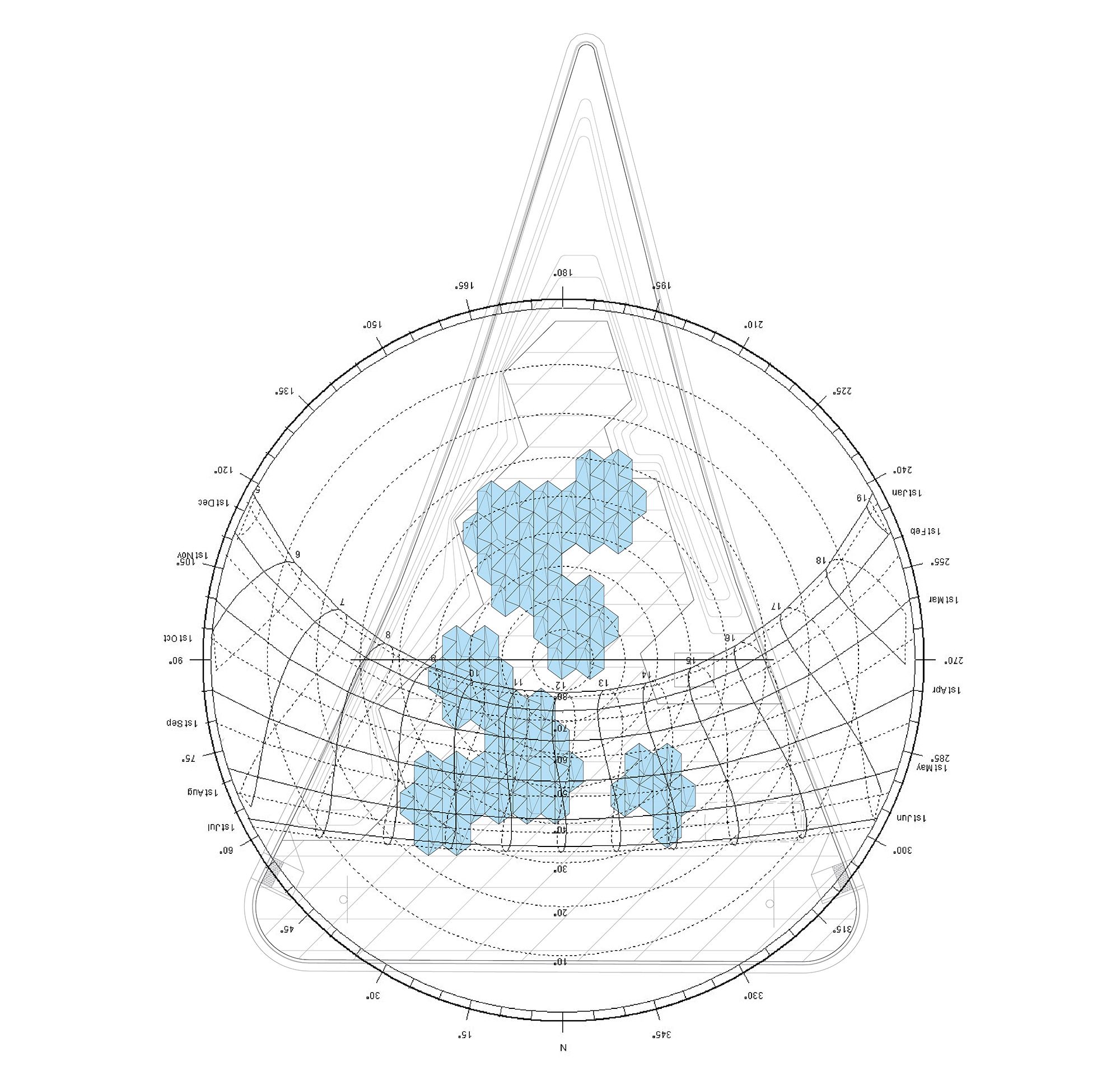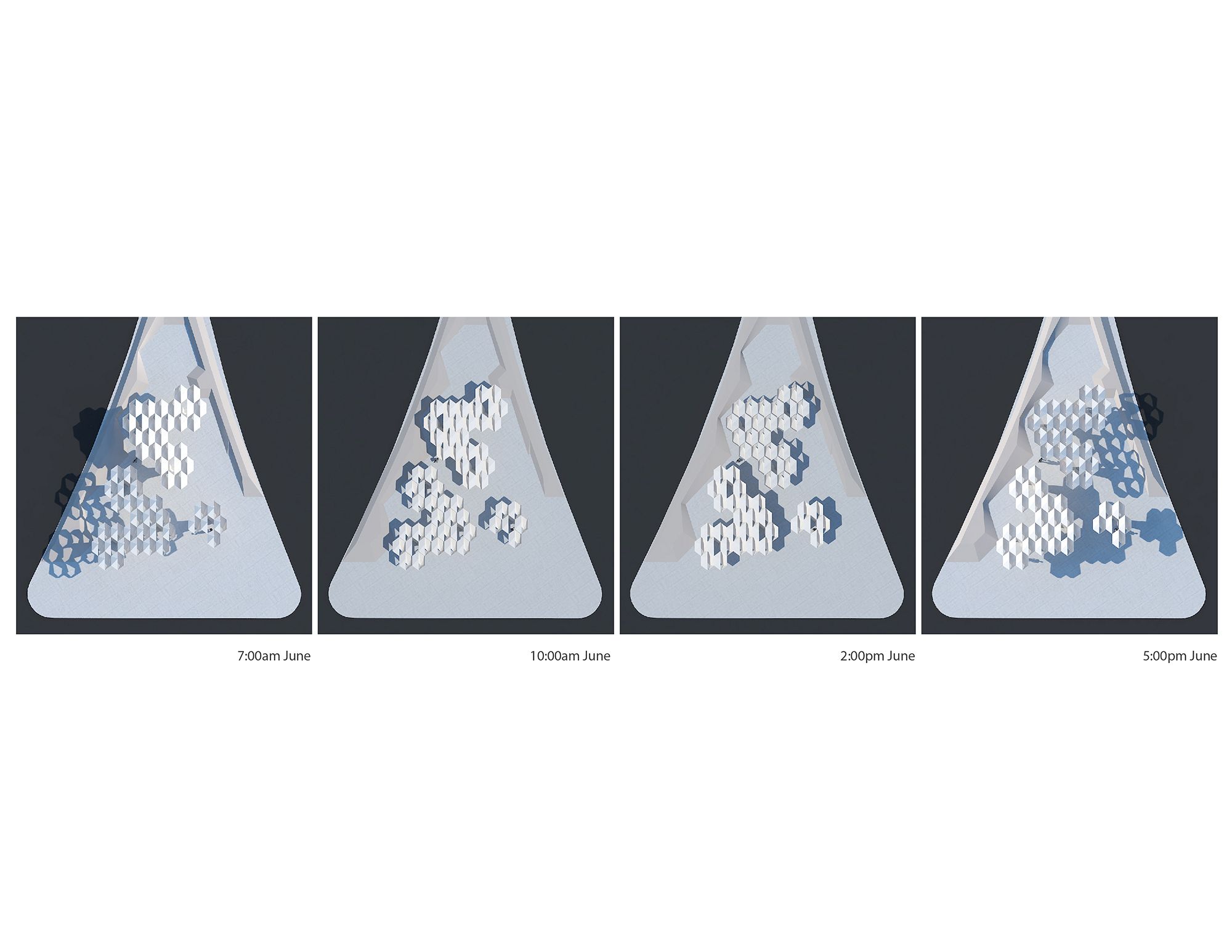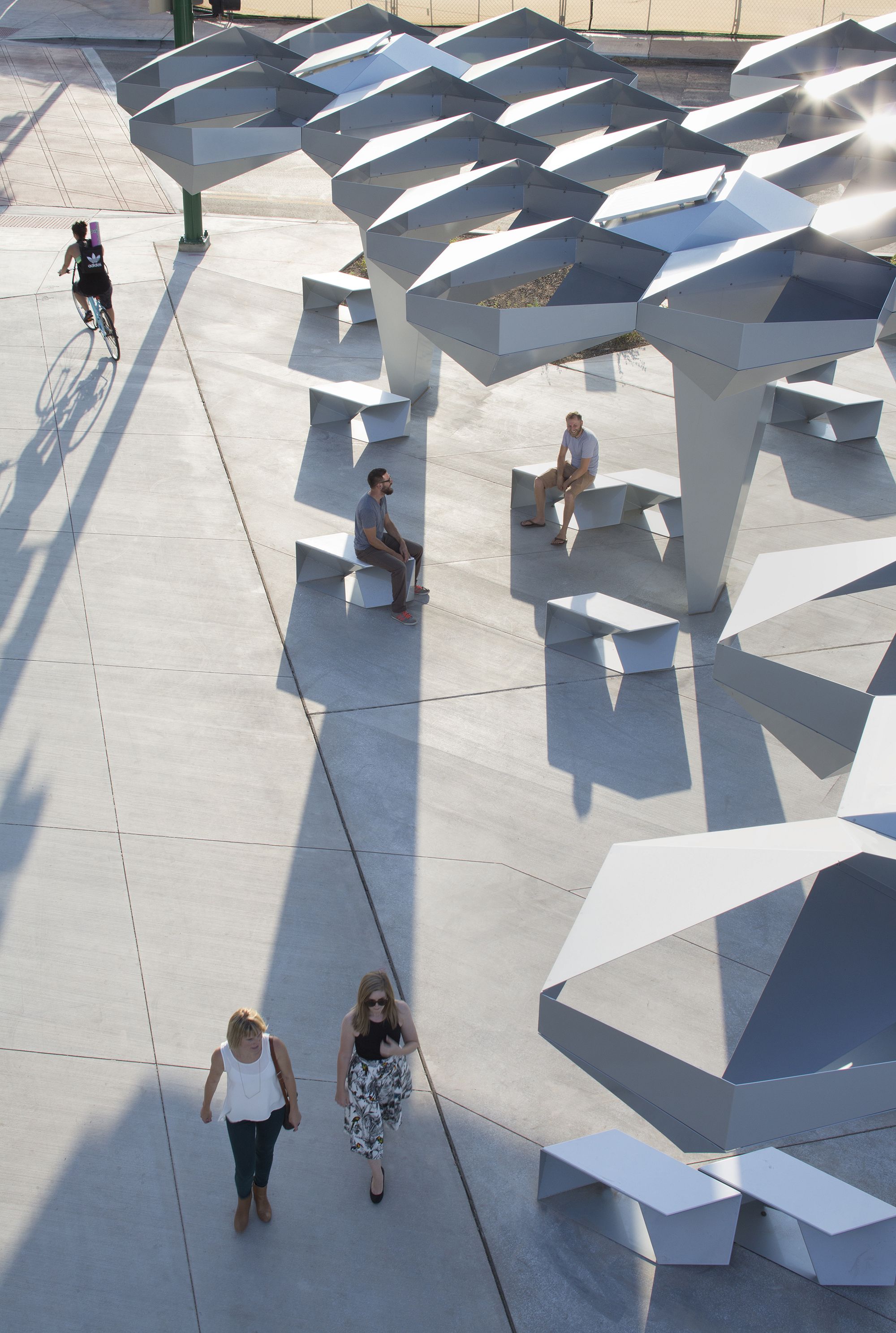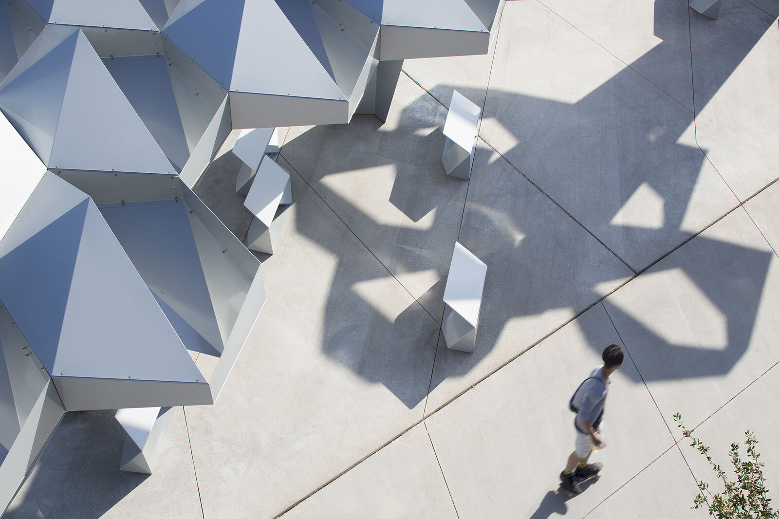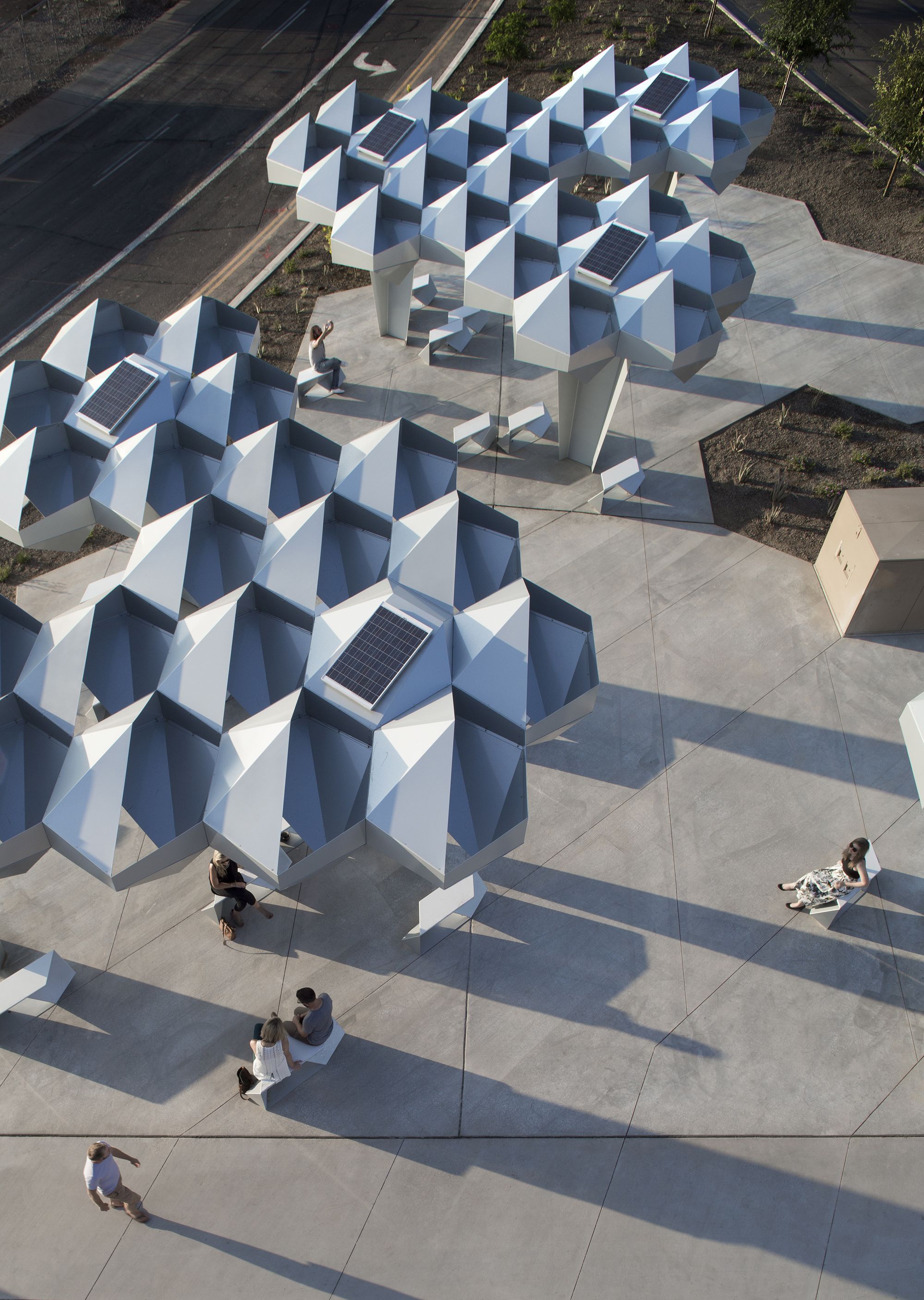 Shadow Play's hovering canopy is formed from an aggregation of identical geometric modules. Each module is fabricated from a steel plate to create a thin but structurally rigid cell. The aggregation of individual cells form clusters that span between vertical supports to create an angular canopy of open cells. The folded steel cells filter the intense sunlight, casting shadows on the ground and creating local micro-climate in the shade. The geometry of the canopy maximizes the production of shade and shadow while allowing for breezes and air movement.