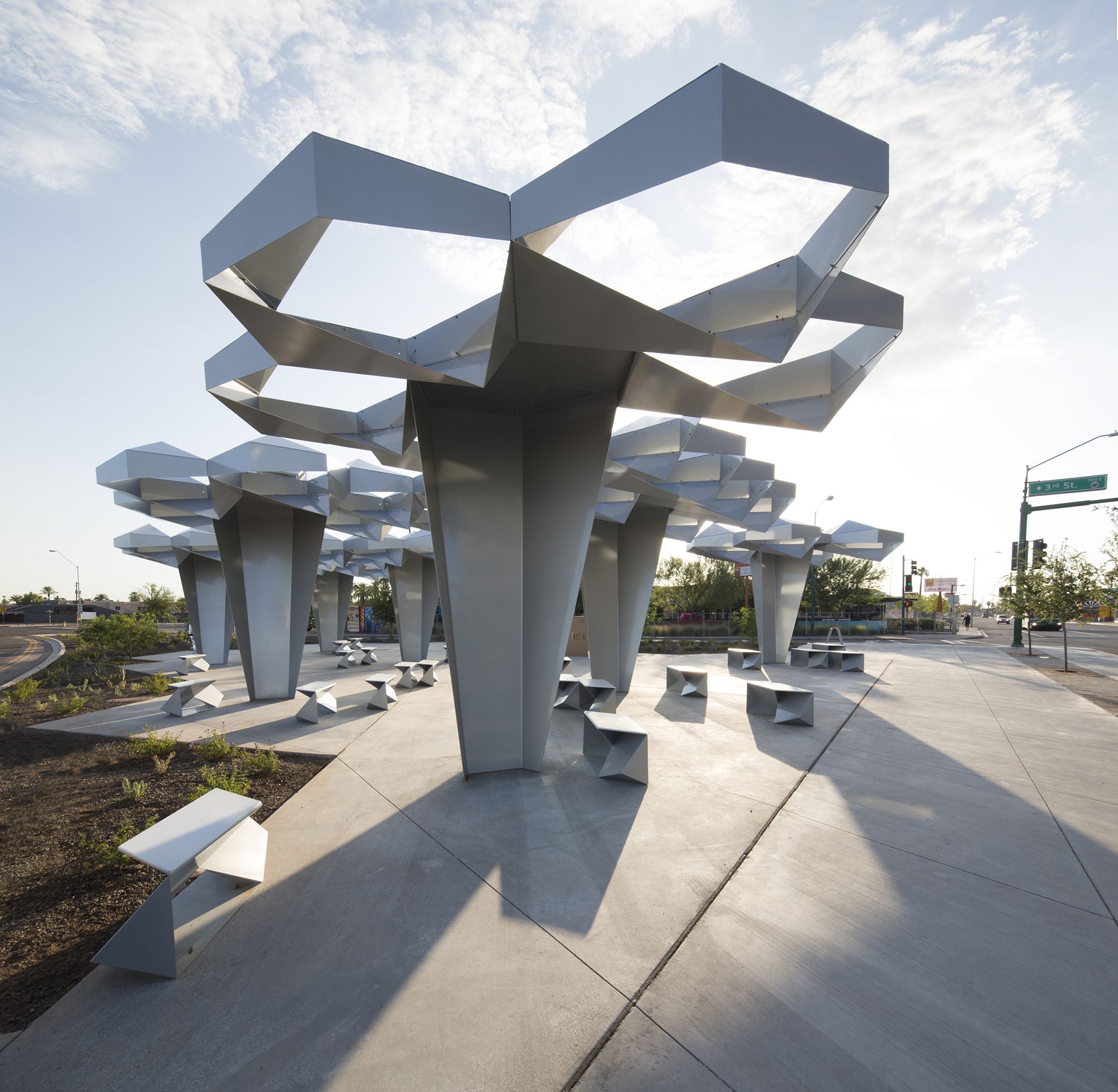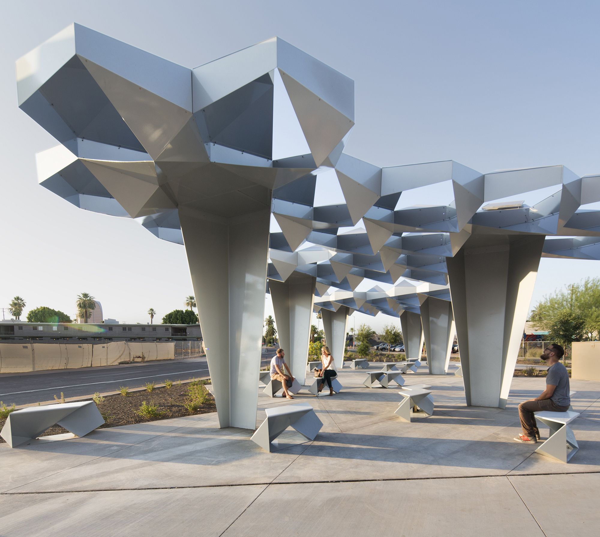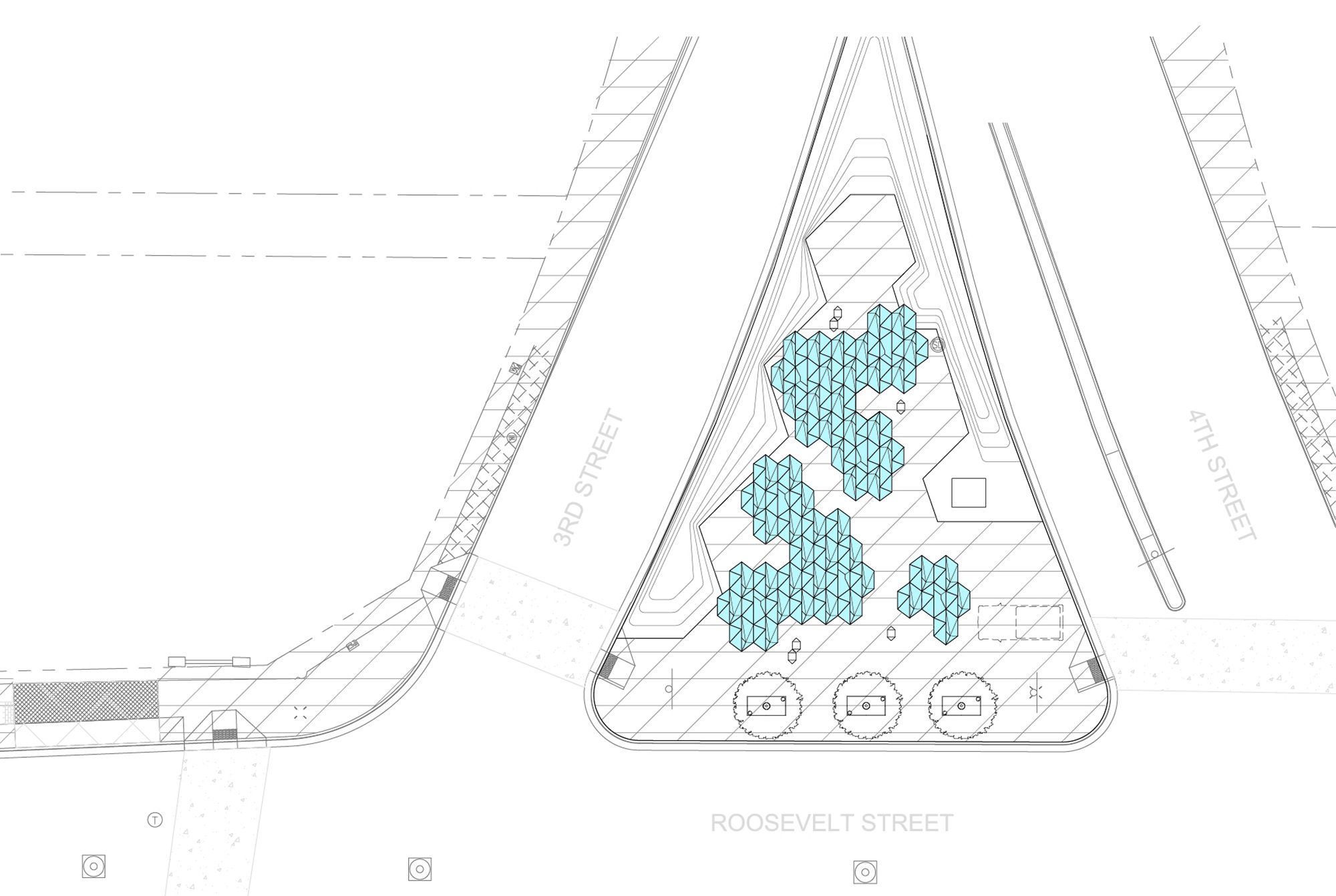 By transforming a traffic median into a public space, Shadow Play fosters pedestrian life and improves the downtown Phoenix streetscape at Roosevelt Row. Clusters of shade structures create a respite from the desert sun by offering a public parasol at an urban scale.