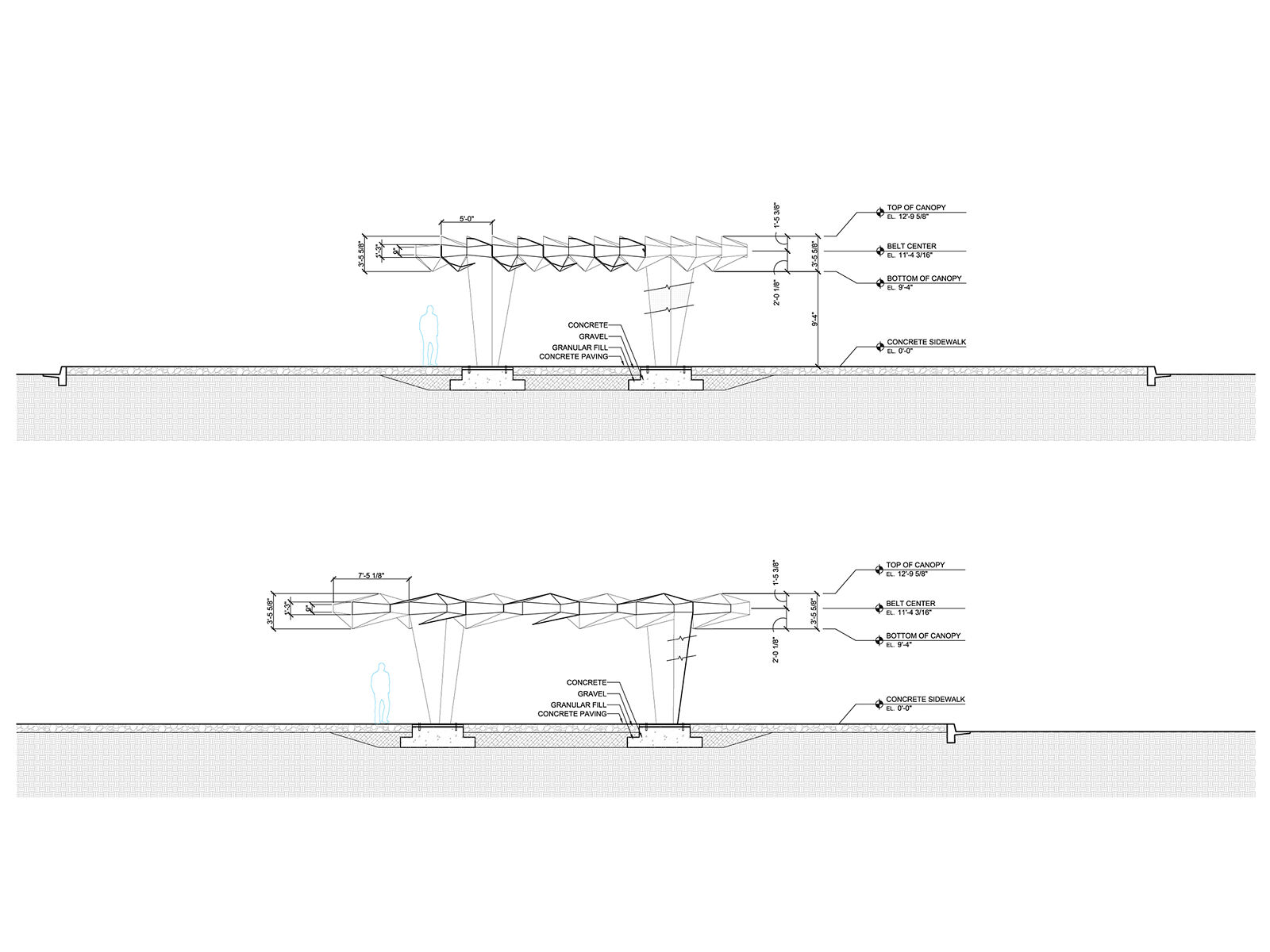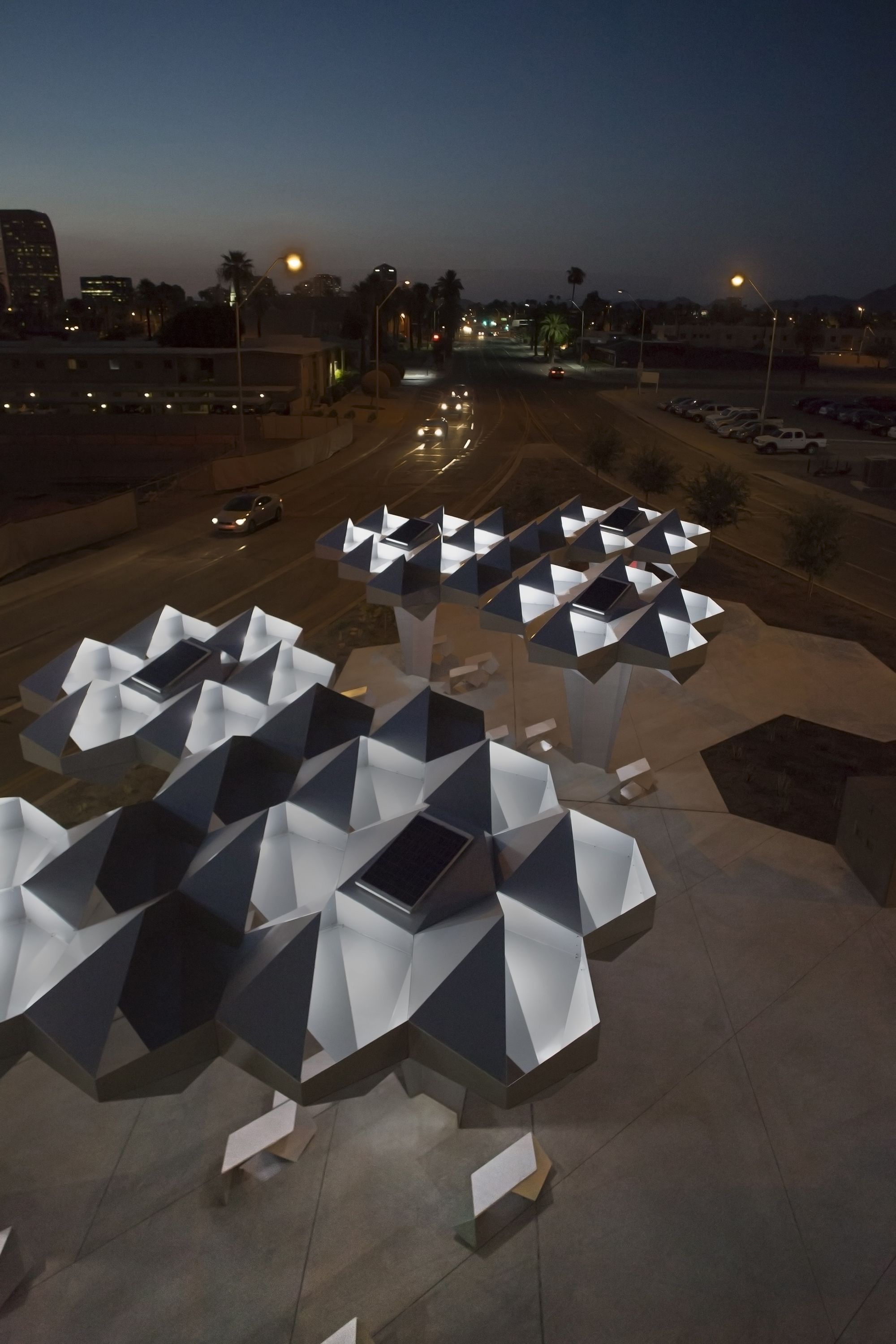 Photovoltaic panels are mounted to the top surface of the canopy, taking advantage of the optimally oriented geometry of the steel cells. Power generated by the photovoltaic panels is stored in batteries, allowing the canopy to be illuminated from within in the evening time. As an urban platform to reclaim under-used public space, Shadow Play foregrounds its environment to create a site-specific collective place within downtown Phoenix.