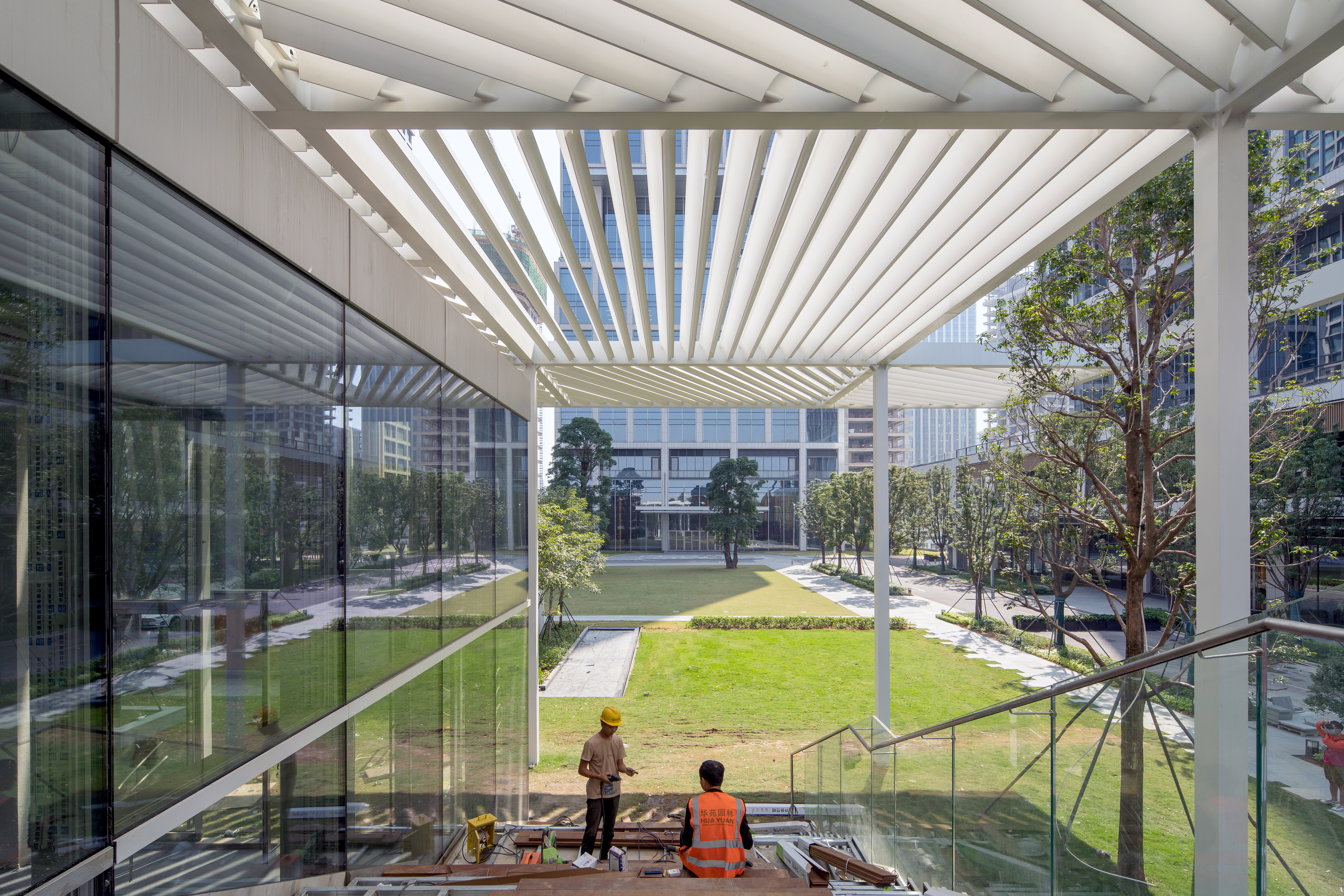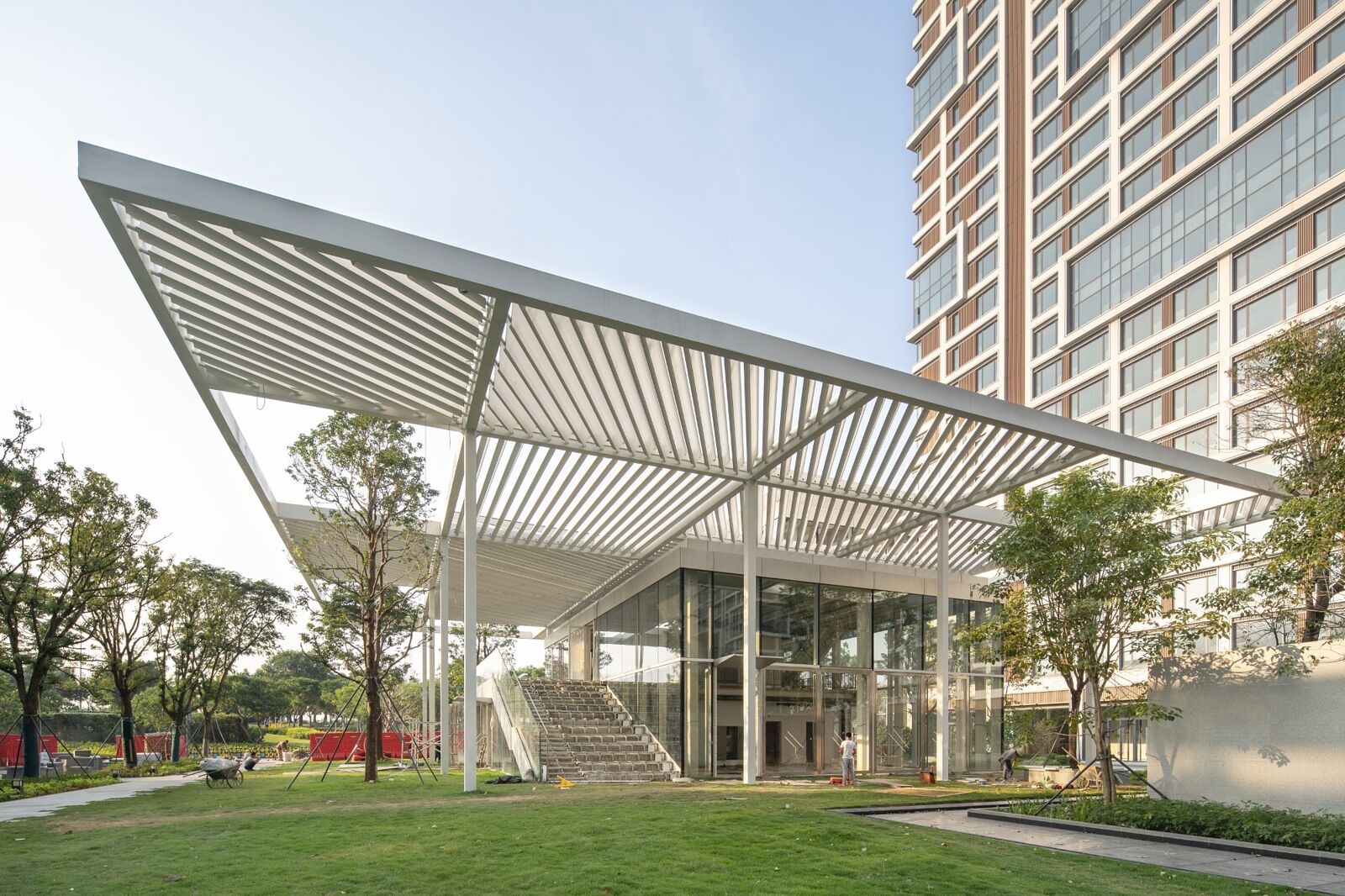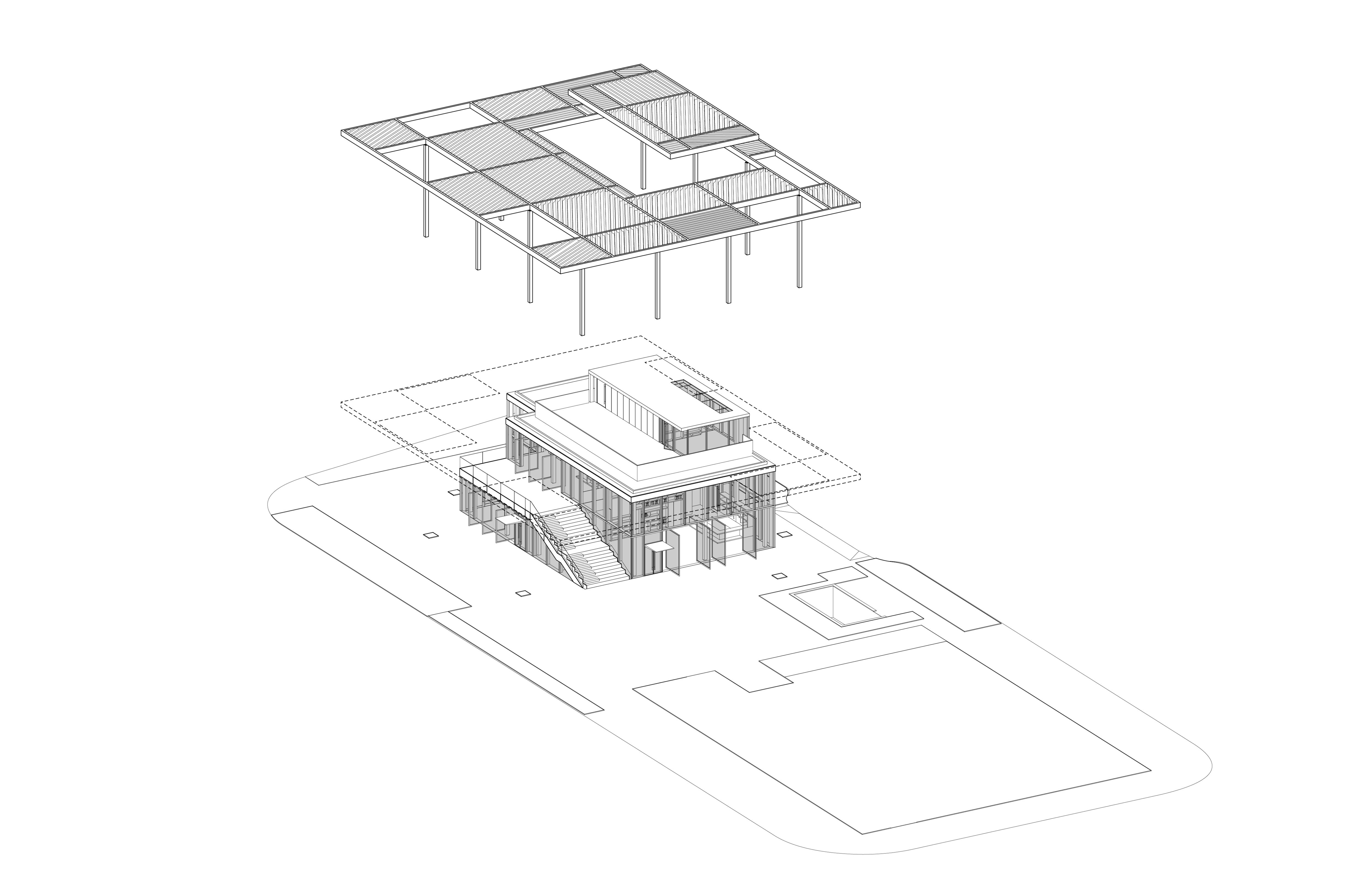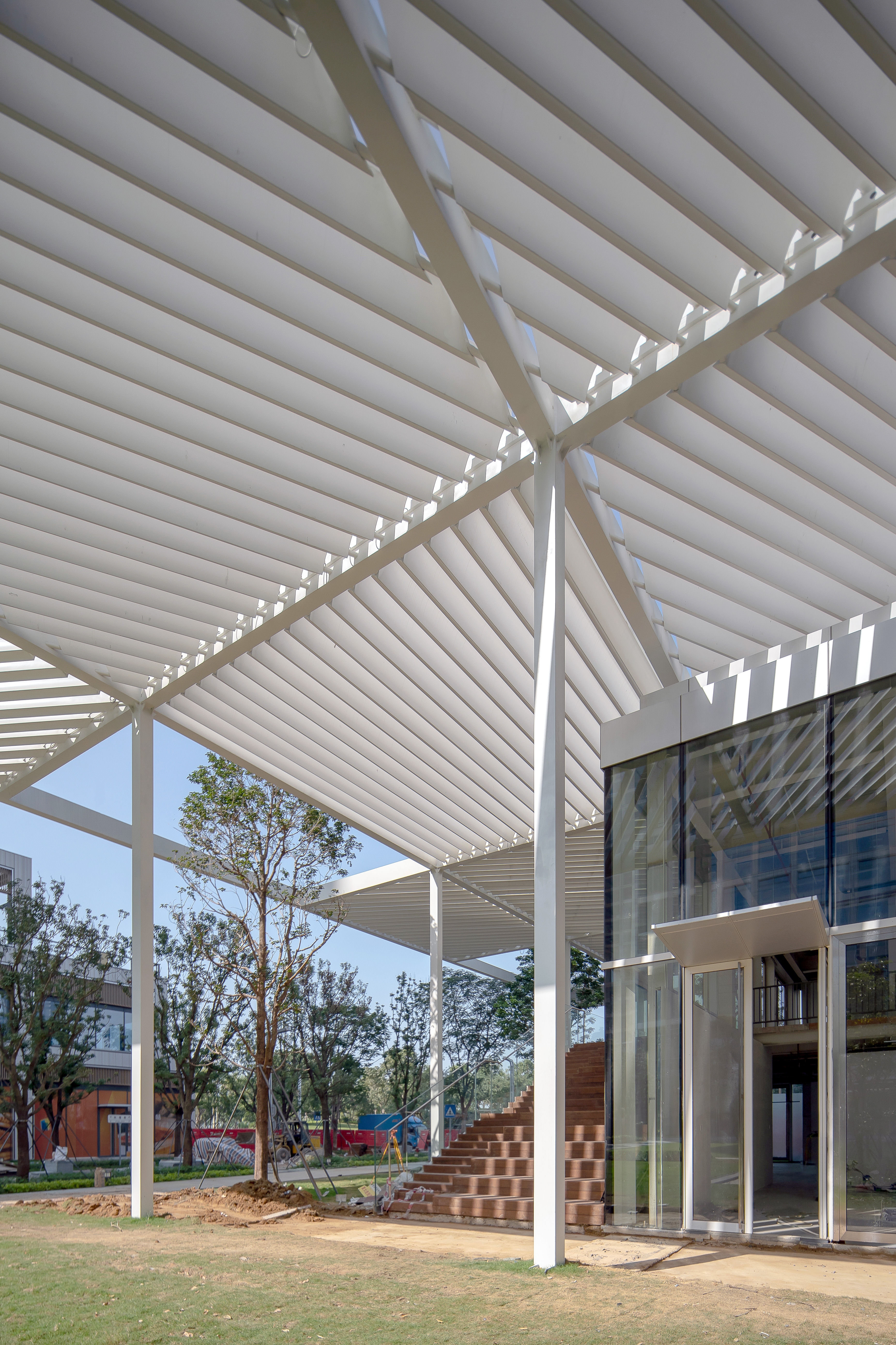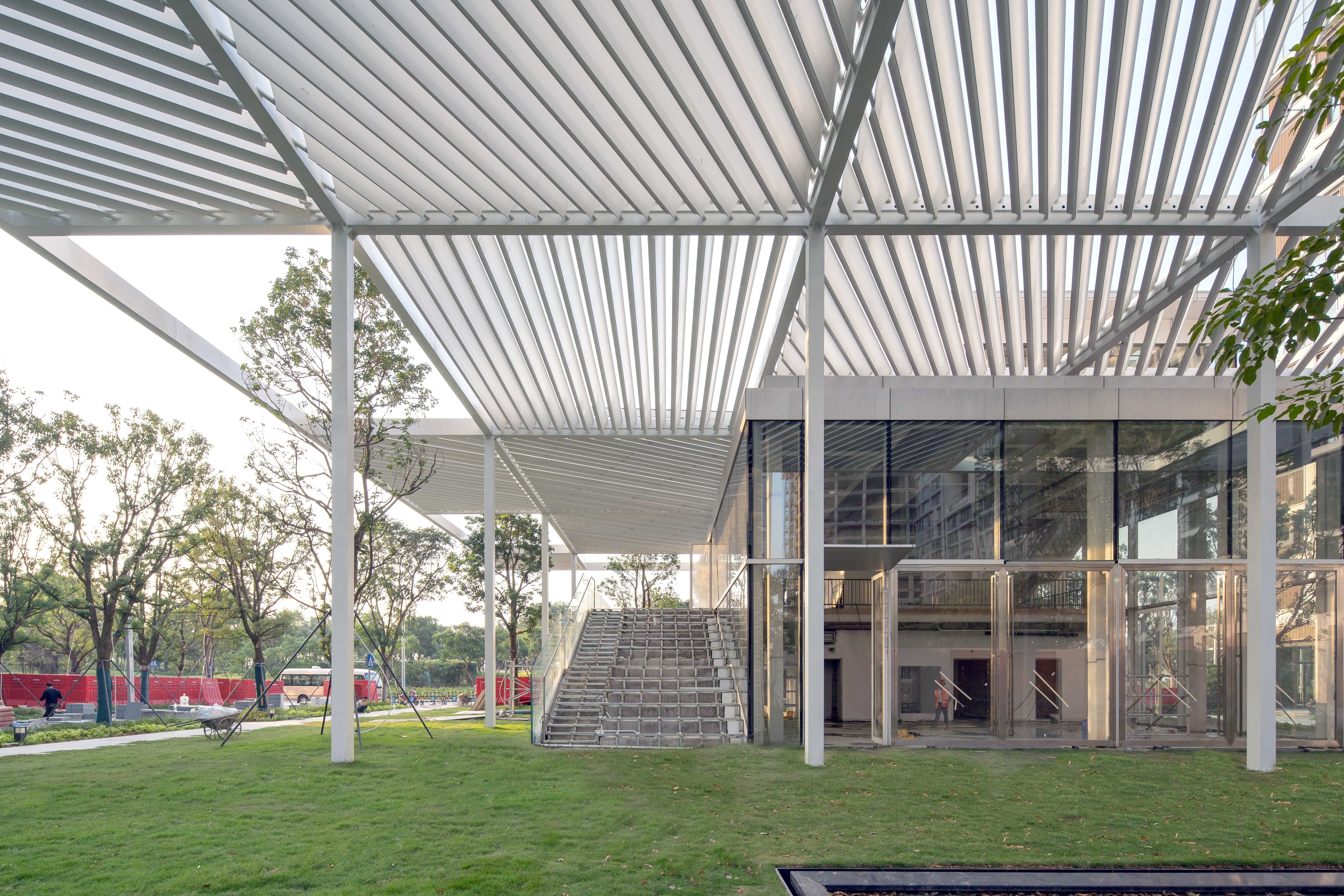 The Qianhai Shade Pavilion sits within a new park surrounded by a large commercial development as part of Shenzhen's third CBD. The Shade Pavilion creates a programmatic amenity for the park, with a cafe, bookstore and event space housed within a small-floorplate building. The design concept for the pavilion is to create a large shaded area much larger than the pavilion itself.