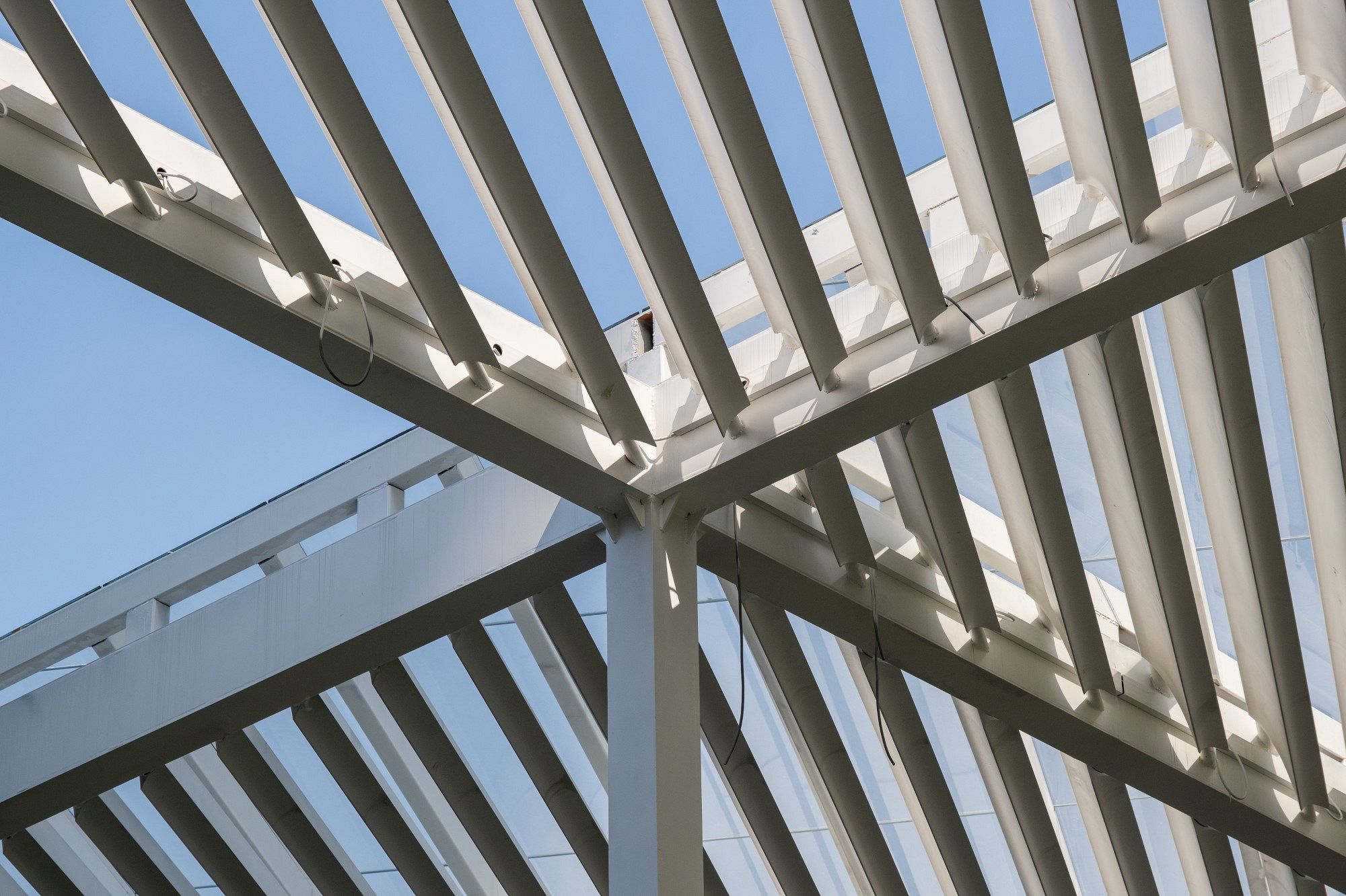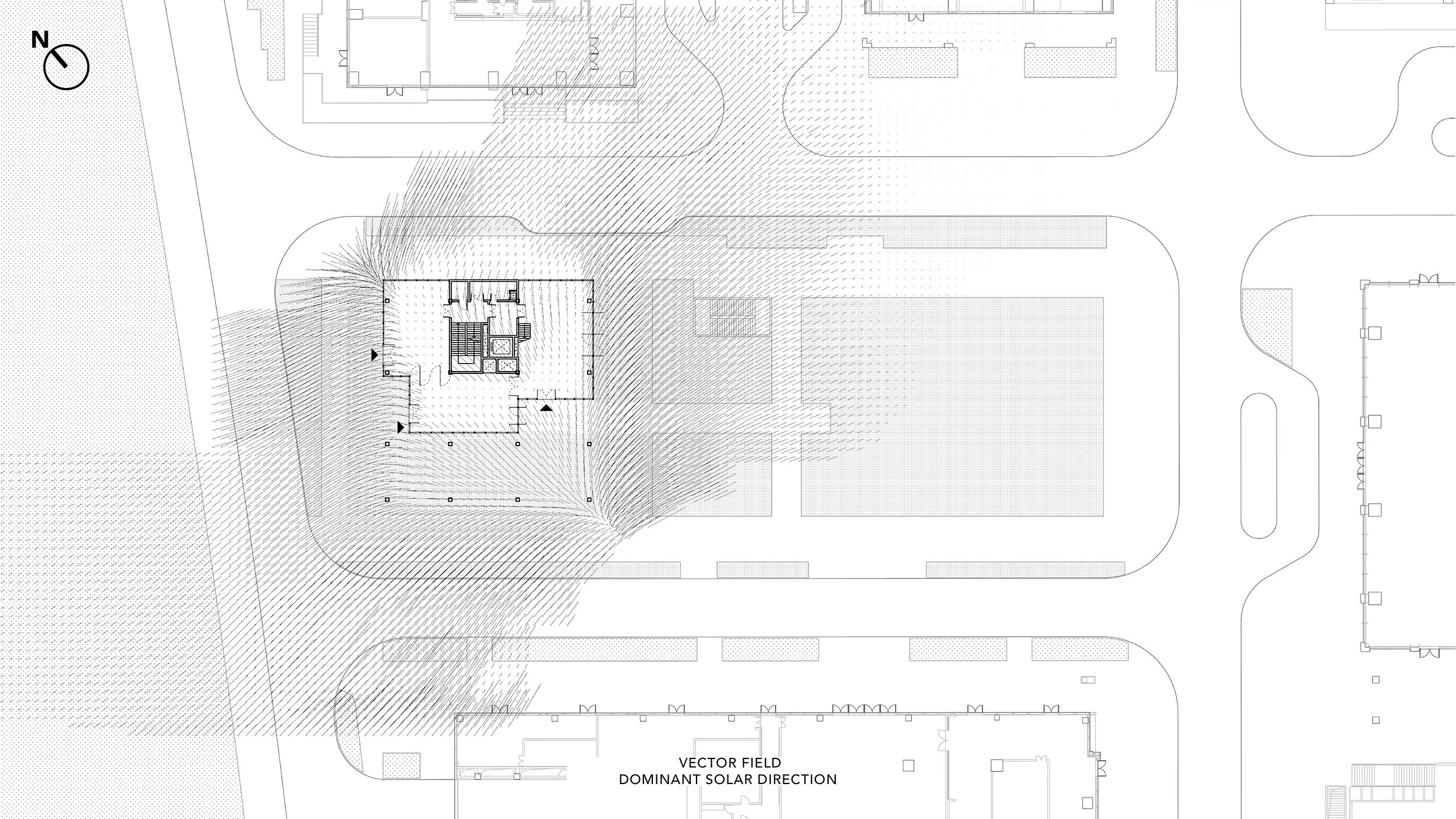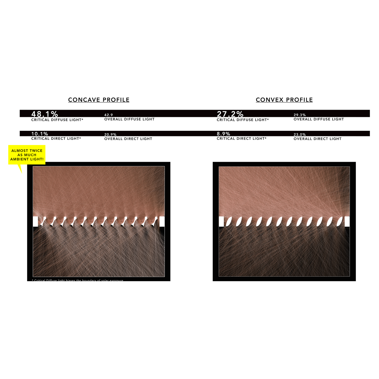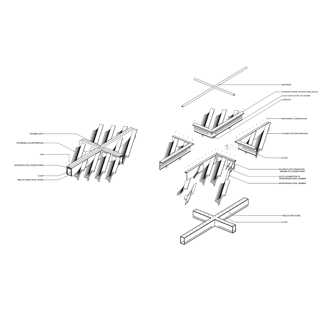 As the building's defining feature, the trellis's function was not only to shade inhabitants below, but also to translate the solar exposure into a perceptual effect. To do this, we designed a concave louver profile to bounce diffuse light without transferring heat. The vast majority of solar heat gain occurs from direct illumination, while subsequent caustic bounces of a given sun ray will transfer visible light with very little heat. Thus the carefully angled louvers of the trellis create a shaded ground plane and illuminated underside.