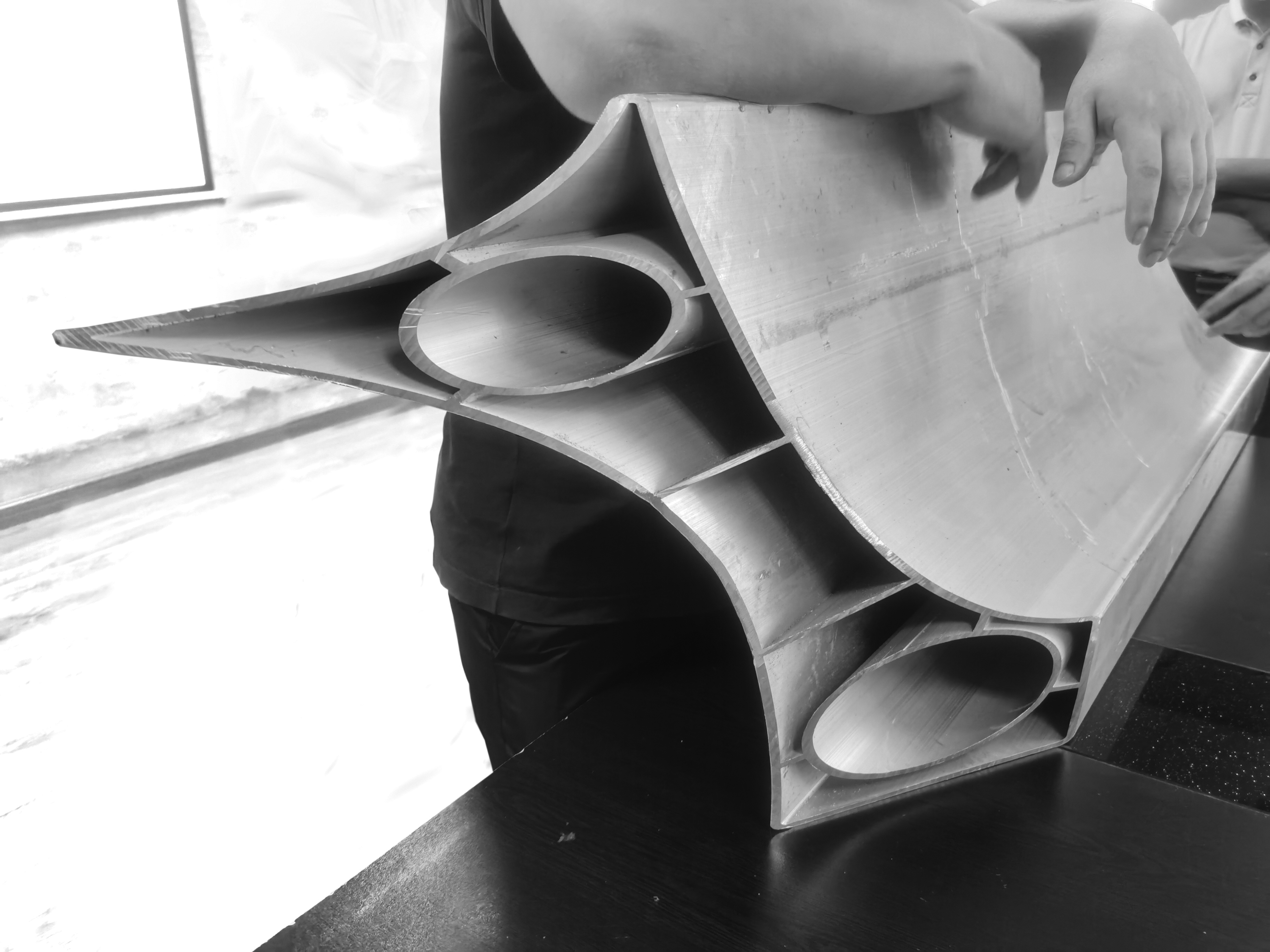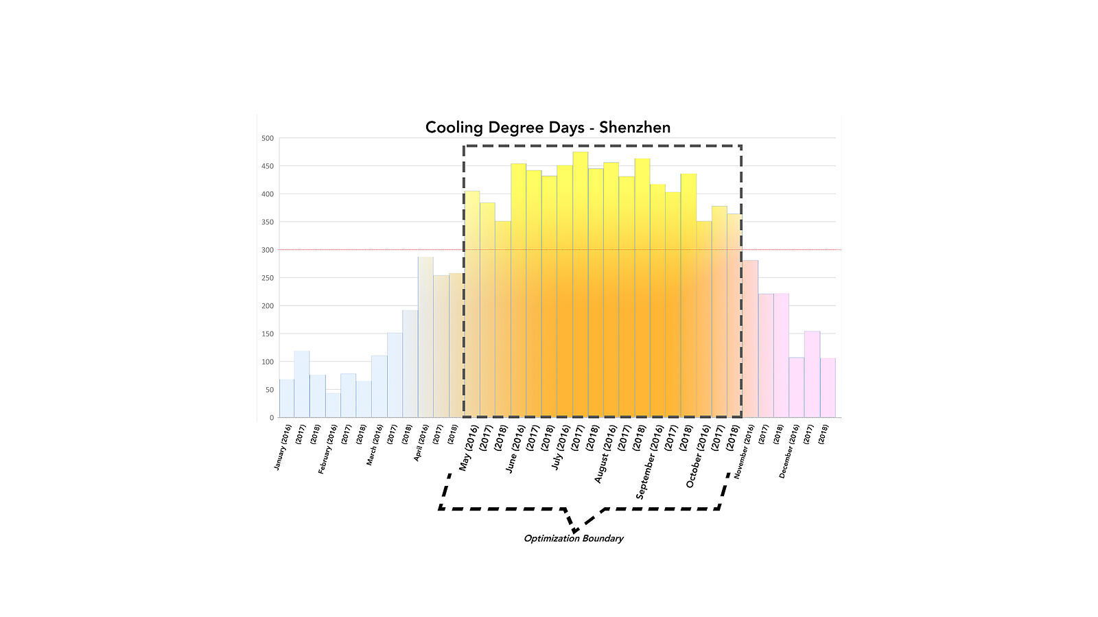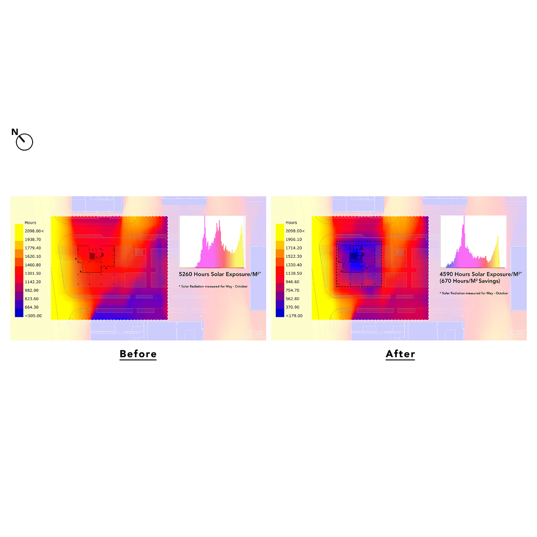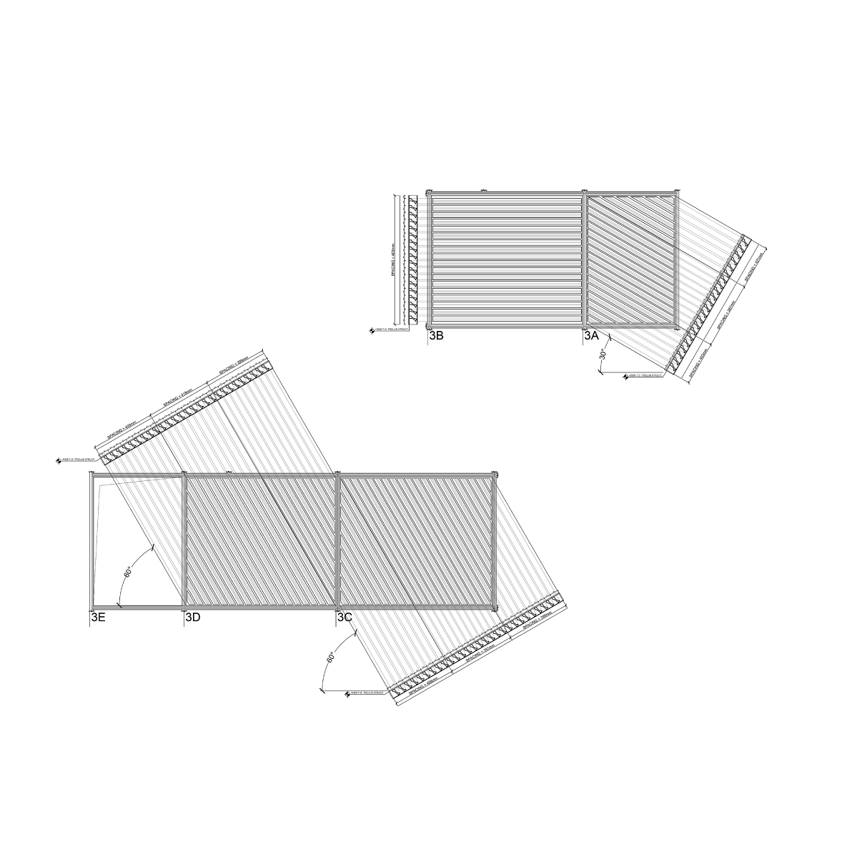 As the building's defining feature, the trellis's function was not only to shade inhabitants below, but also to translate the solar exposure into a perceptual effect. To do this, we designed a concave louver profile to bounce diffuse light without transferring heat. The vast majority of solar heat gain occurs from direct illumination, while subsequent caustic bounces of a given sun ray will transfer visible light with very little heat. Thus the carefully angled louvers of the trellis create a shaded ground plane and illuminated underside.
