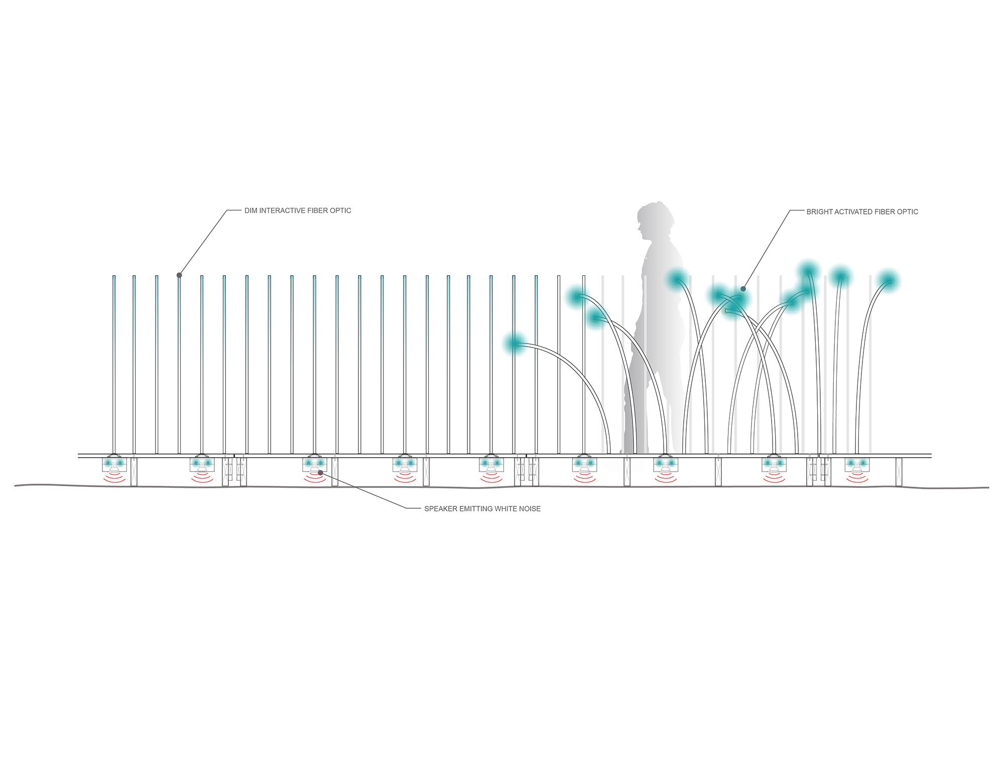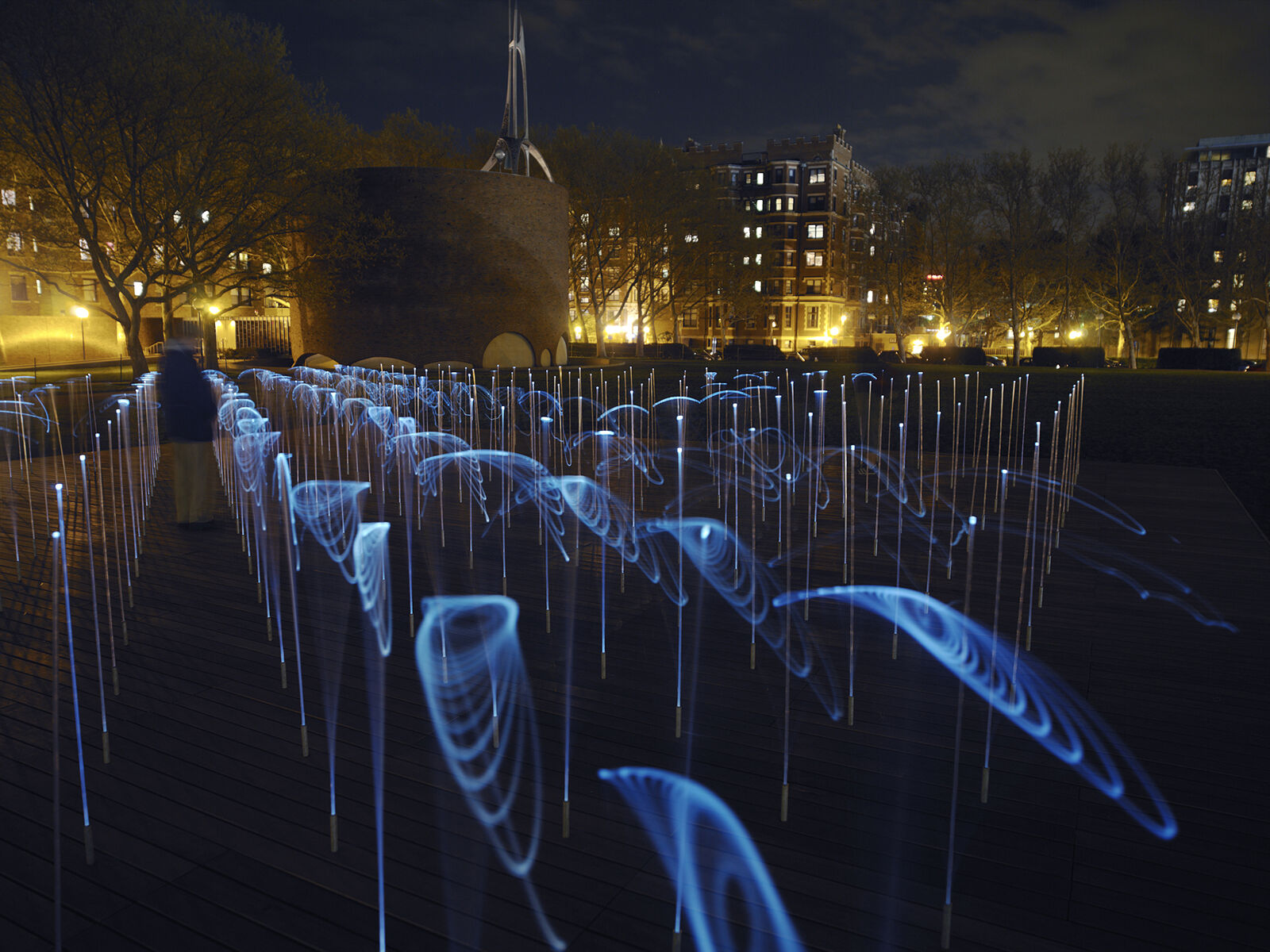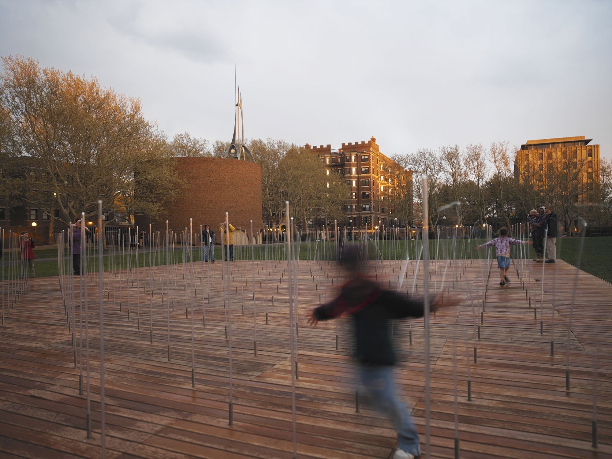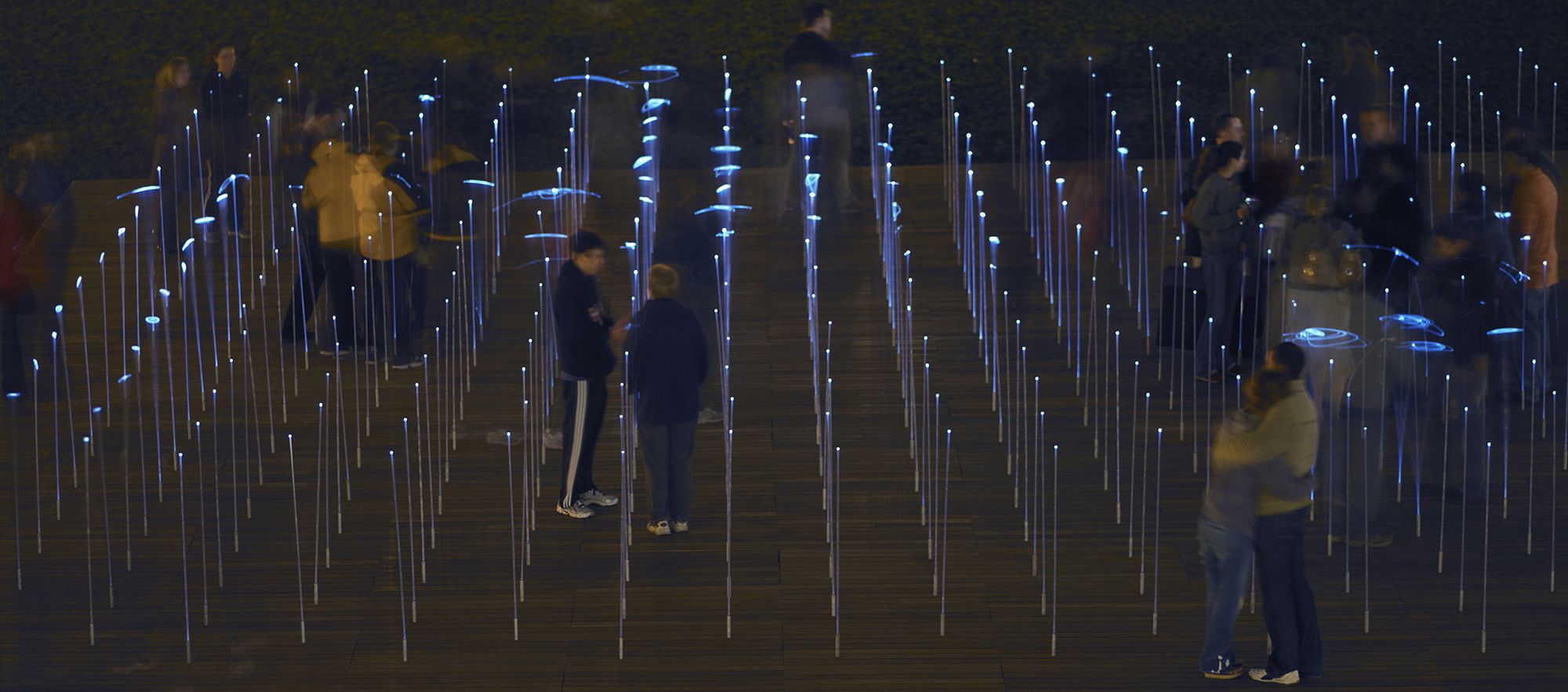Comprised of a 50' x 50' grid of fiber optics and speakers, "White Noise/White Light" is an interactive sound and light field that responds to the movement of people as they walk through it. What appears at first to be a static, neutral and transparent grid of vertical markers dissolves into a luminous sound-scape by night. As pedestrians enter into the fiber optic field their presence and movement are traced by each stalk unit, transmitting white light from LEDs and white noise from speakers below.