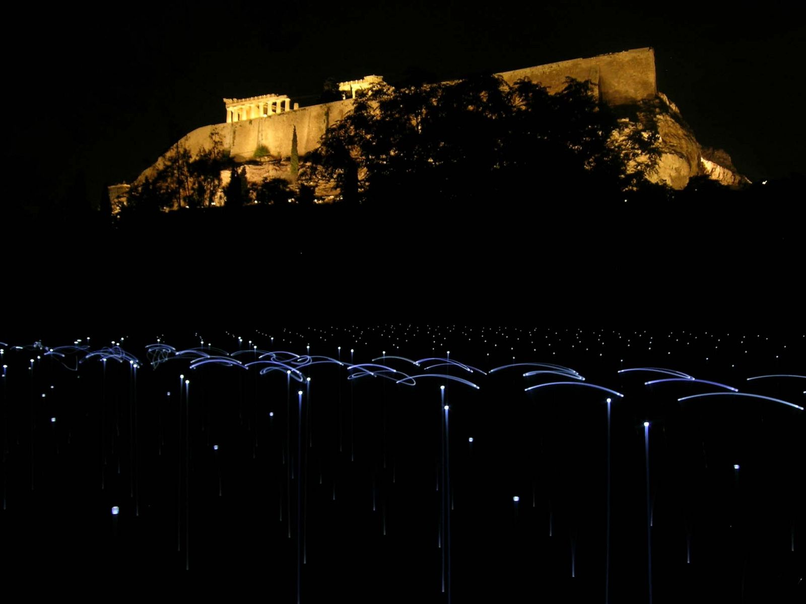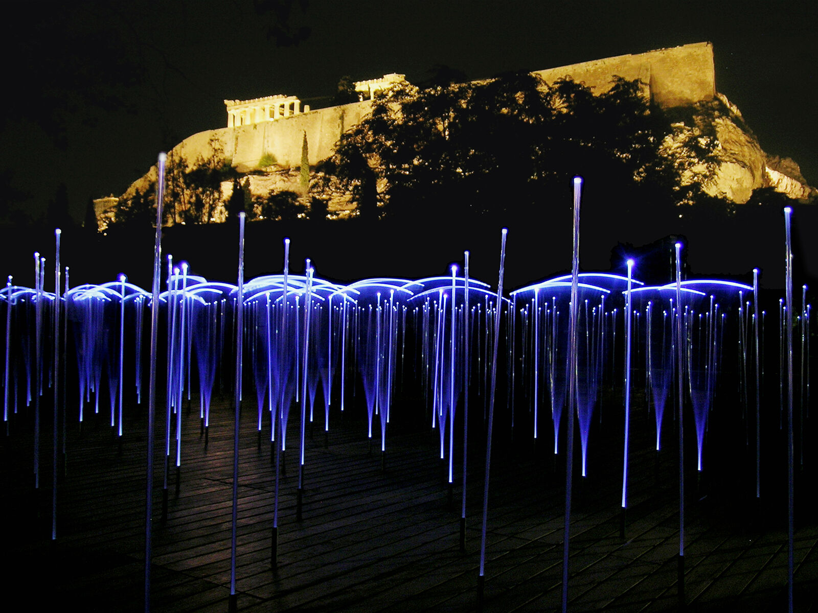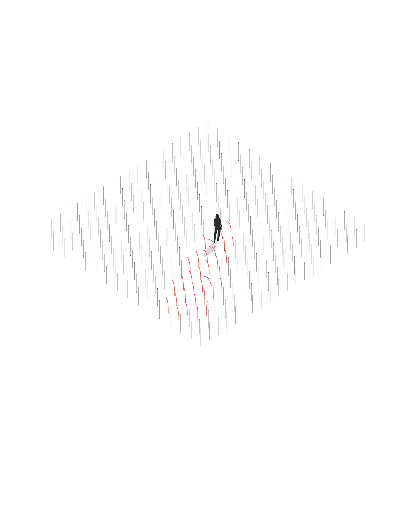 Comprised of a 50' x 50' grid of fiber optics and speakers, "White Noise/White Light" is an interactive sound and light field that responds to the movement of people as they walk through it. What appears at first to be a static, neutral and transparent grid of vertical markers dissolves into a luminous sound-scape by night. As pedestrians enter into the fiber optic field their presence and movement are traced by each stalk unit, transmitting white light from LEDs and white noise from speakers below.