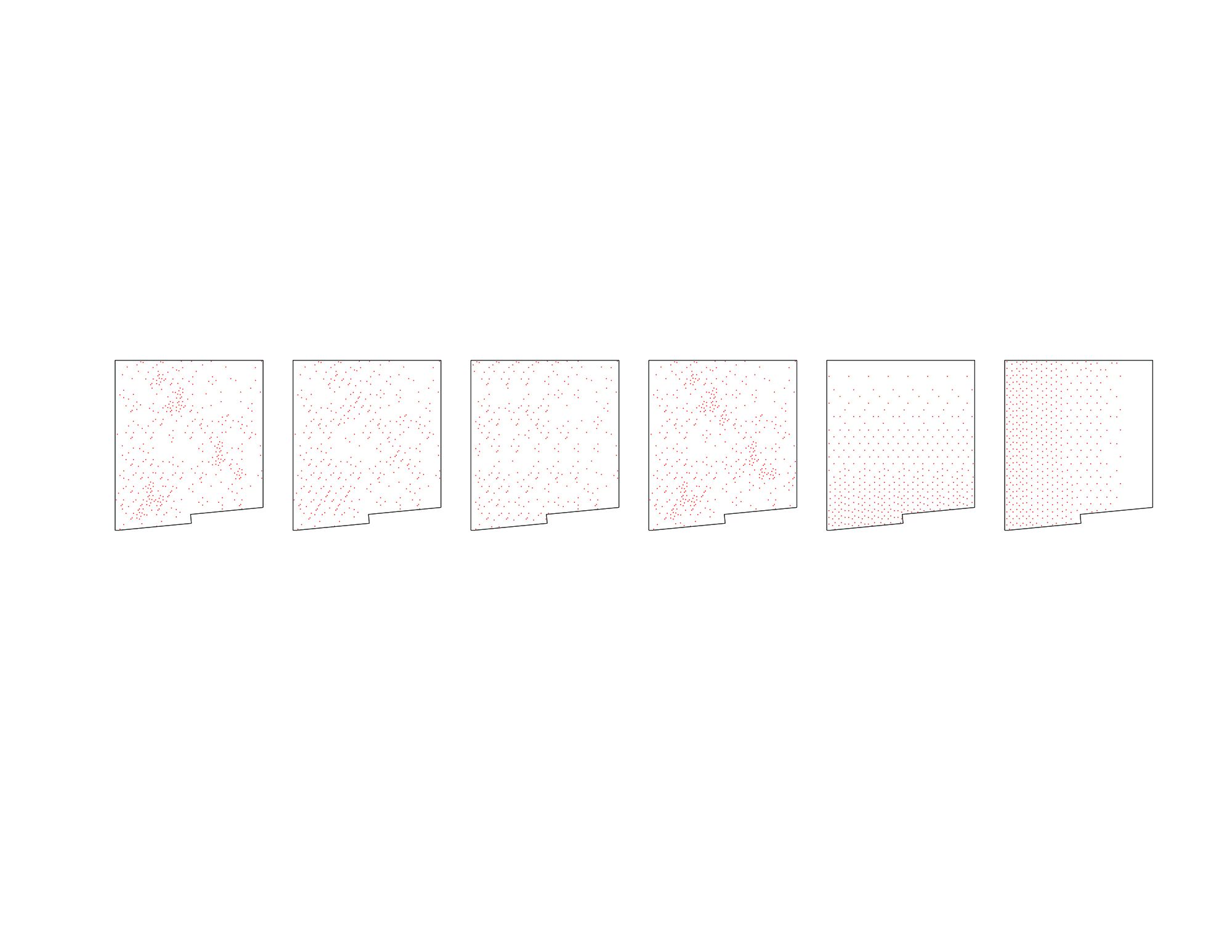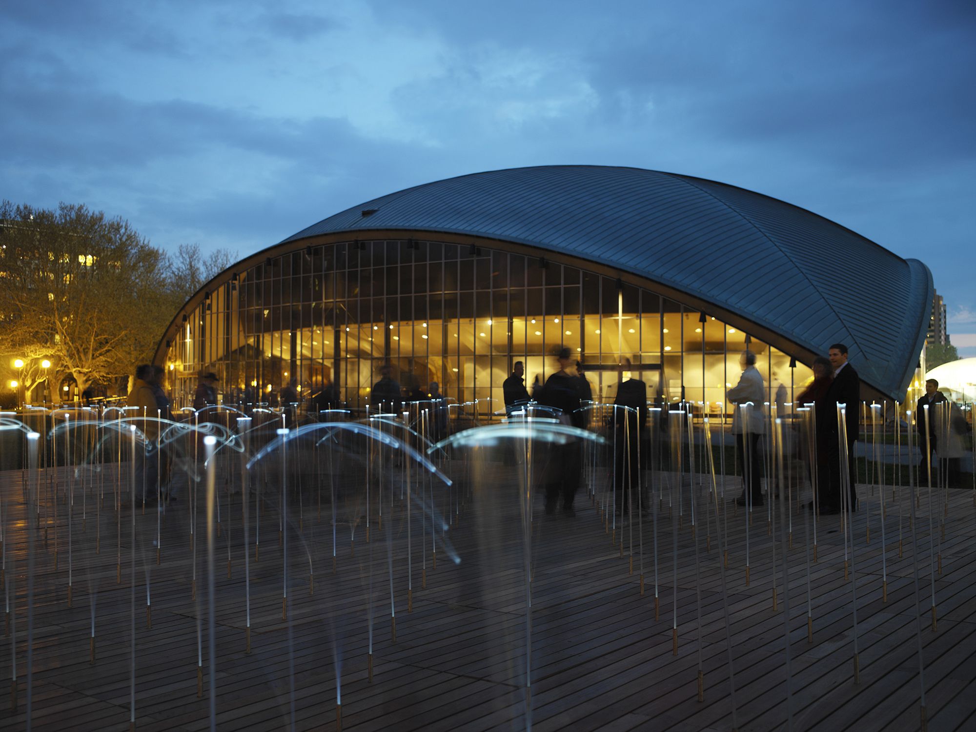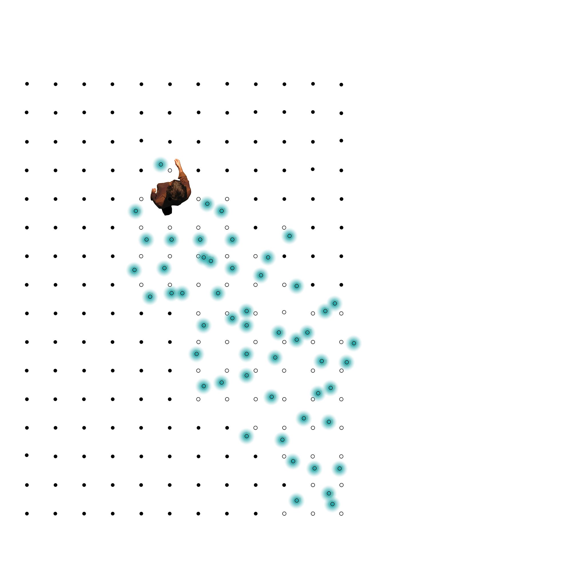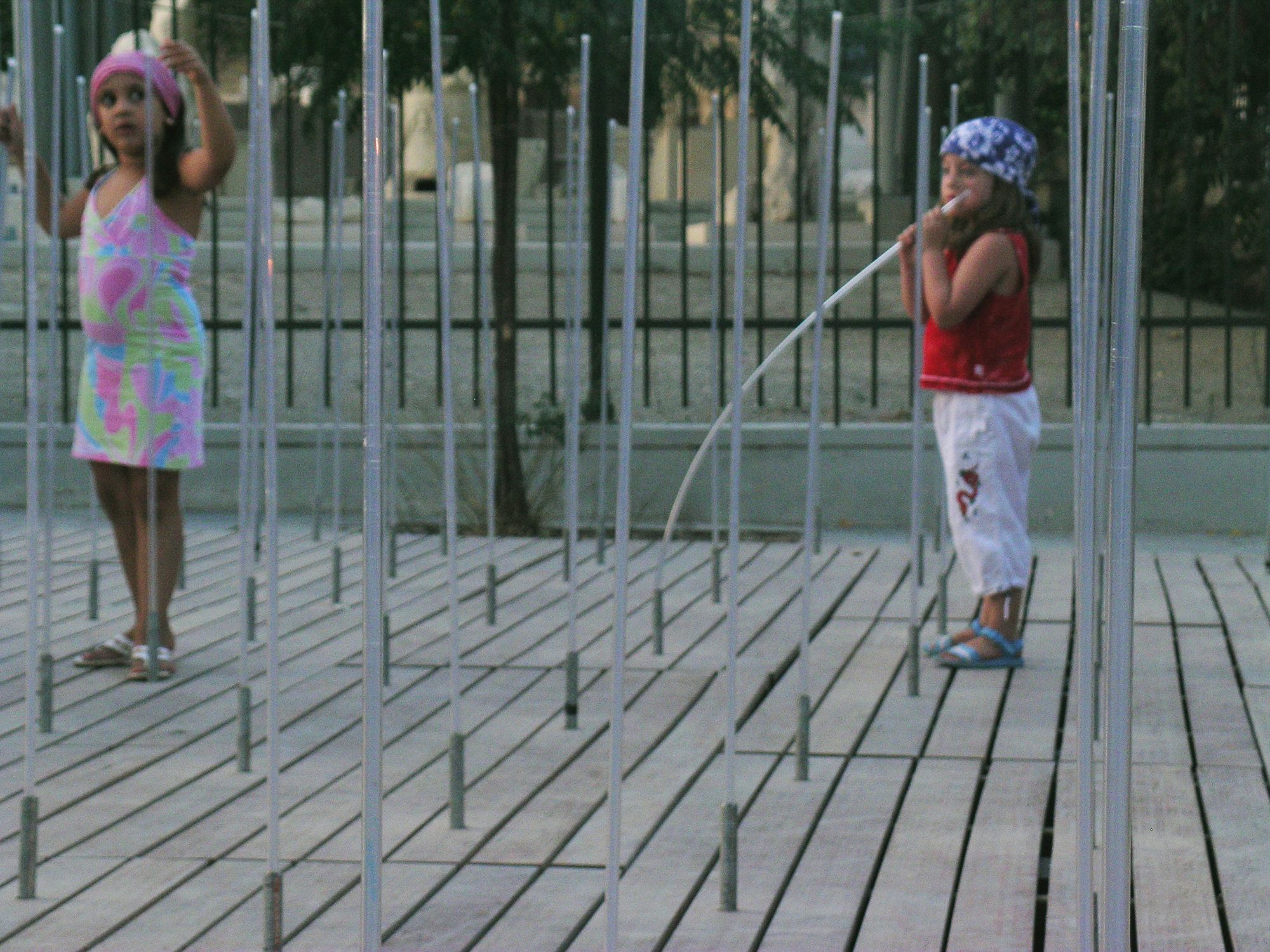 Comprised of a 50' x 50' grid of fiber optics and speakers, "White Noise/White Light" is an interactive sound and light field that responds to the movement of people as they walk through it. What appears at first to be a static, neutral and transparent grid of vertical markers dissolves into a luminous sound-scape by night. As pedestrians enter into the fiber optic field their presence and movement are traced by each stalk unit, transmitting white light from LEDs and white noise from speakers below.