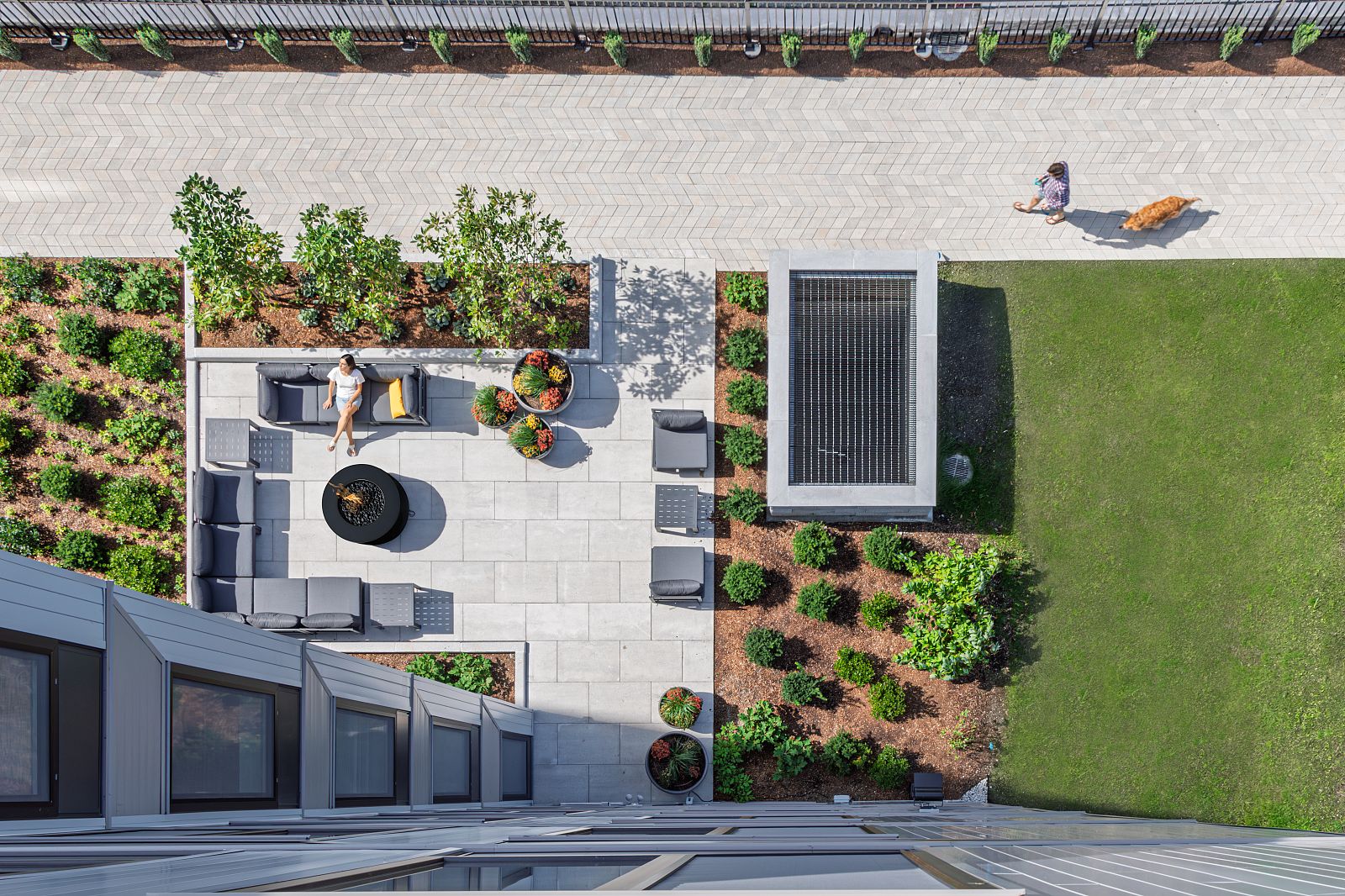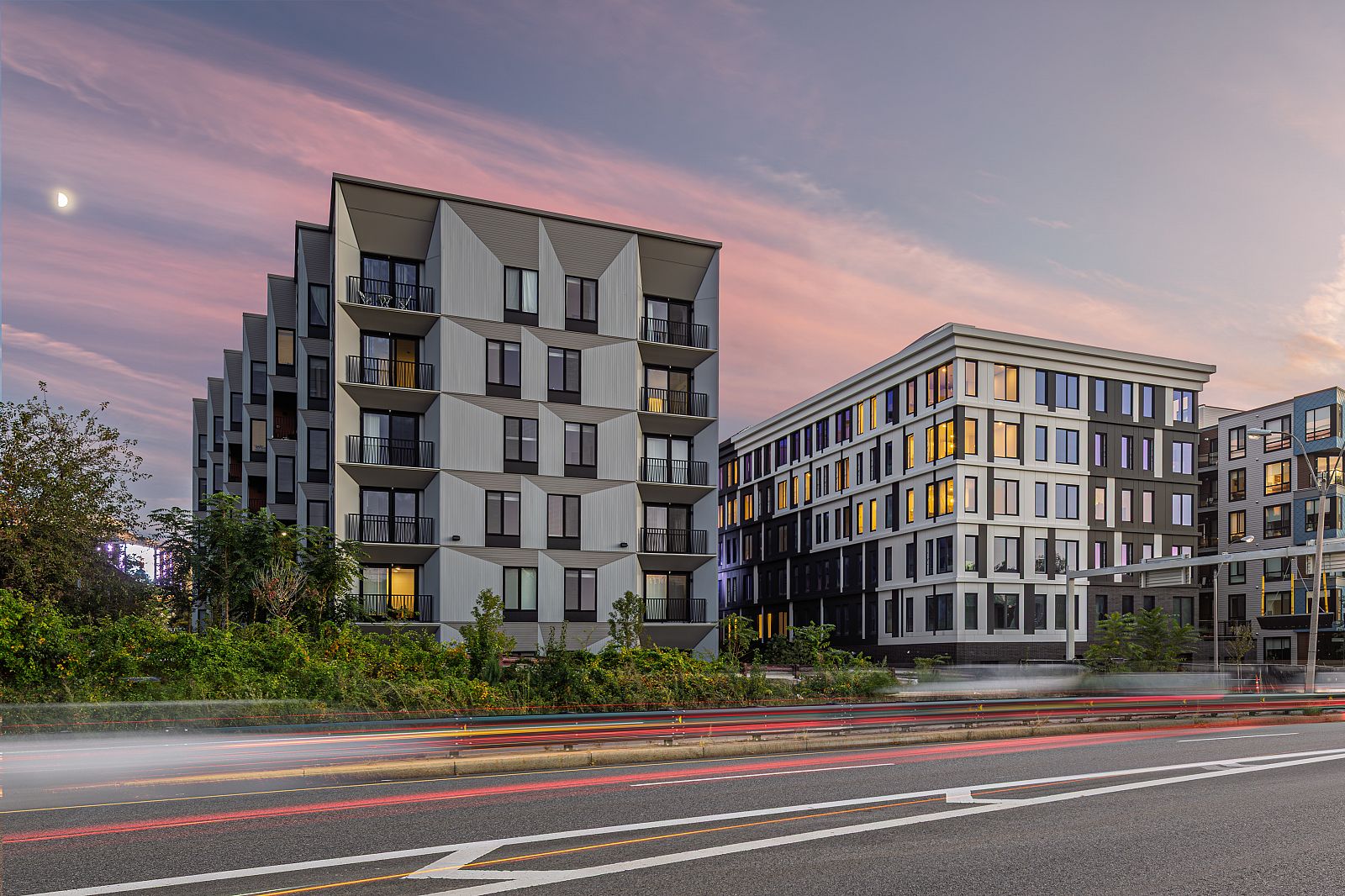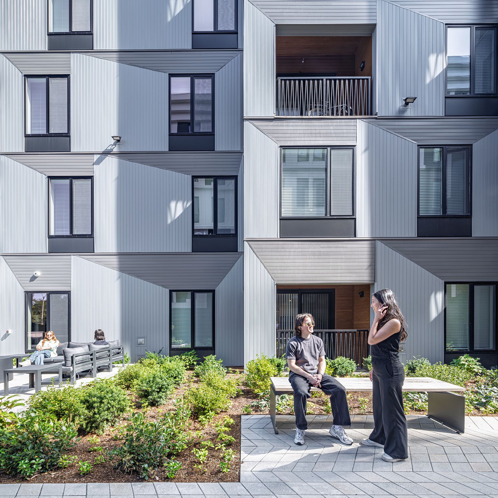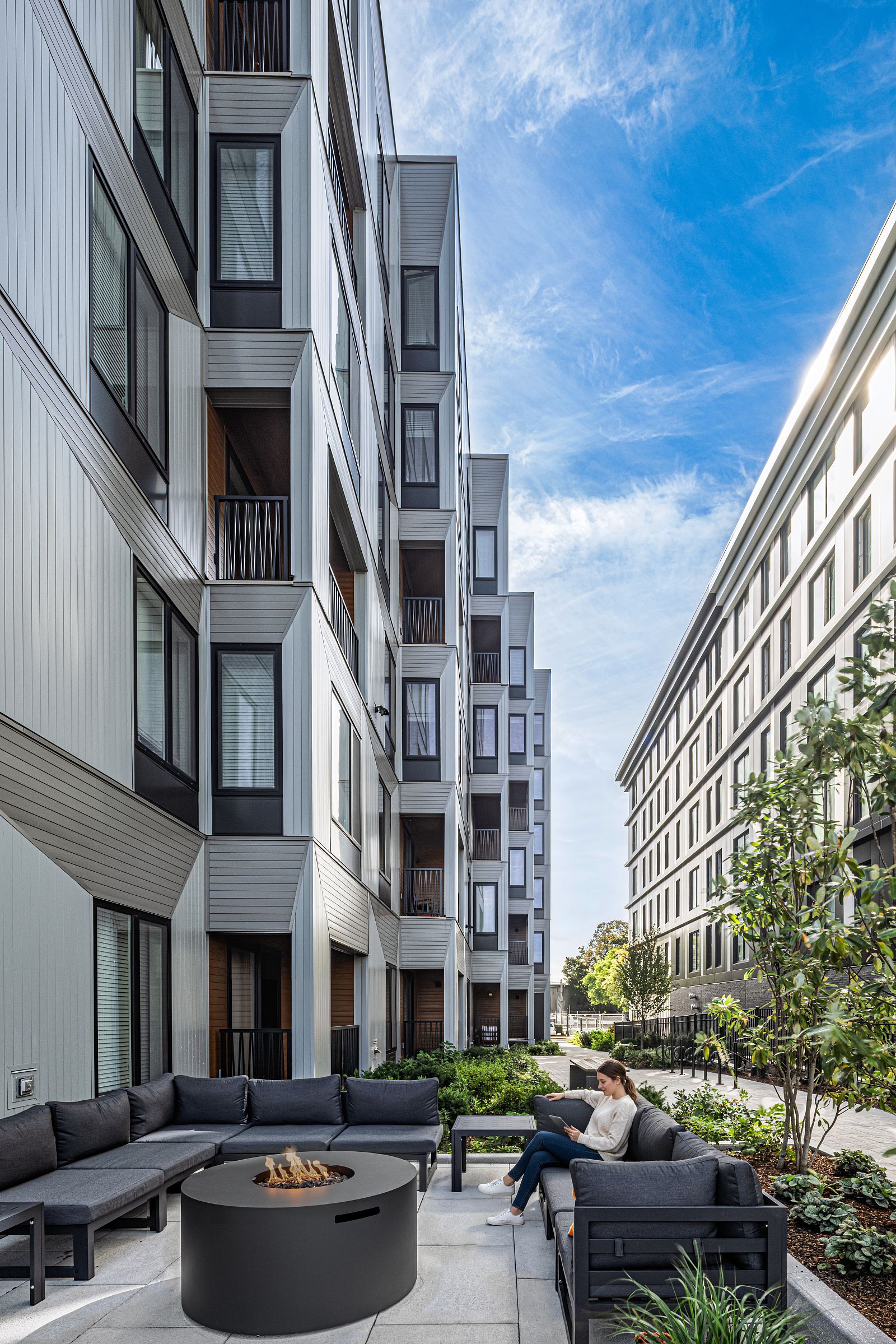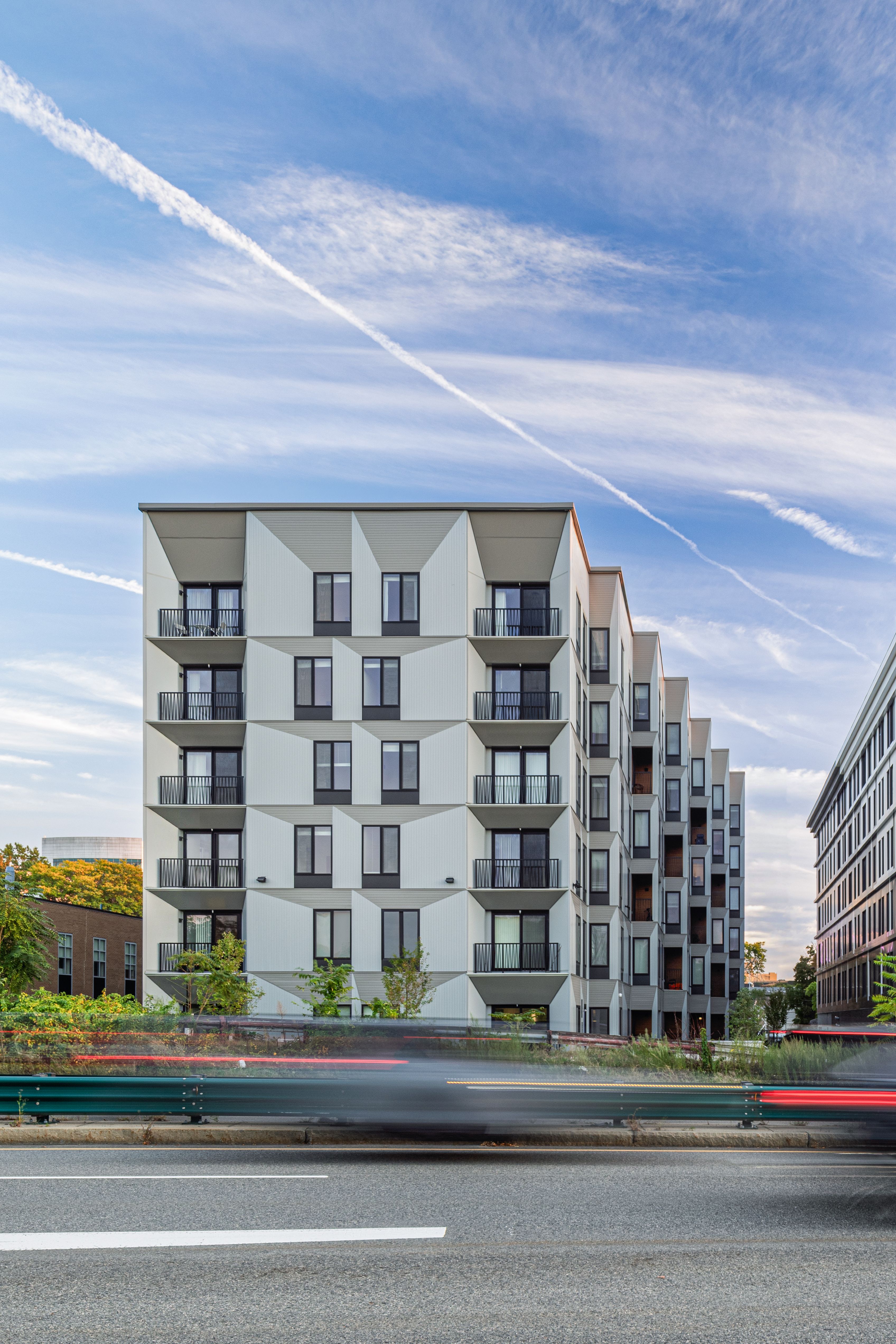 The tapering massing facilitates outdoor amenity spaces on each side of the building, including a public path that connects residents to the network of walkways along the river. These outdoor areas also serve to buffer the project from future development on adjacent parcels. In addition to an outdoor amenity deck, the roof of the project contains a solar PV array and the project is investigating a path towards Passive House certification.