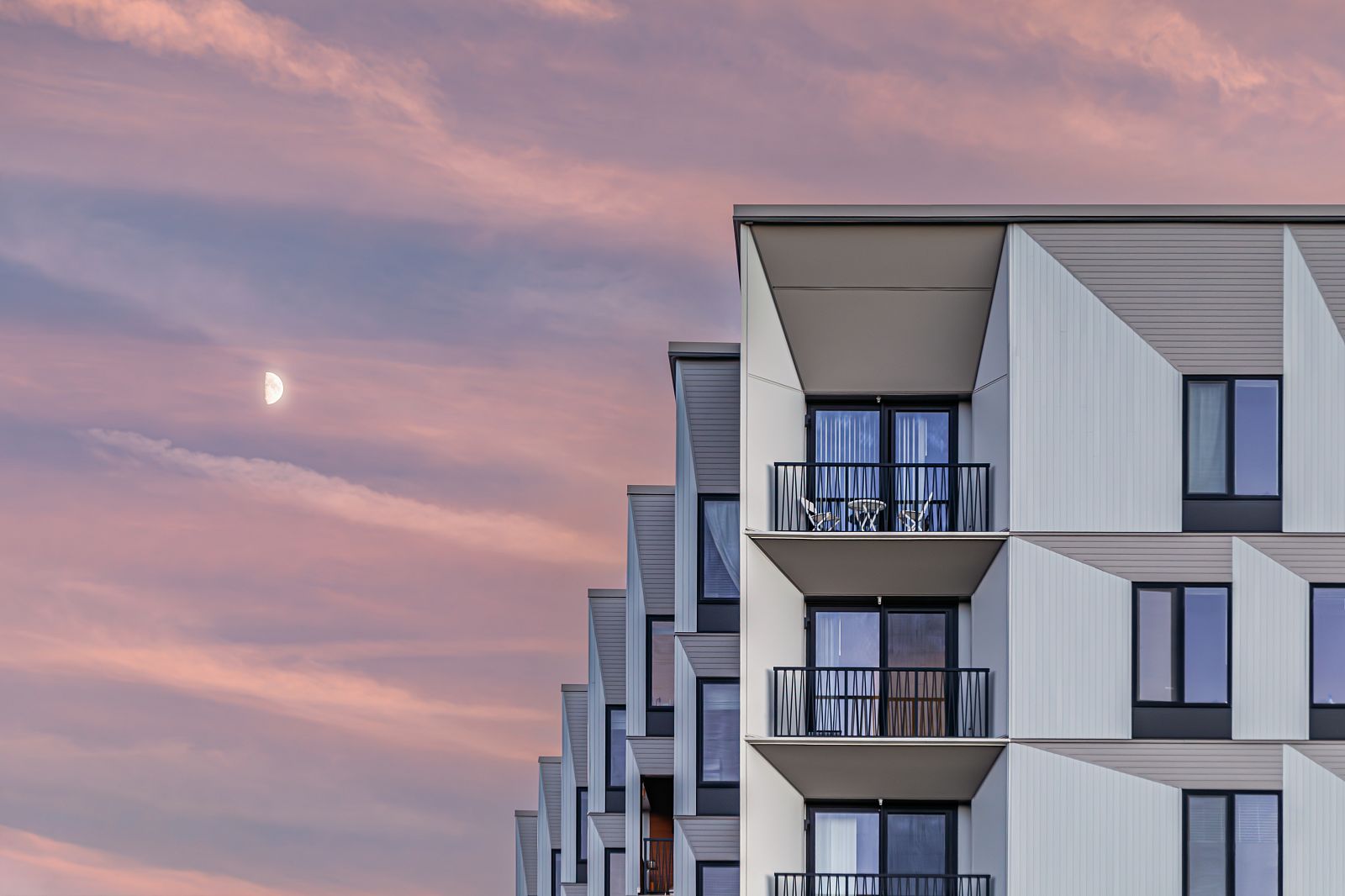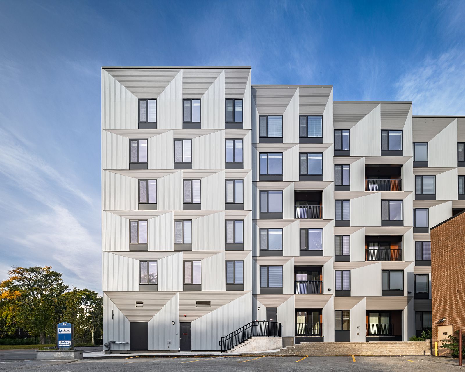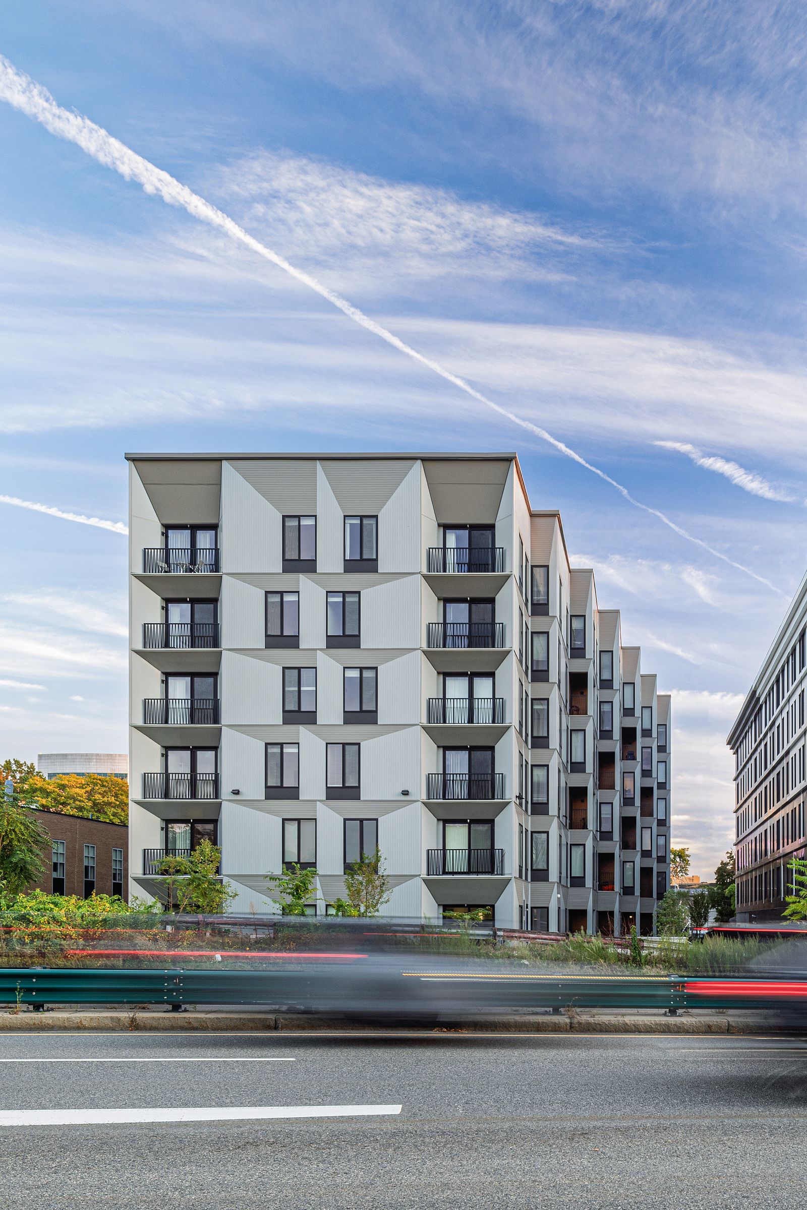 The distinctive massing steps in plan towards the river, producing outside corners and balconies at each unit bay down the long elevations. The “prow” of the building facing the river is thickened to contain generous unit balconies.