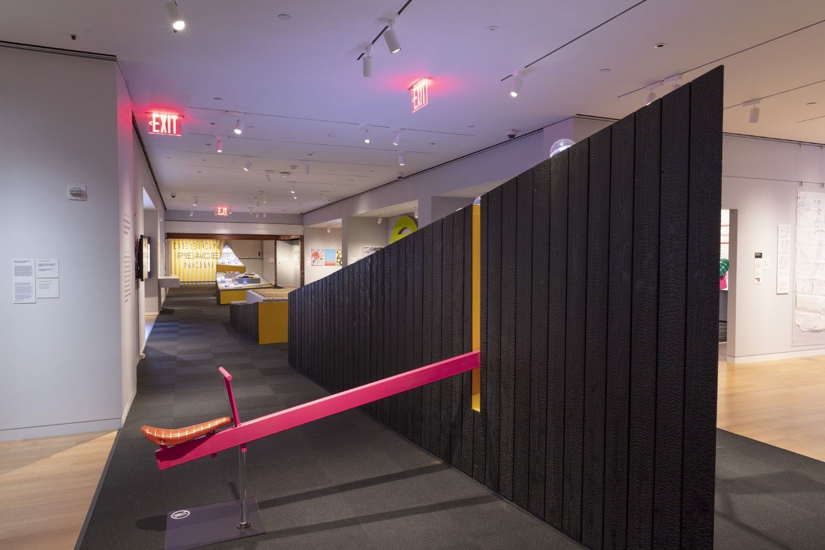 As one moves through the gallery, the central figure organizes the exhibition by channeling movement and orchestrating views between galleries. The prow-like shape is at once a wall, display armature, and place for seating. Playing with changing perceptions, it divides the galleries, then brings them back together, appearing as a tall thin wall, then a low thick volume.