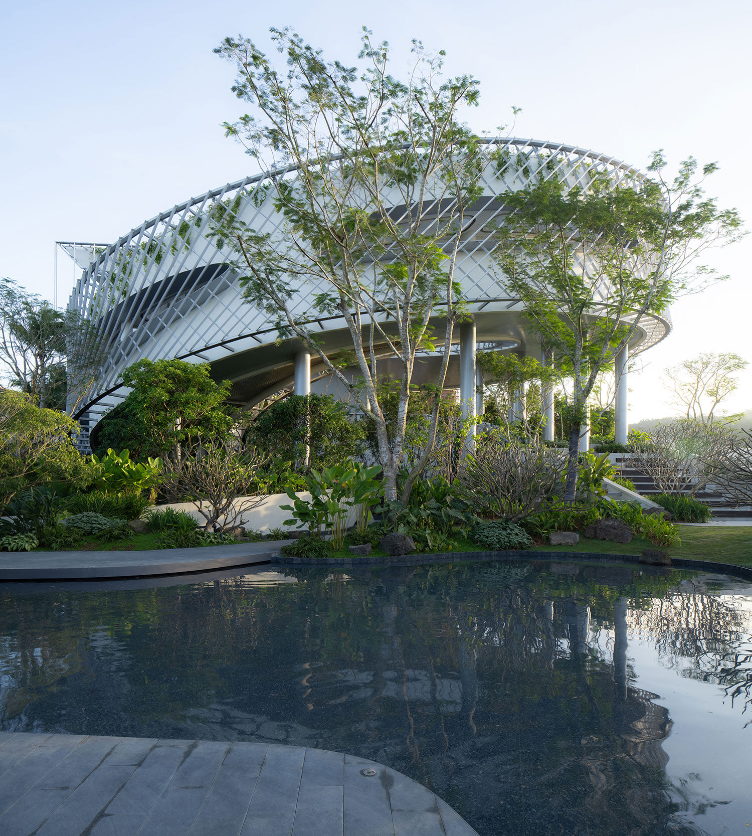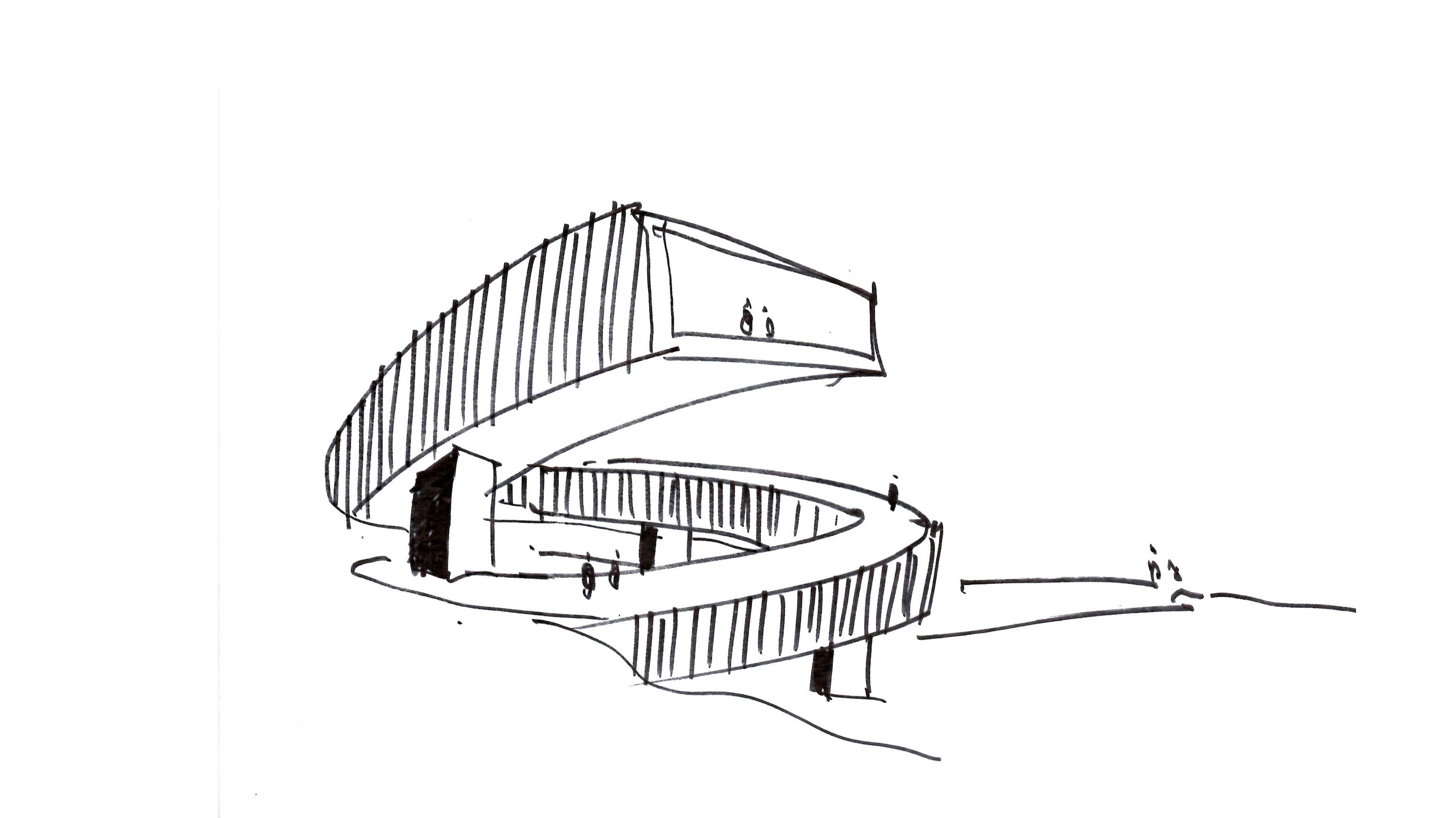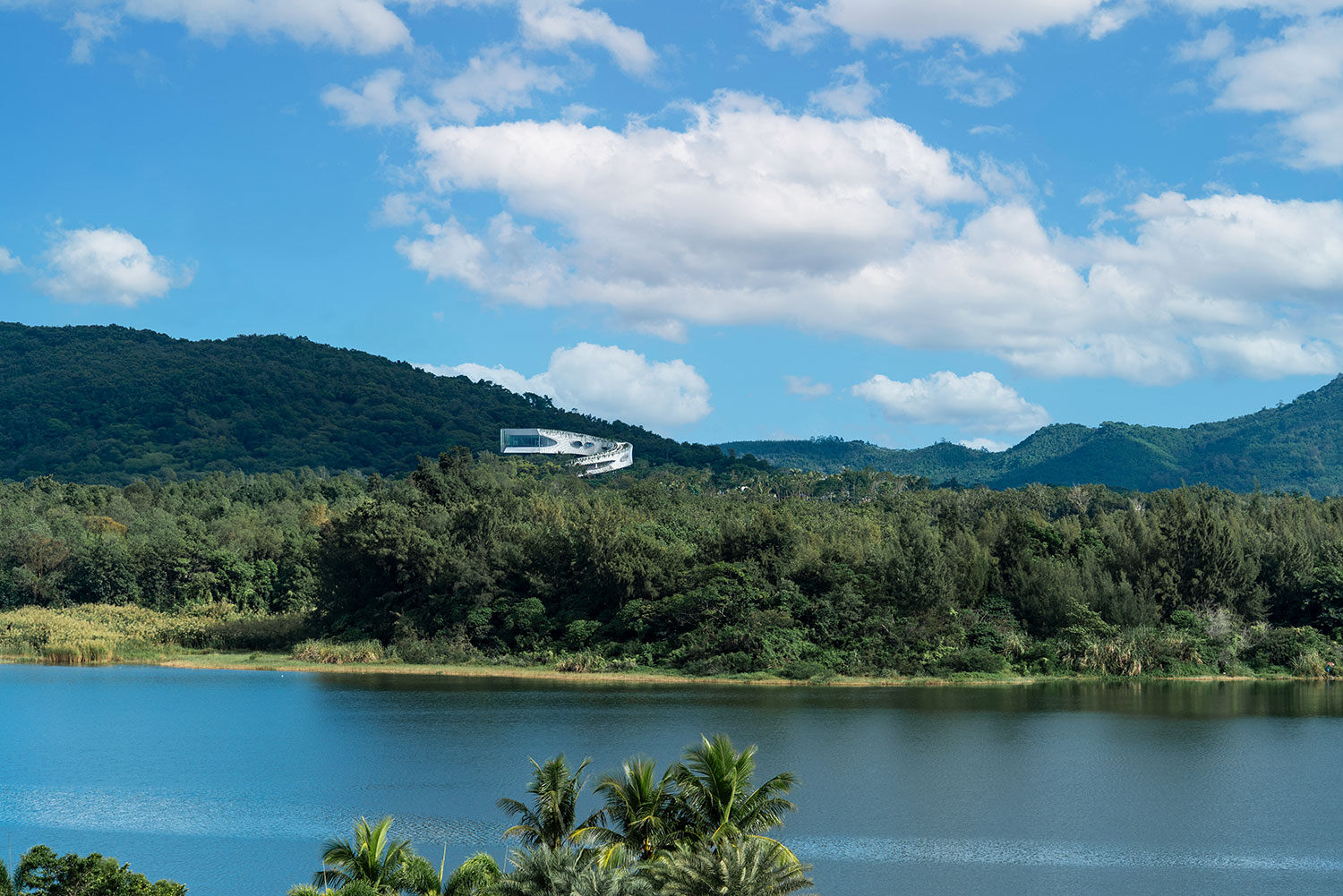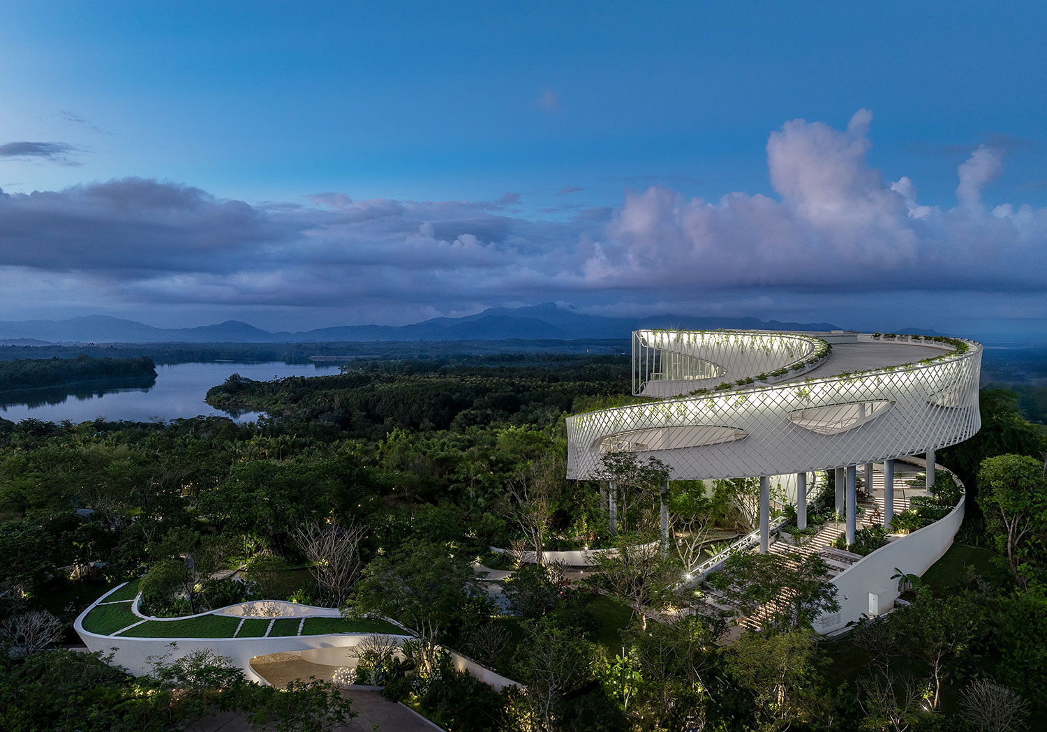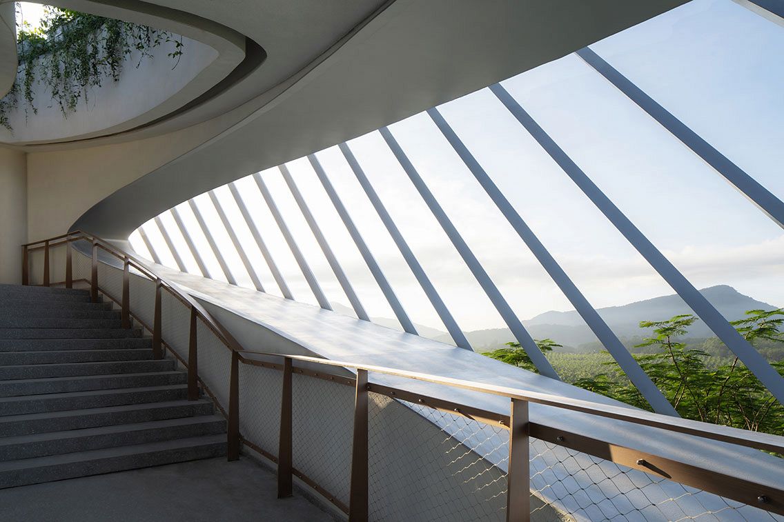 Located at the highest point of a hilly site in Wanning, Hainan, China, Helical Landing (also called the Billow Museum) is a centerpiece for a new residential development project. The building serves as a viewing pavilion and a community center, allowing residents to survey their surroundings from the large exhibition hall at the end of the coil.