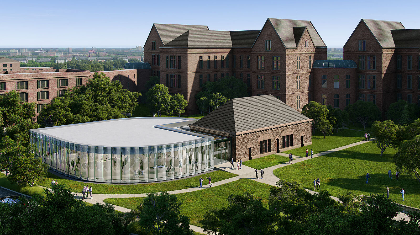 The new LACB pavilion has been conceived in conversation with two of the great historical figures in American architecture: H.H. Richardson and F.L. Olmsted. The building is conceived as a “mirage”, with a unique system of 18’ tall scalloped glass panels that accentuate Richardson’s historic masonry structure, and function as an “optical device” that gradually reveals Olmsted’s rhythmic landscape.