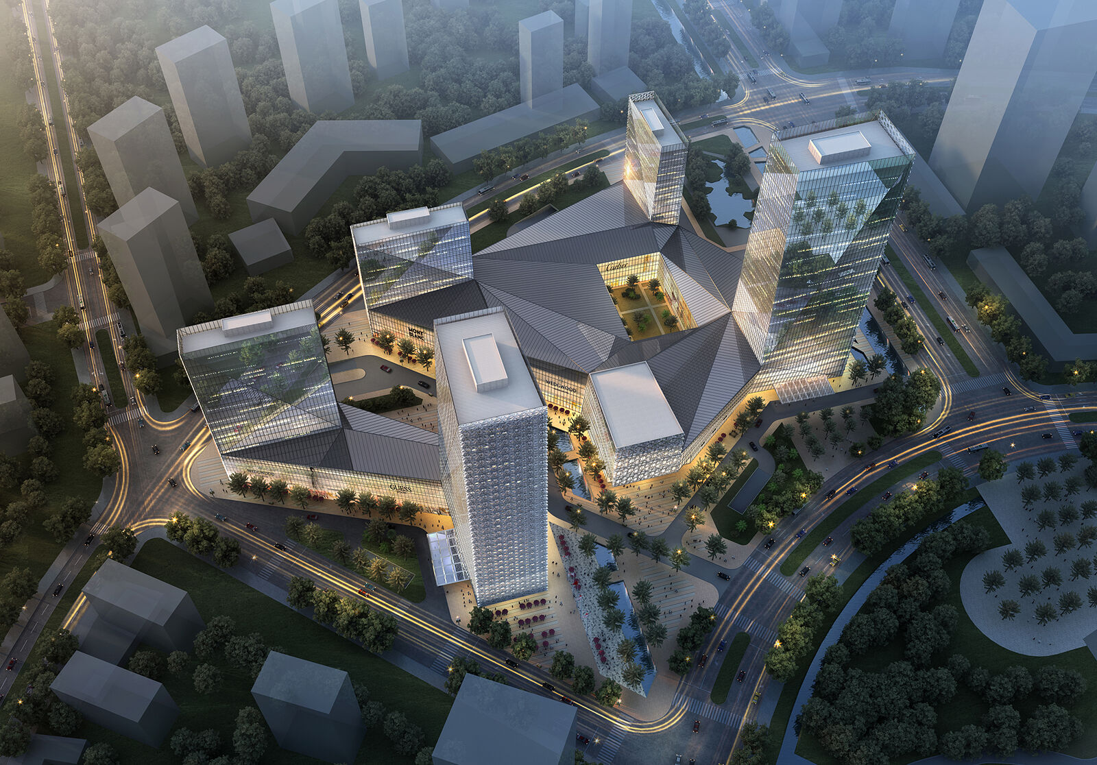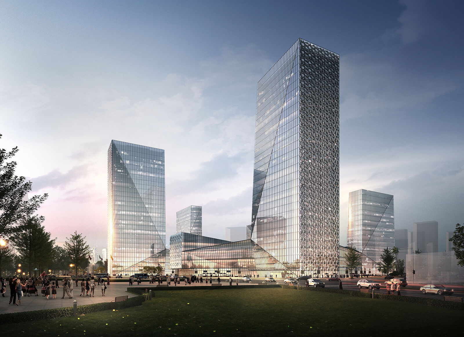 This competition for a 2.2 million square foot mixed use complex in Yinchuan, China proposes four towers arranged in a pin-wheel pattern around a central courtyard. The podium footprint is derived from the footprints of the towers, and a language of folded plates ties the podium and towers together.