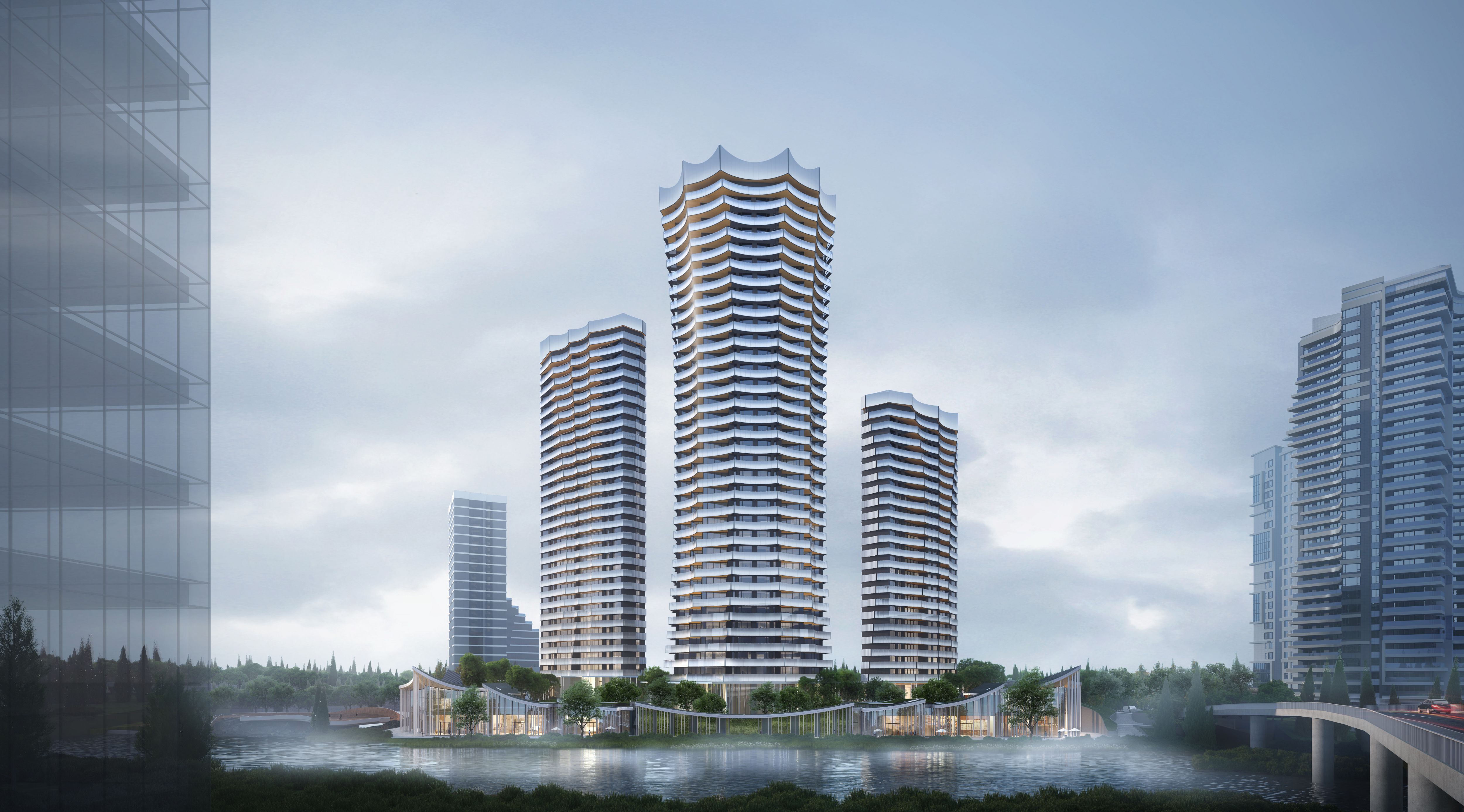 Situated within the greater Luxlakes development in Chengdu, China, Parcel C25 is a residential neighborhood that offers a diverse array of retail, residential, and leisure programs. The design of the three residential towers prioritizes views of the surrounding water, with scalloped balconies that extend the living space and sculpt the distinguished forms of each tower. Each floor contains two spacious units that offer multiple view points and access to the outdoors. The scalloped exterior design is both functional and expressive, optimizing the use of occupiable space and providing visual interest.