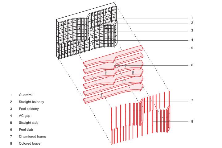 Located in Hainan Province of Southern China, the Solar Veil proposes an architecturally expressive residential envelope design calibrated to the subtropical local climate. All units in this 9-story building benefit from outdoor balconies that extend living spaces and create solar shading. The saw-toothed slab edge varies, forming multistory bay window projections that appear to peel open and create the impression of a rippling facade. Framing uninhibited views away from the neighboring buildings, the bay windows offer residents of each unit a generous shaded outdoor space.