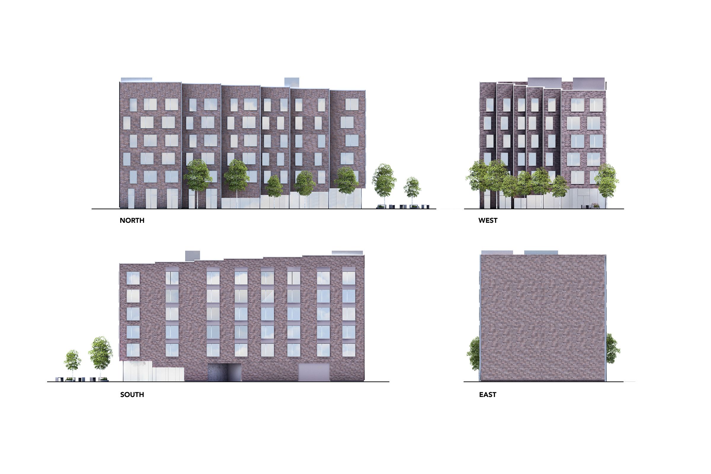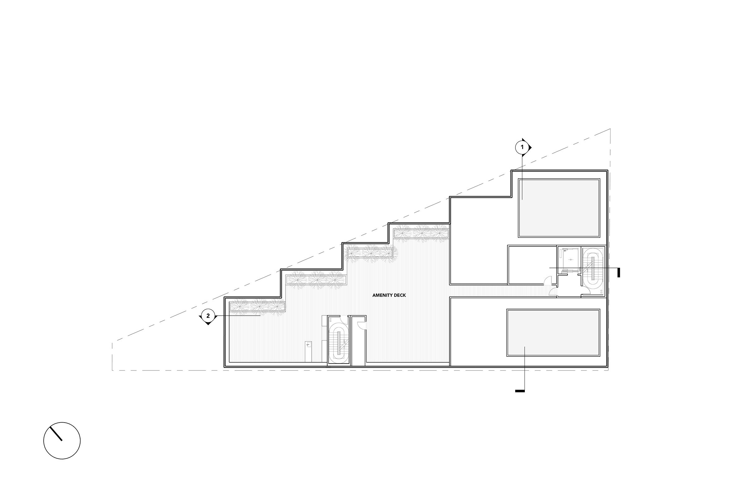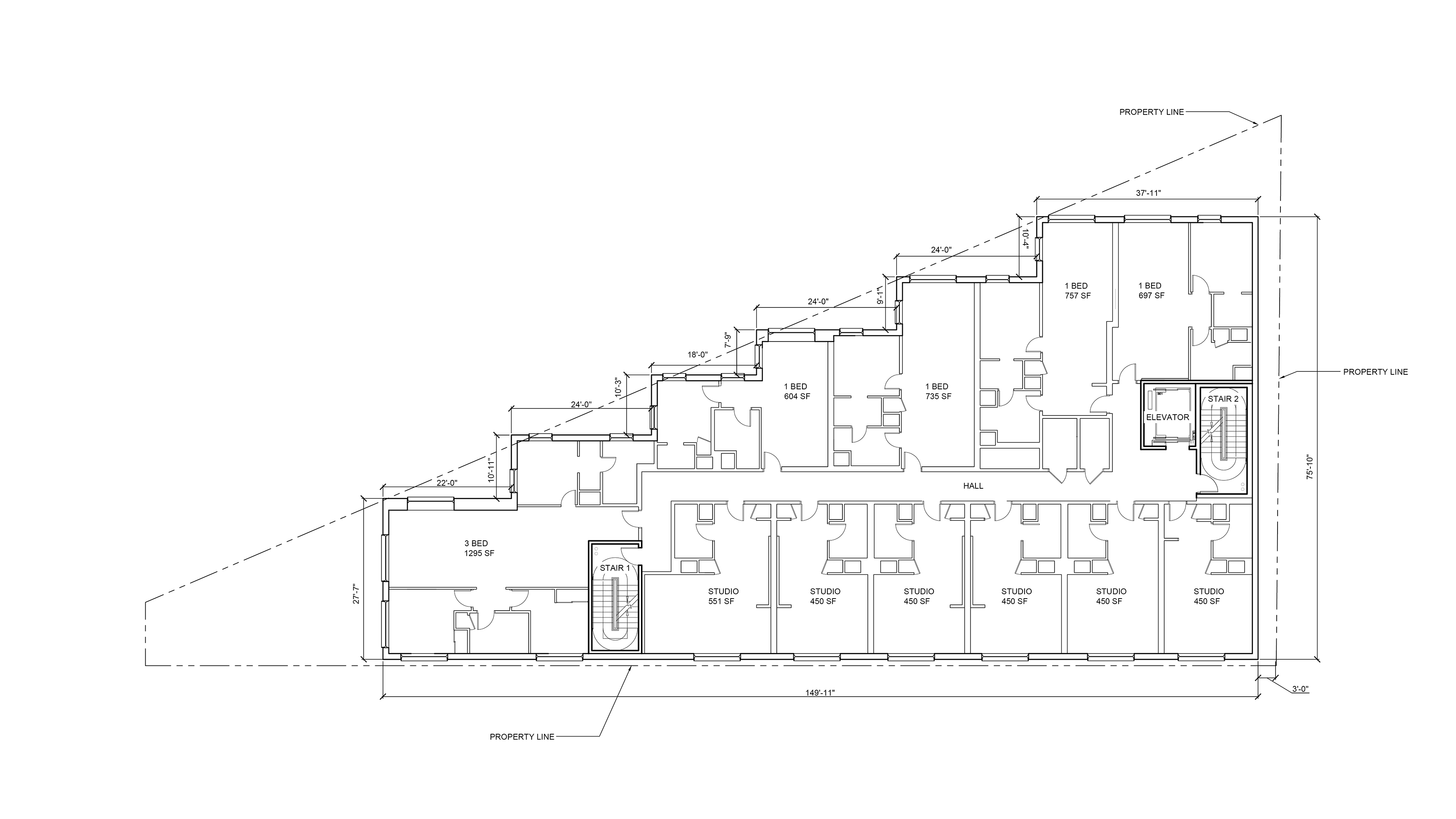 This new residential building occupies a triangular parcel within the West Broadway Neighborhood at the intersection of W 2nd Street (to the north) and Athens Street (to the south). The site's unique geometry presents the opportunity to return a significant amount of public space to the community. By pulling back the footprint approximately 40ft from the western tip, the site reintroduces approximately 800sf of public space at a prominent intersection. In addition, the northern edge of the proposal serrates in plan along W 2nd Street to offer a more generous sidewalk experience for pedestrians. This modulation also creates a series of pockets along the sidewalk, adding visual interest and the opportunity for trees and other plantings.