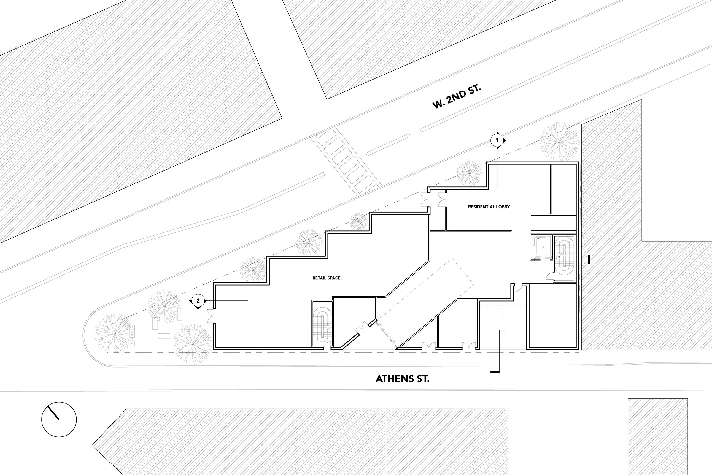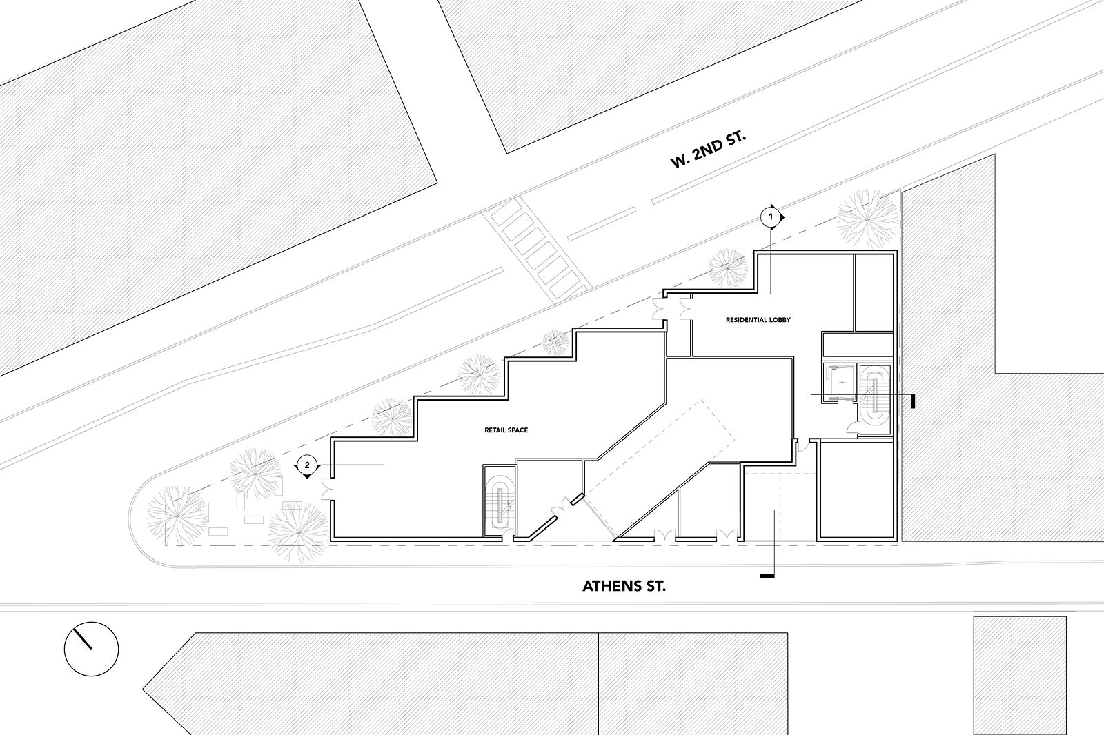 The structure consists of 6 stories; 5 floors of residential units and a ground level of retail and building services. Approximately 2,600sf of retail space is in the westernmost portion of the plan, which addresses the public space and the primary circulation intersection of W 2nd Street and Athens Street. The ground level contains lobby spaces for the residential portion, accessible from W 2nd Street. Bike racks are accessible from Athens Street, and two parking spaces are located on the ground level for a building-wide car-share service. Floors 2 through 6 contain residential units with a mix of studio, one, two, and three bedrooms. A roof deck located above floor 6 will be available to residents.