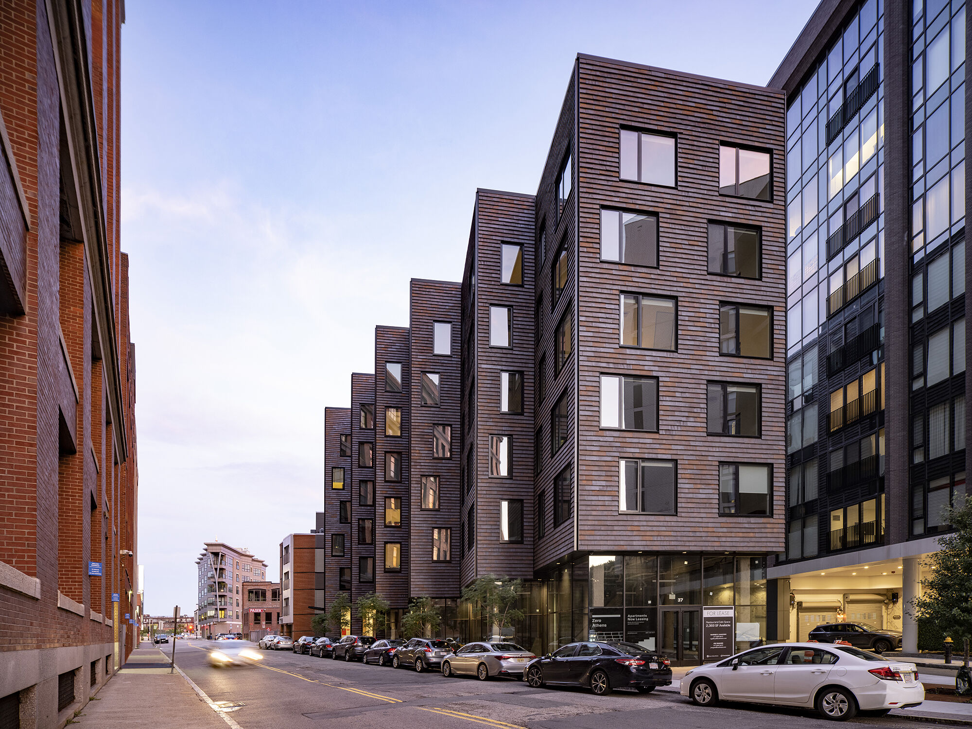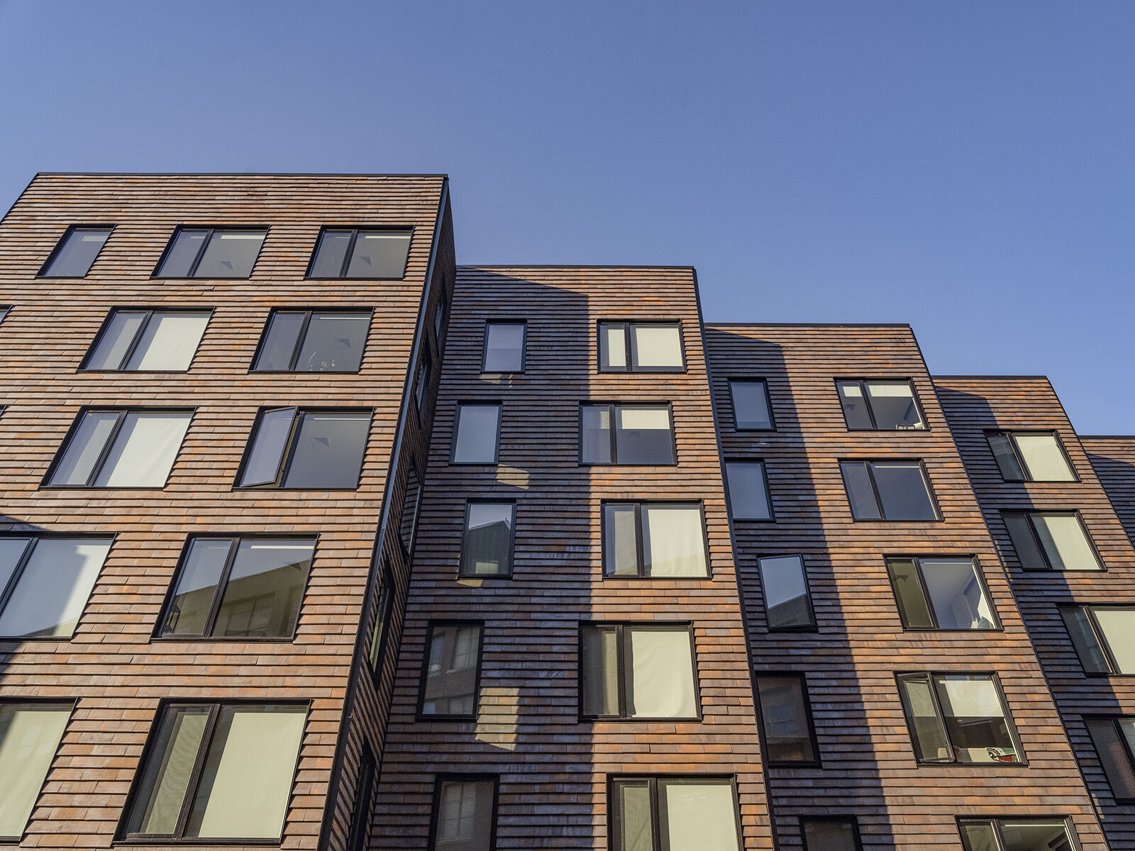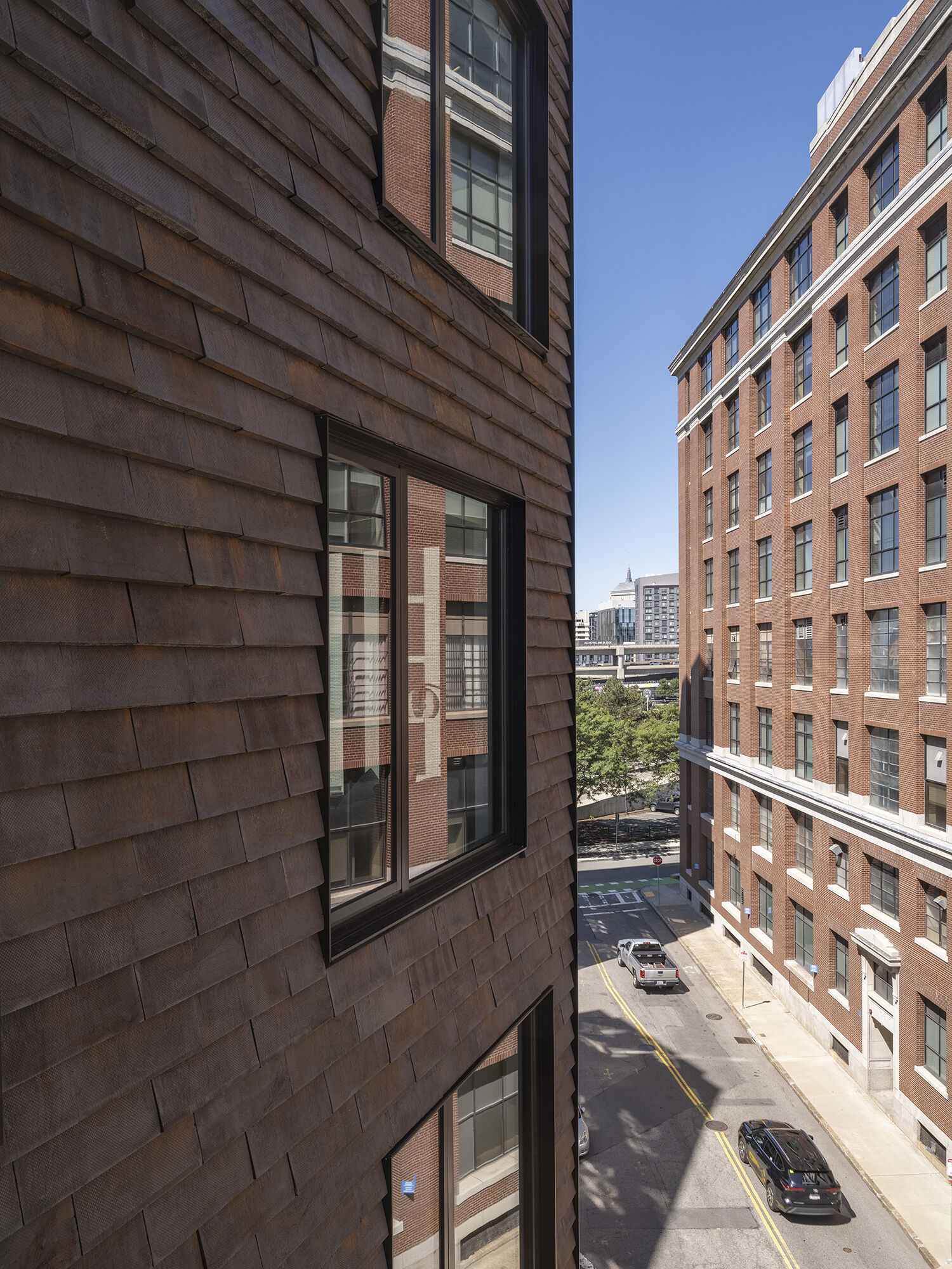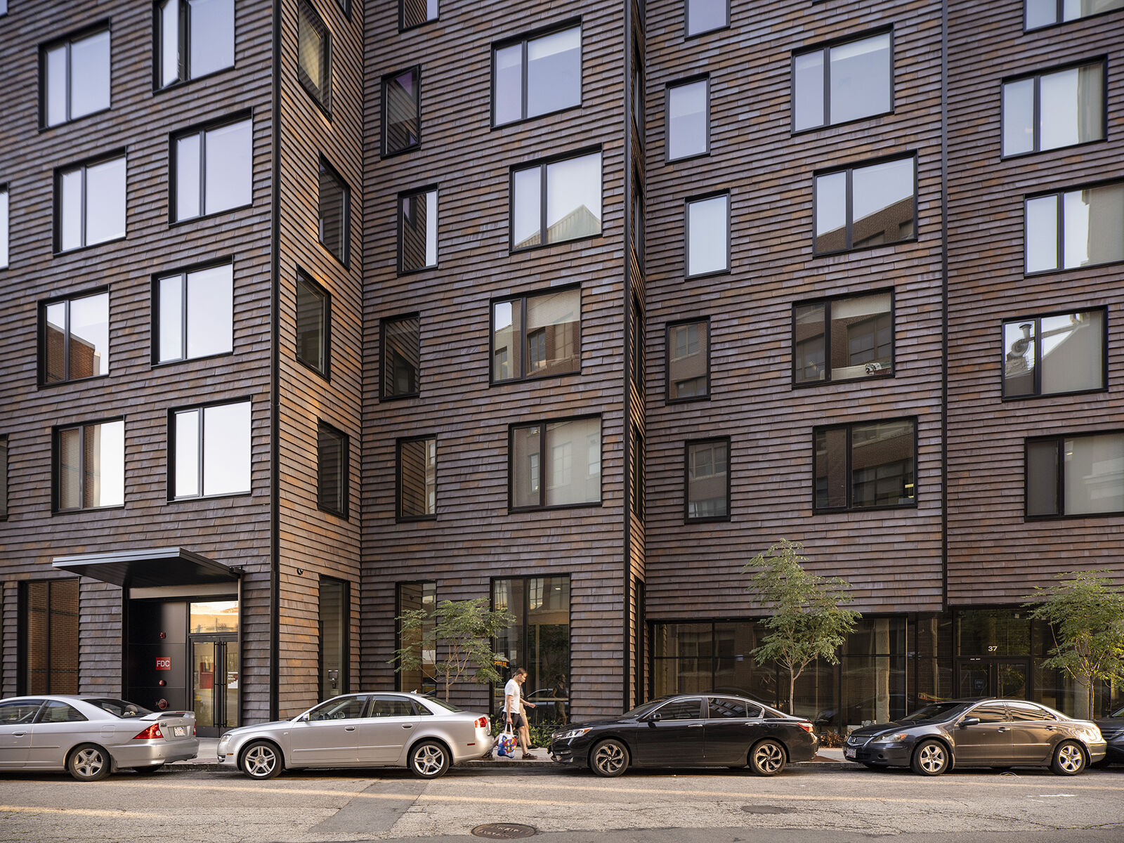 21 West 2nd Street is clad in handmade masonry tiles, a reference to the familiar, typical brick of its existing context; yet it establishes a more contemporary language through its scale and installation. The field of masonry tile on the upper floors is punctured by residential windows of three different proportions. These windows shift in alignment up the facade, adding a secondary level of articulation to the overall elevations.