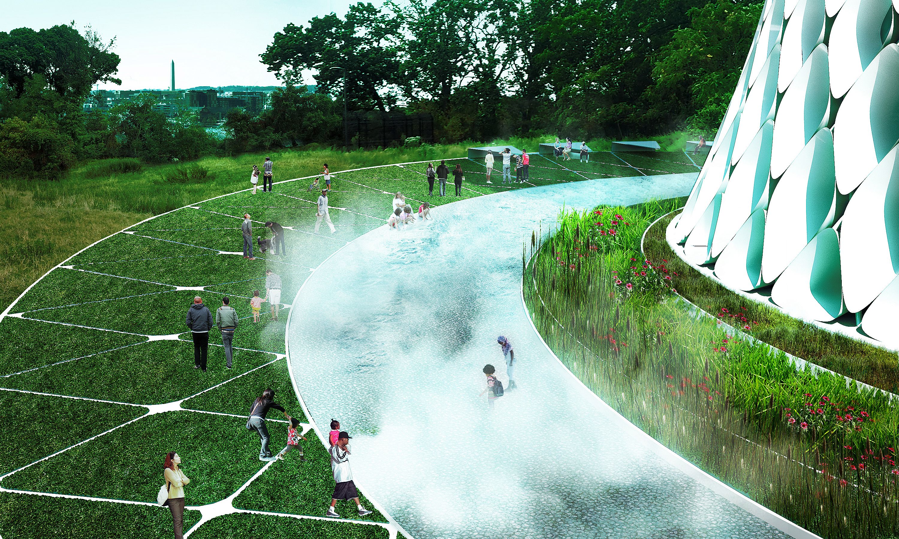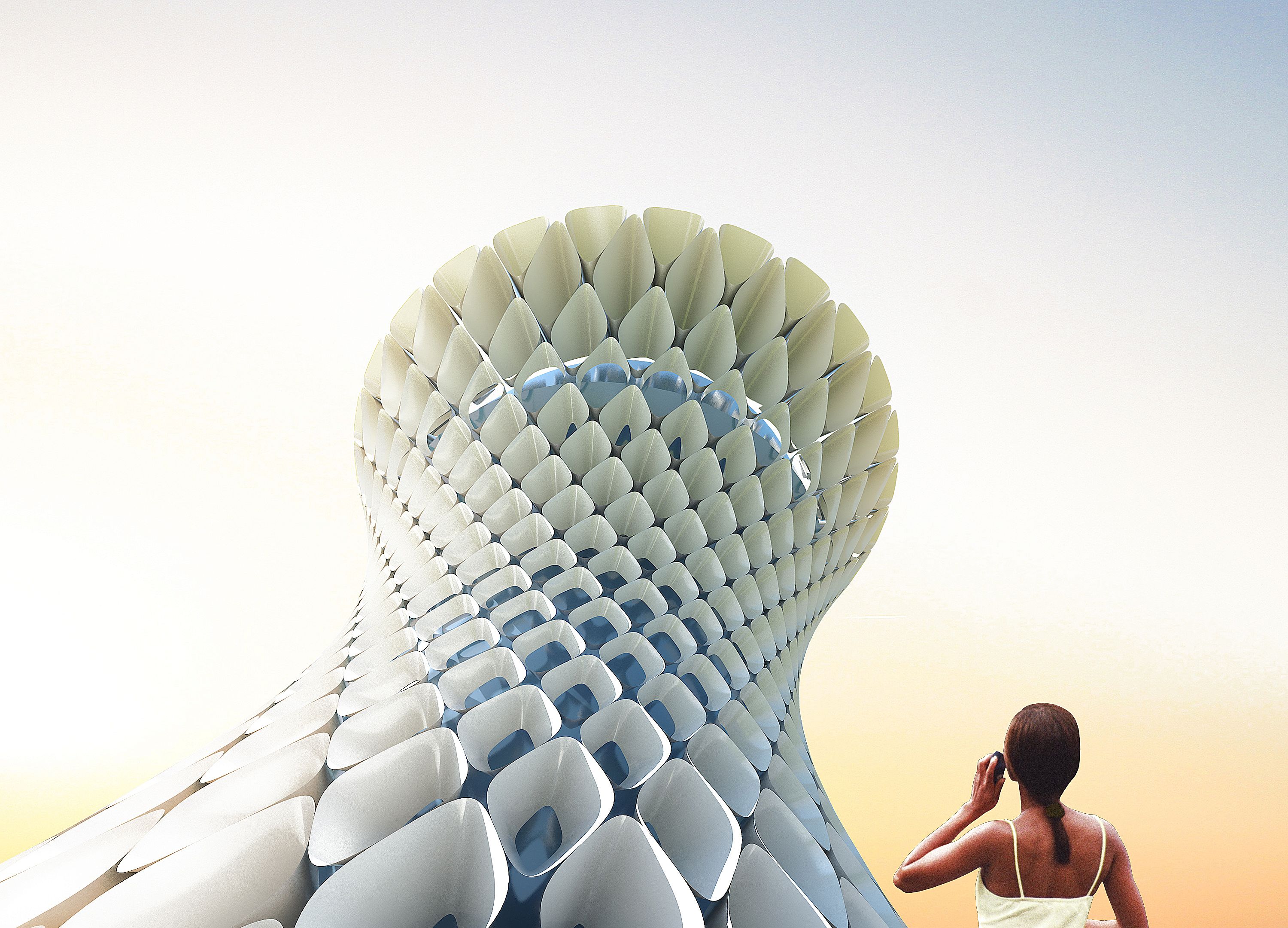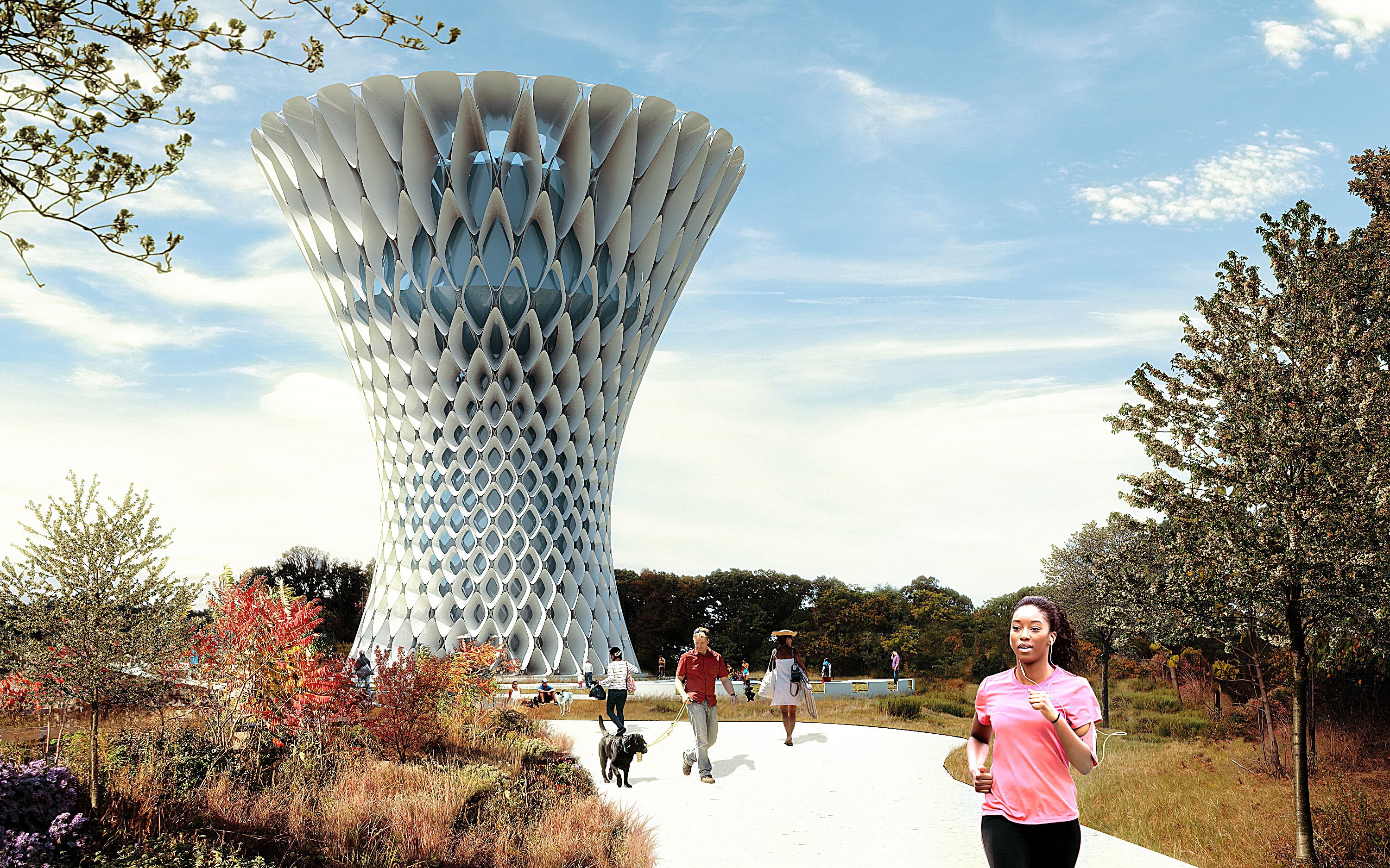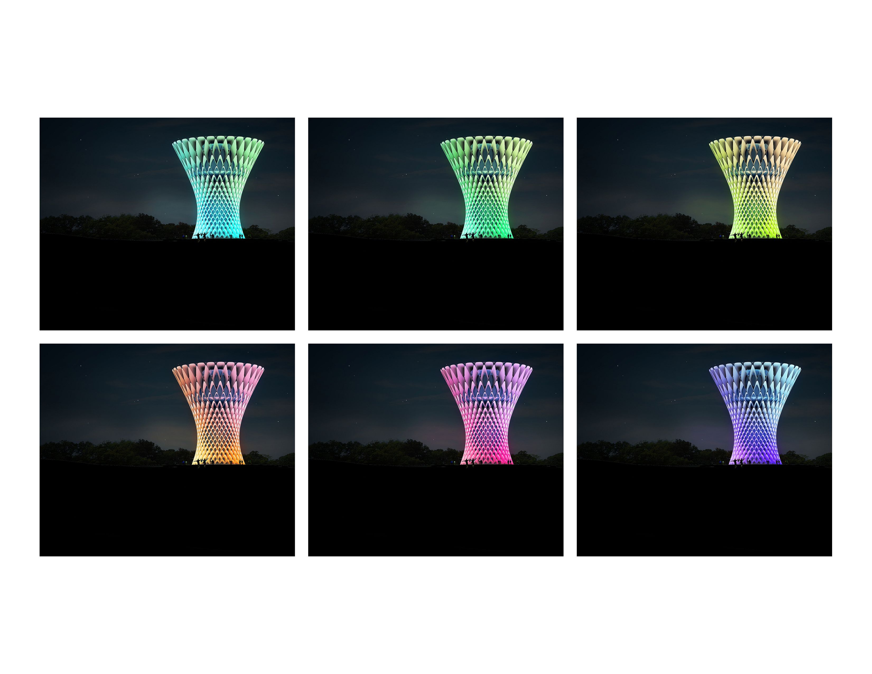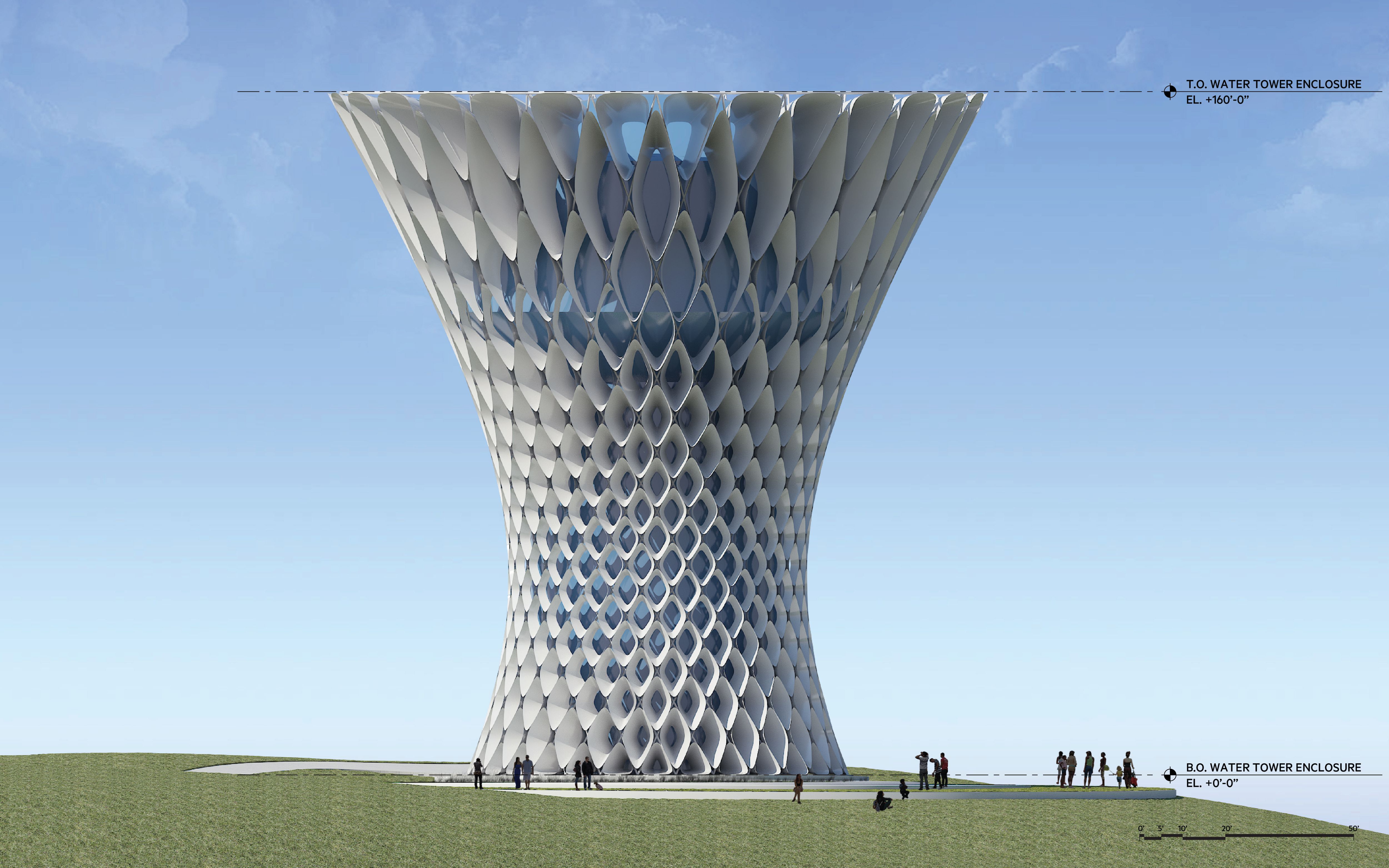 This design is conceived as a visual intermediary, communicating the water tower’s function as well as acting as a place-maker and monument. The design wraps the functional water tower within a new structural shell that can be seen from great distances as well as up close. Individual cells follow the shell’s hyperboloid structure, embracing the form of the water tower within while not completely masking its surface. This proposal for the Anacostia Water Tower seeks to provide a much-needed community resource and water infrastructure while creating a new landmark for the proposed site, the Anacostia community of D.C.