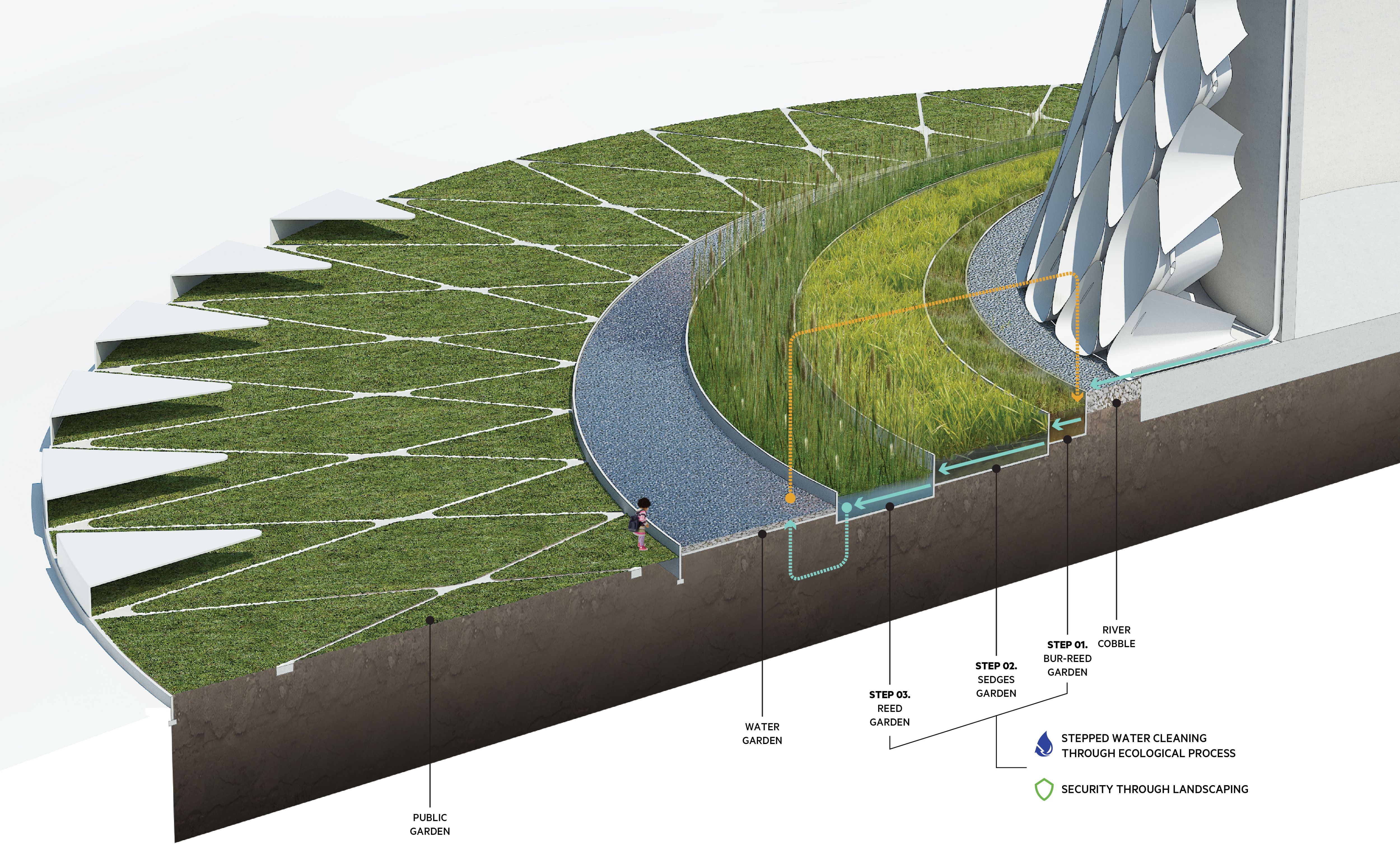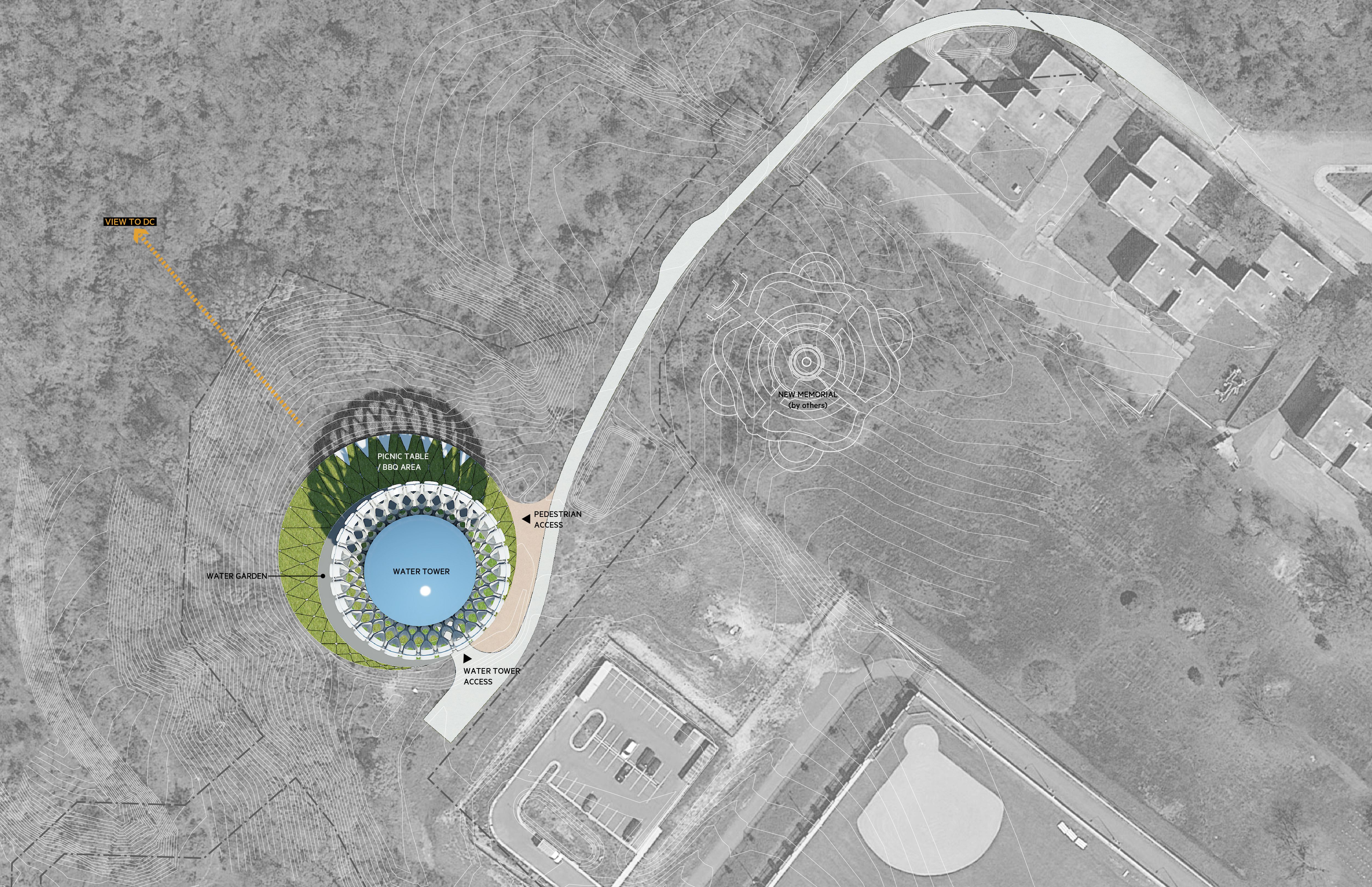 The stepped concentric rings form a series of bioswales and an ecological “living machine,” using plantings to filter water and make the filtration process visible to the community. Due to gravity’s interaction with water flow, a water tower must be placed at a very prominent elevated location. The design is understood as a new kind of monument that is the product of its process - the collection, and processing of water for the surrounding community. This proposal for the water tower shell and its active landscape highlight the water cycle process.