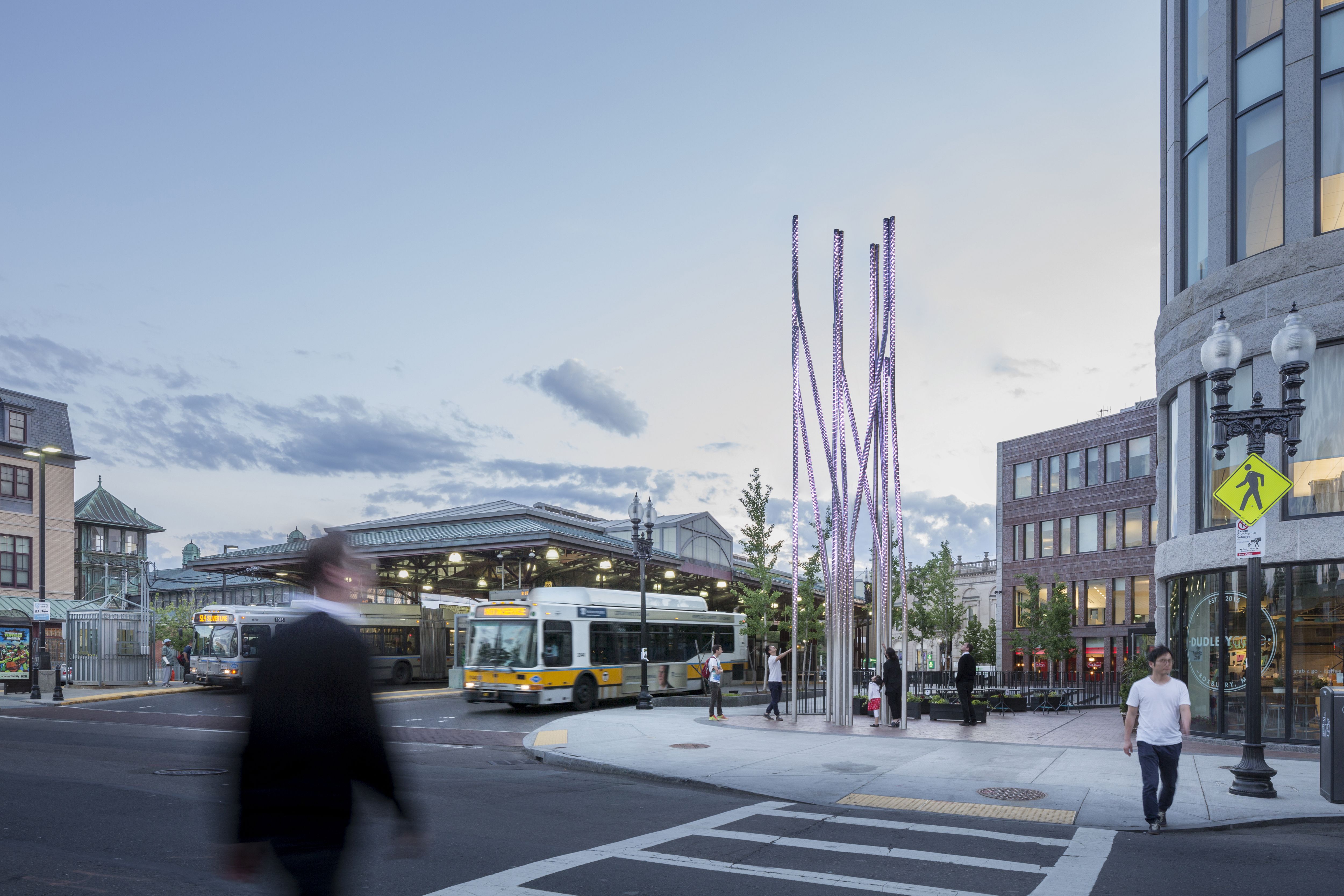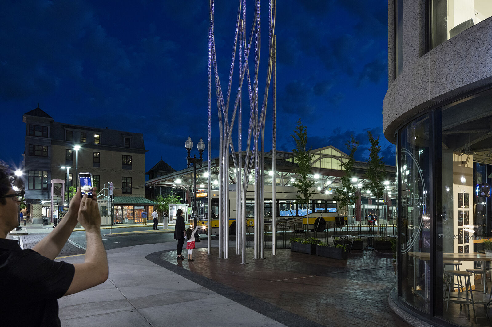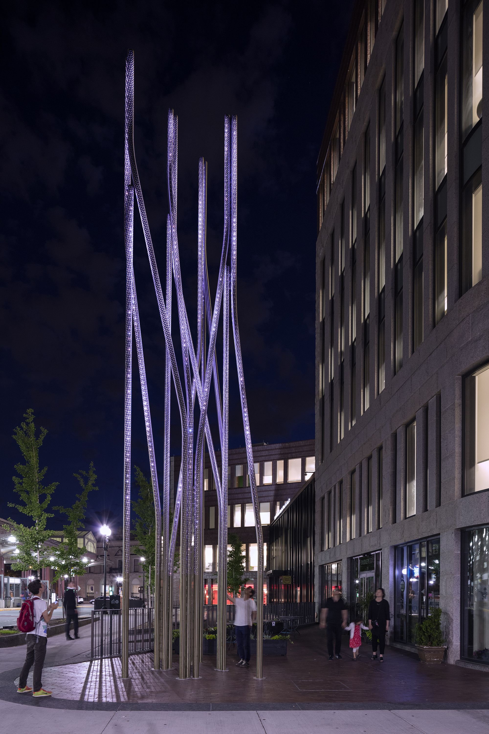The spire uses real-time lighting and digital interfaces to translate open-source online content from the Citizen's Connect system into a pattern of lighting behavior. The structure of the spire is a braided array of tubes woven together acting as a vertical timeline of Boston’s transformation from three distinct towns into a city of 21 neighborhoods.