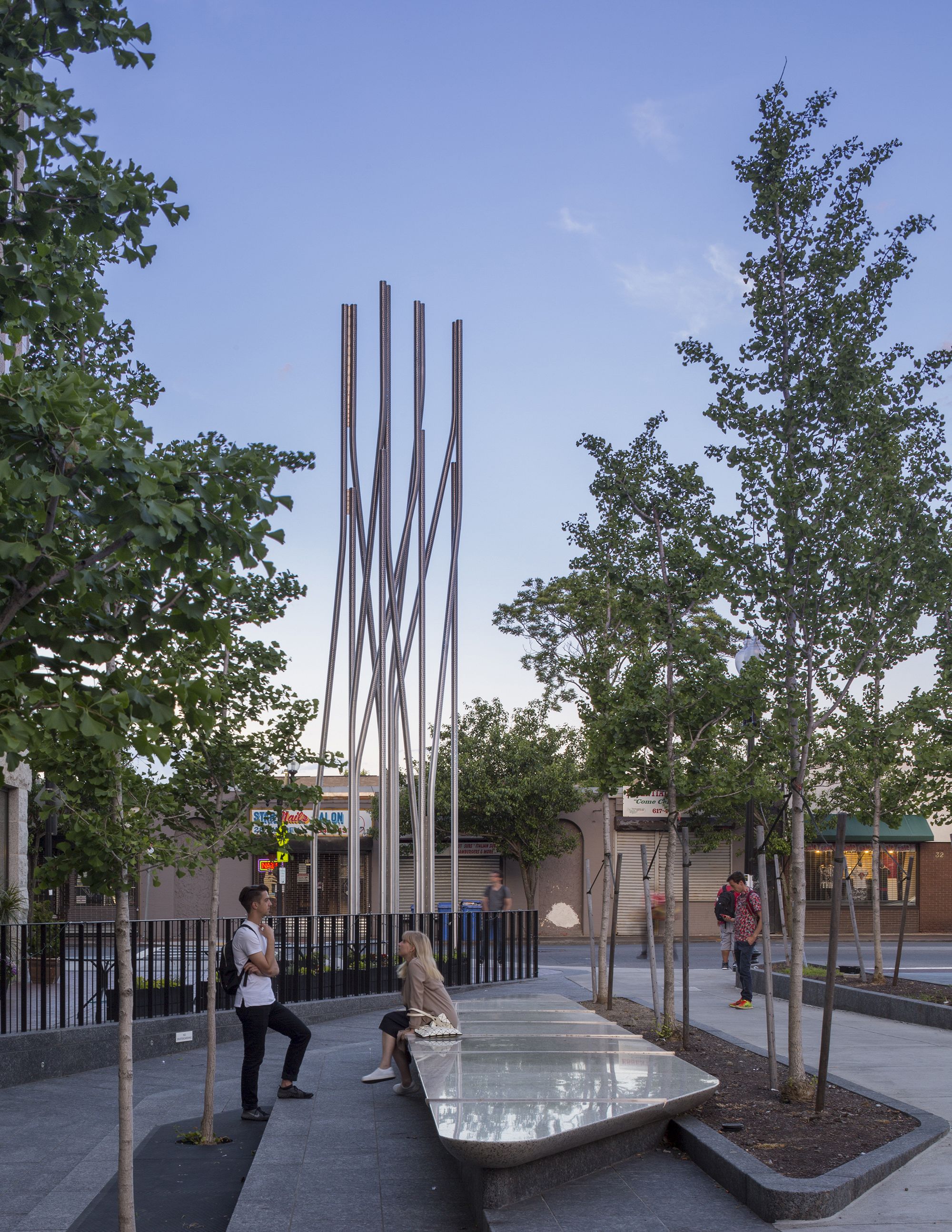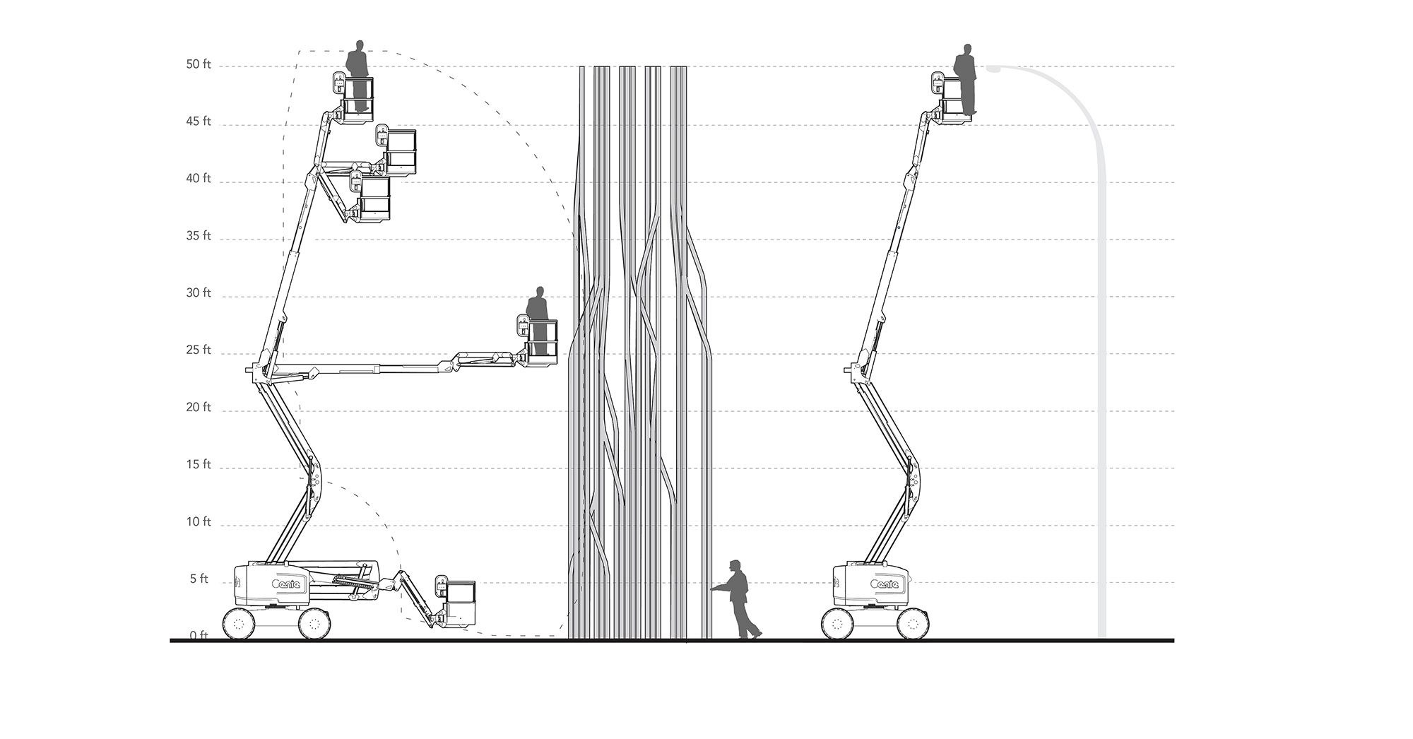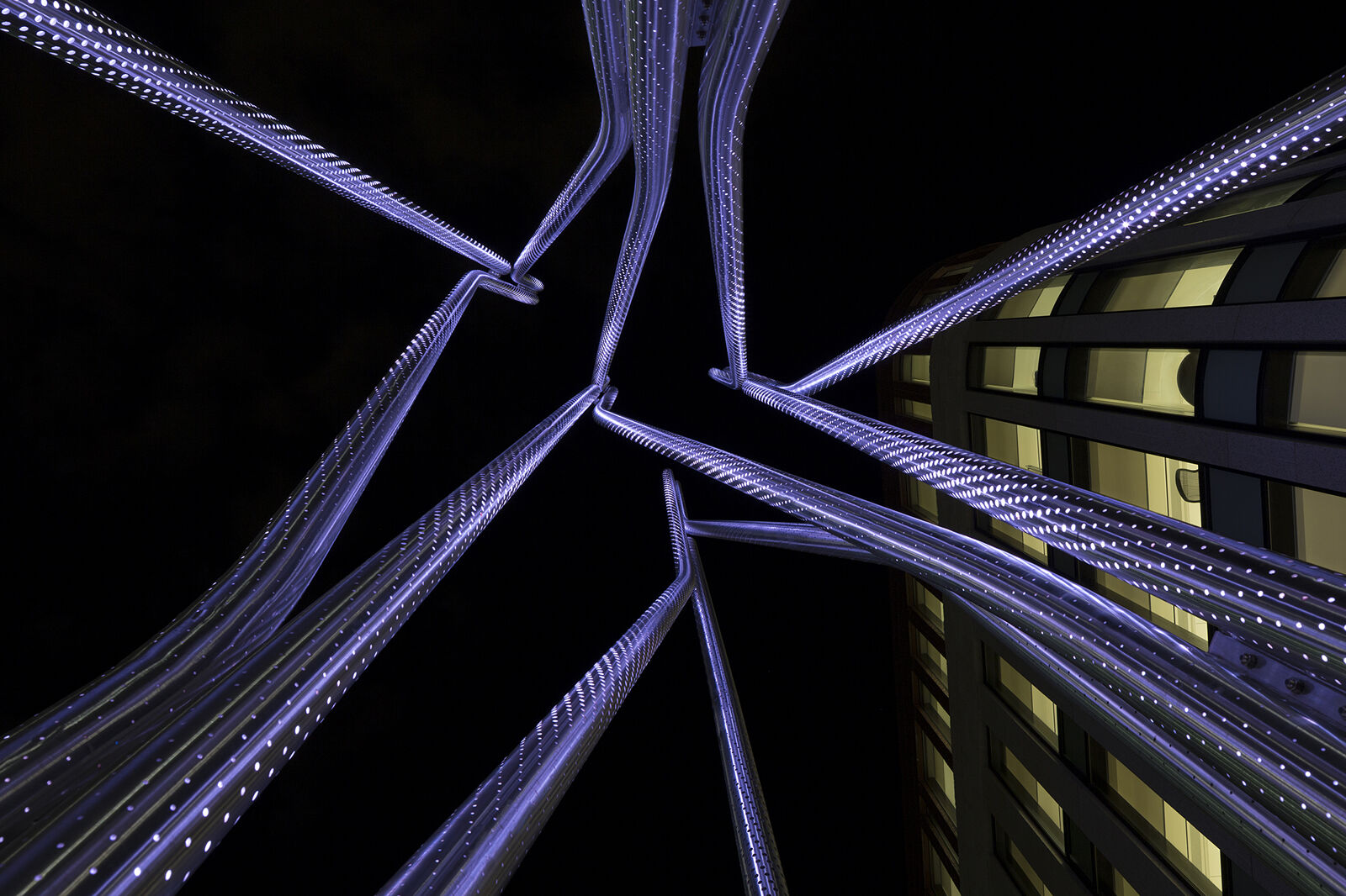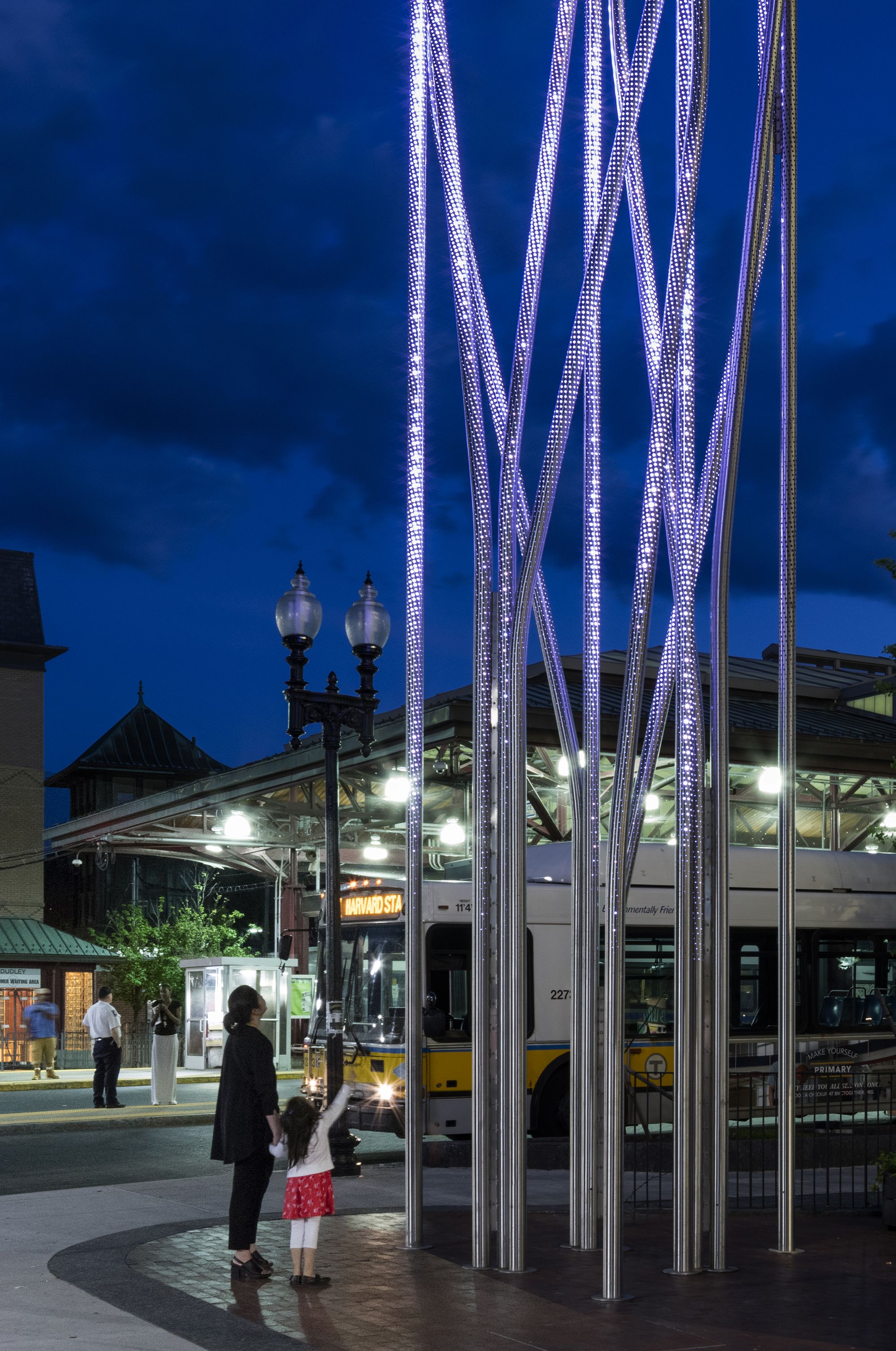 The spire uses real-time lighting and digital interfaces to translate open-source online content from the Citizen's Connect system into a pattern of lighting behavior. The structure of the spire is a braided array of tubes woven together acting as a vertical timeline of Boston’s transformation from three distinct towns into a city of 21 neighborhoods.