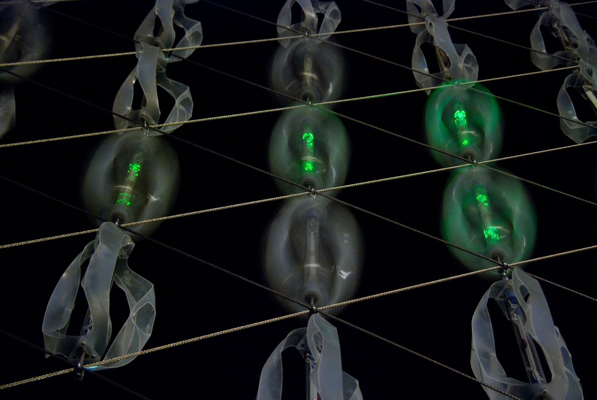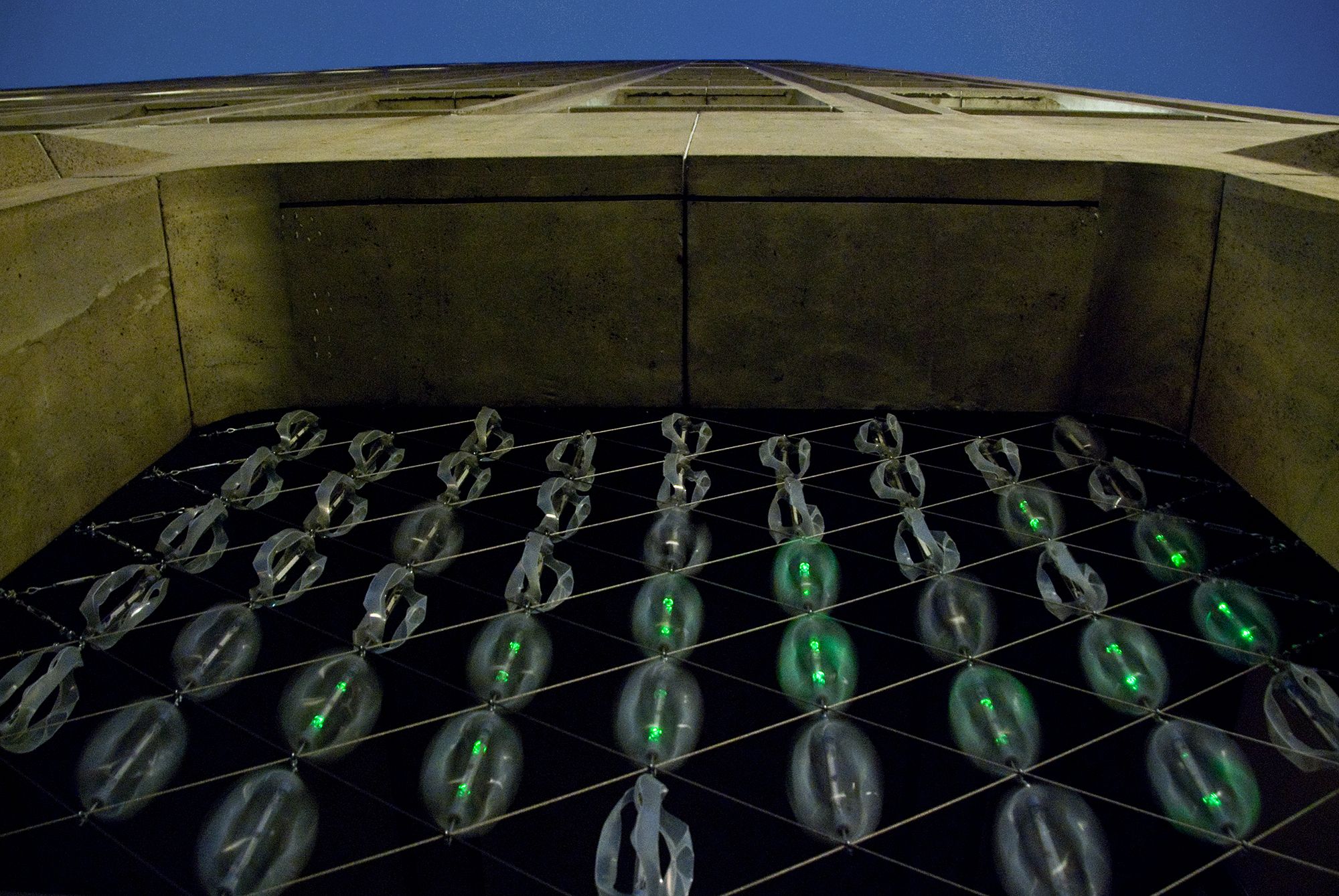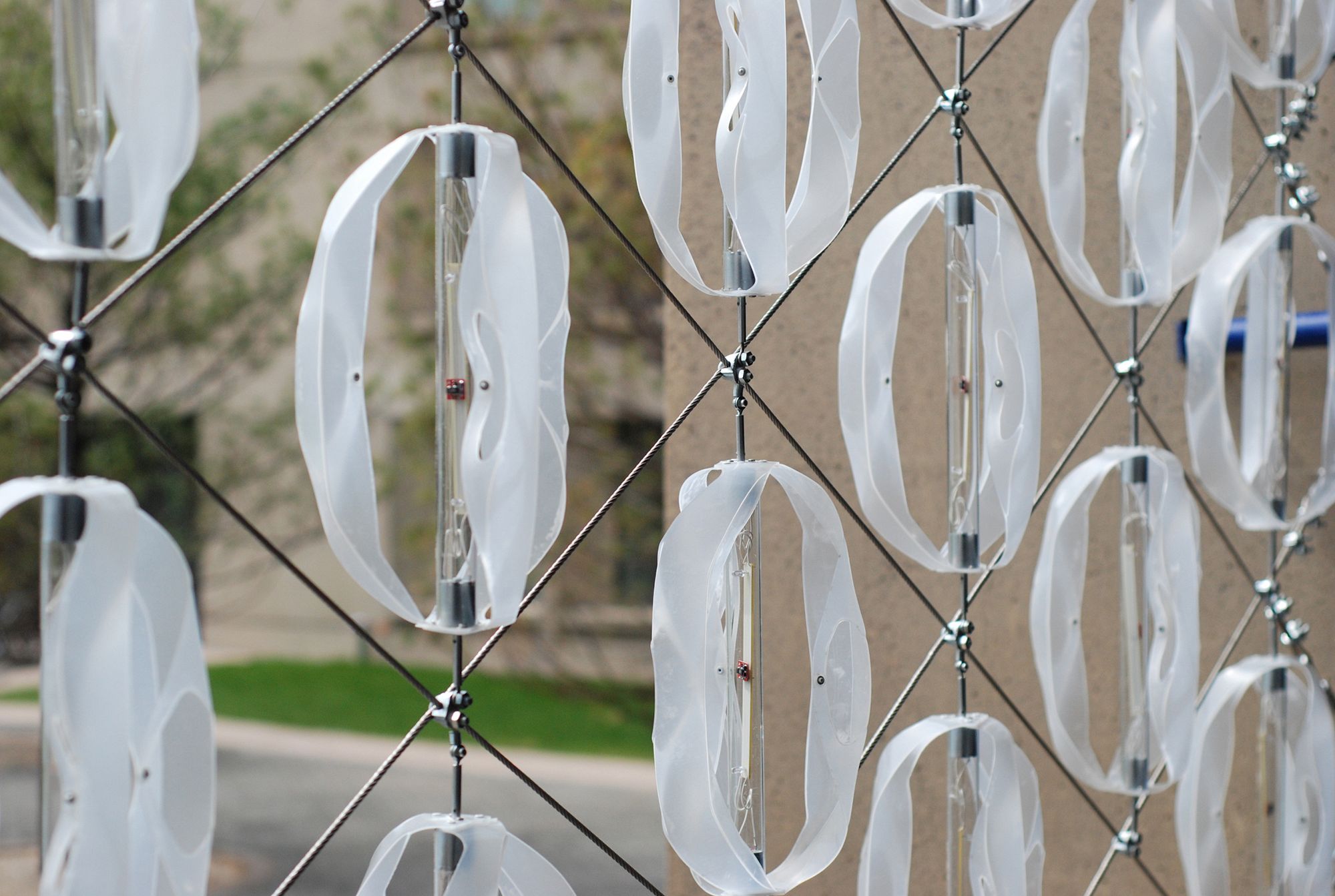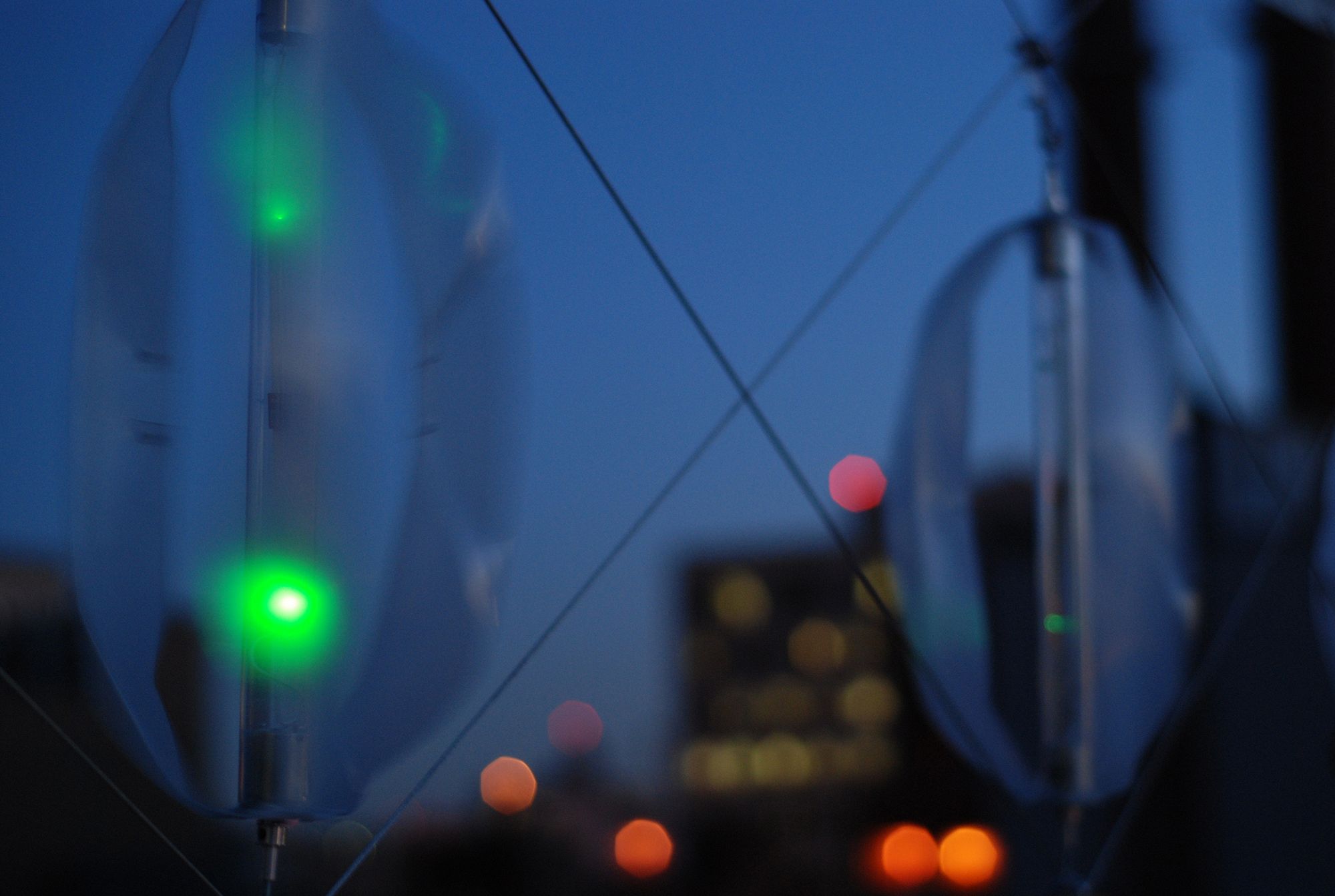 Responsive in real-time to environmental conditions, Windscreen’s level of illumination corresponds to the wind velocity powering each turbine. Taking into account differences based on their location, wind strength, and wind direction, each turbine is calibrated in size and porosity. Based on the same formal logic, each unit thus demonstrates an underlying formal affinity while expressing slight variation. Ultimately, though, each turbine functions in the same way. An LED light is incorporated in the turbine’s vertical-axis cable, and this light responds directly to the speed at which its housing turbine spins. As the wind blows stronger and the turbines spin faster, the lights illuminate more brightly. This “direct-drive” application need not transfer or store energy: energy is consumed as soon as it is produced, always balancing the equation.