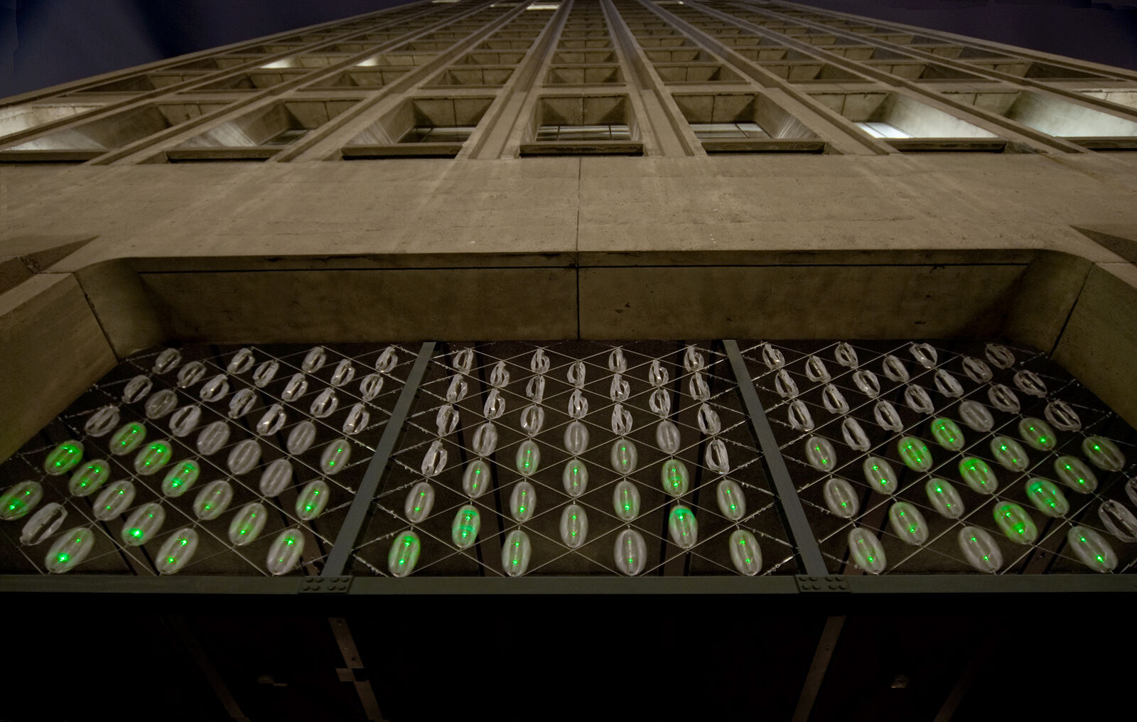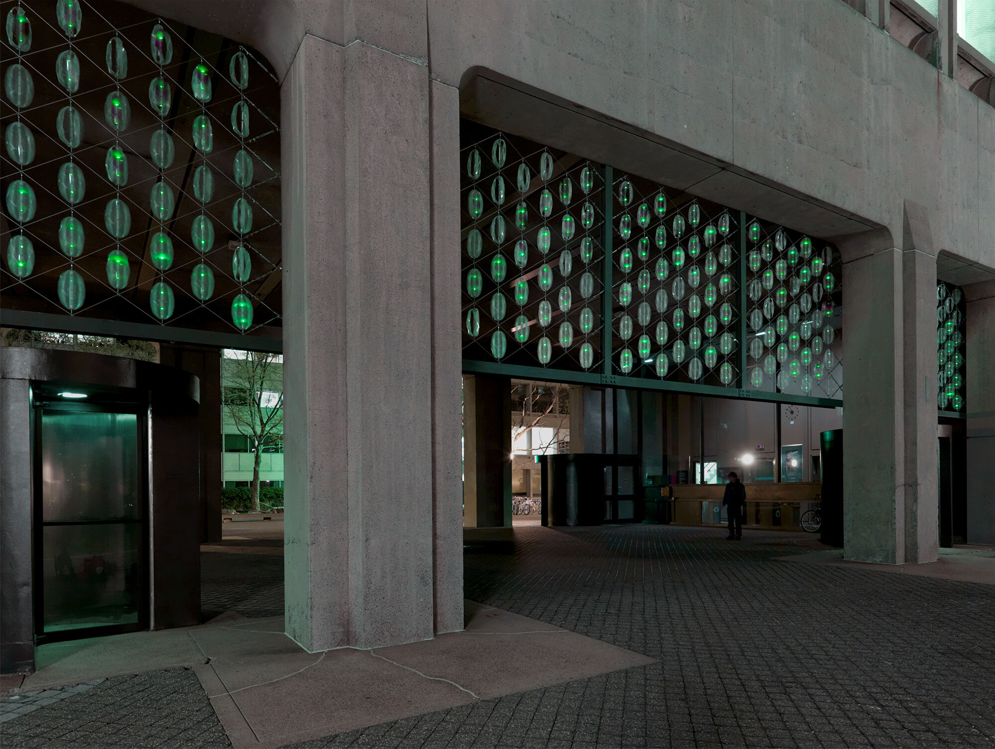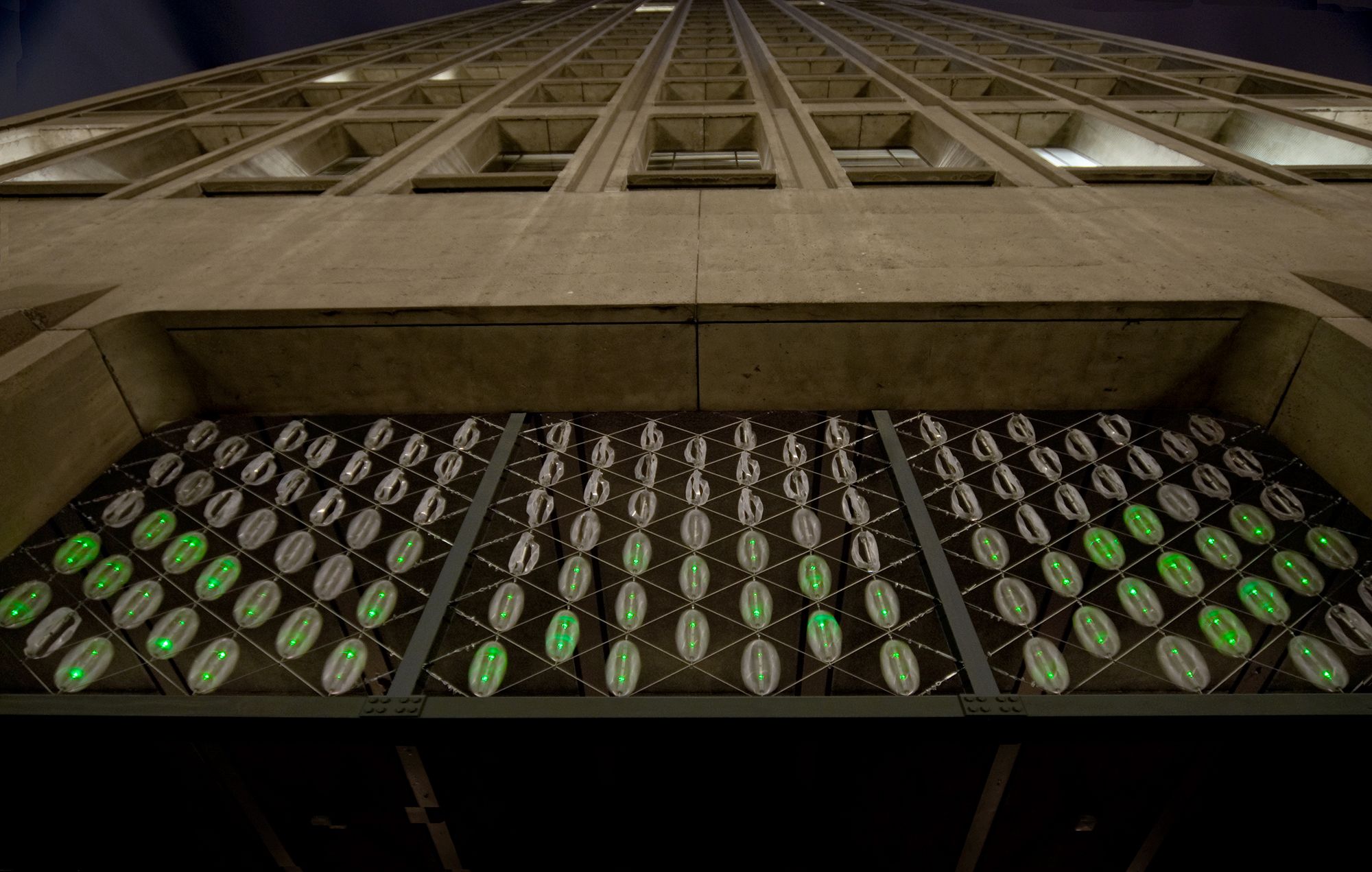 Responsive in real-time to environmental conditions, Windscreen’s level of illumination corresponds to the wind velocity powering each turbine. Taking into account differences based on their location, wind strength, and wind direction, each turbine is calibrated in size and porosity. Based on the same formal logic, each unit thus demonstrates an underlying formal affinity while expressing slight variation. Ultimately, though, each turbine functions in the same way. An LED light is incorporated in the turbine’s vertical-axis cable, and this light responds directly to the speed at which its housing turbine spins. As the wind blows stronger and the turbines spin faster, the lights illuminate more brightly. This “direct-drive” application need not transfer or store energy: energy is consumed as soon as it is produced, always balancing the equation.
