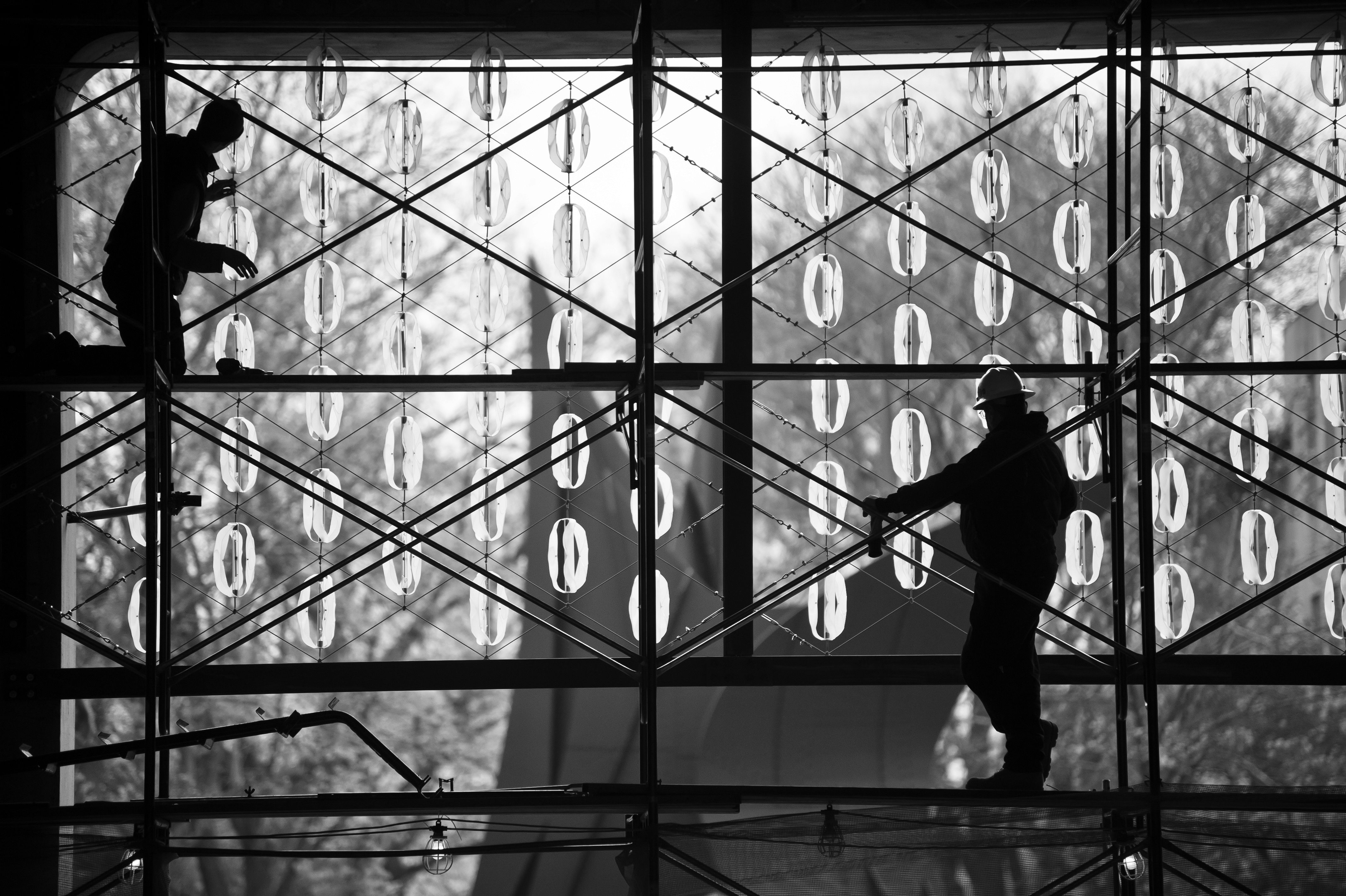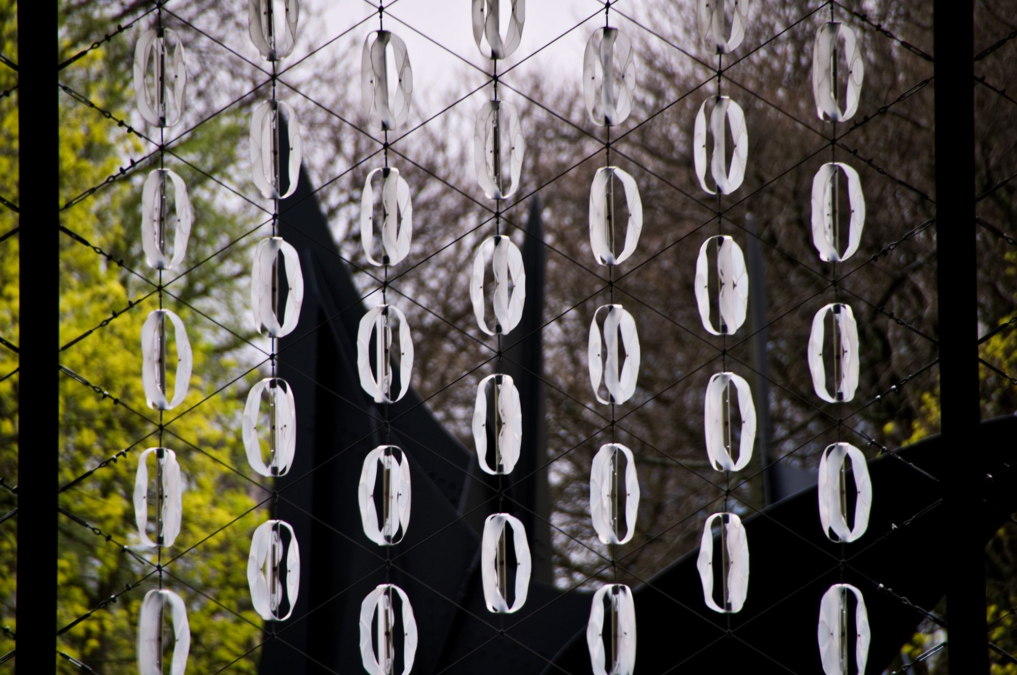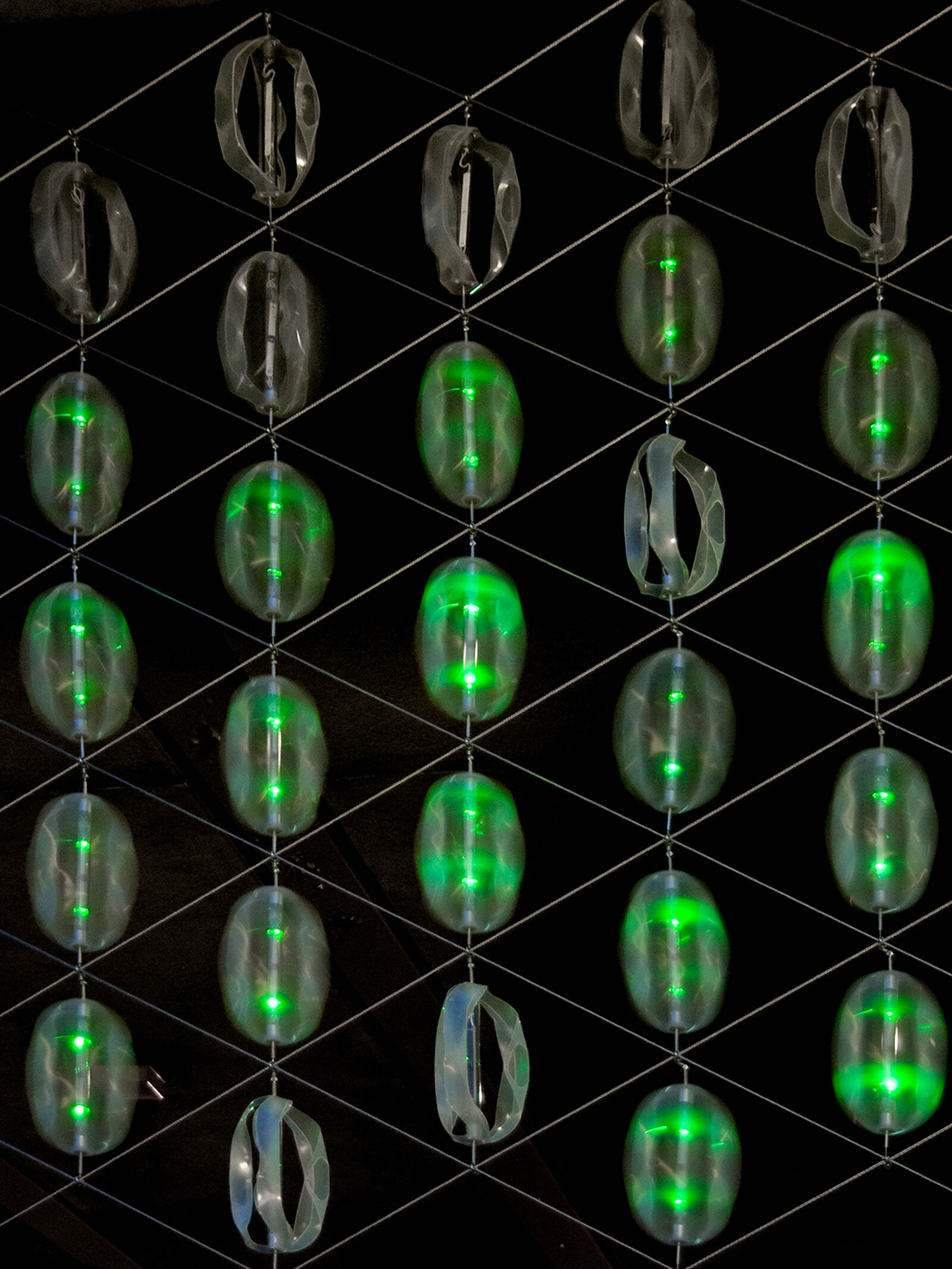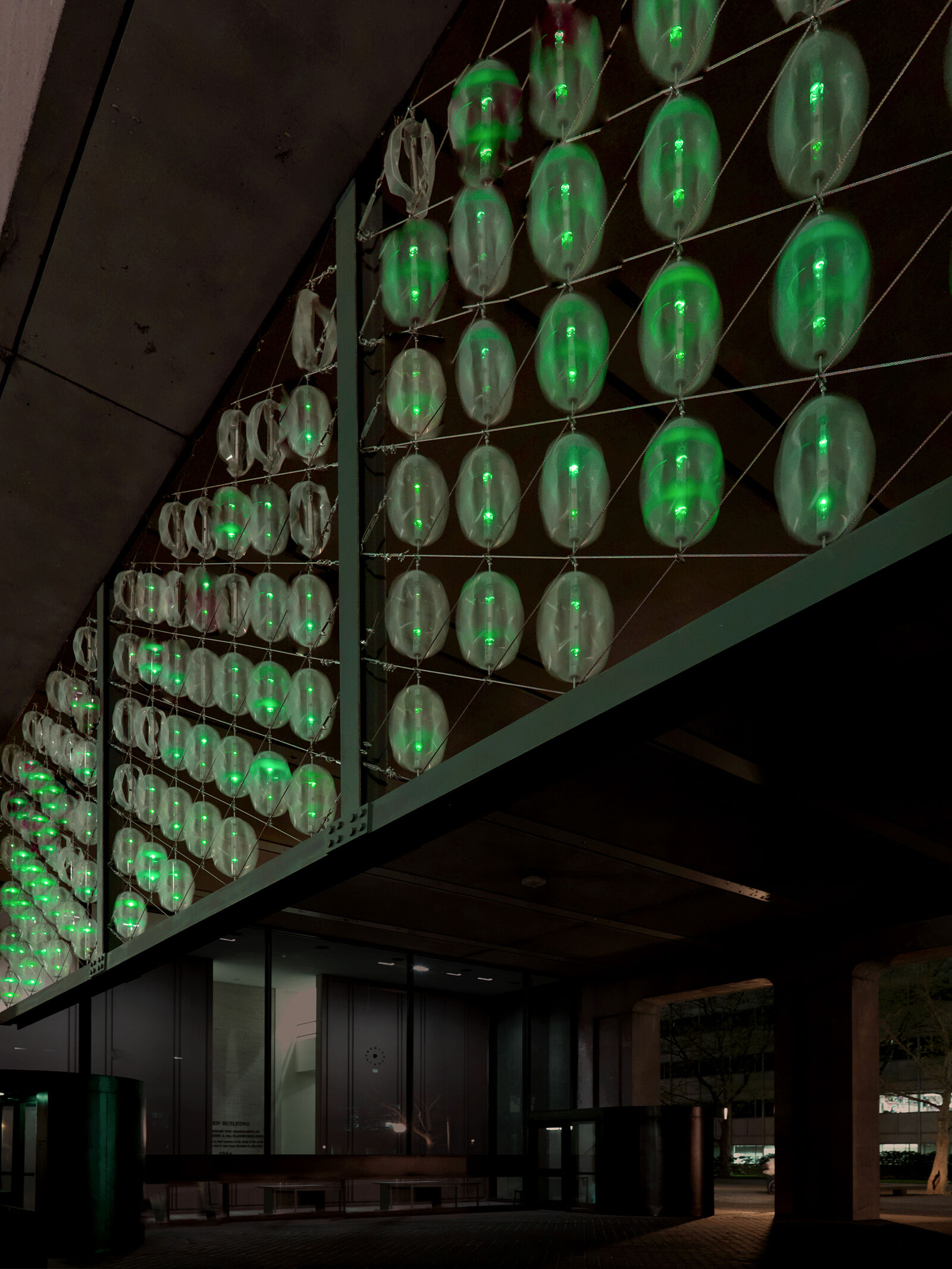Responsive in real-time to environmental conditions, Windscreen’s level of illumination corresponds to the wind velocity powering each turbine. Taking into account differences based on their location, wind strength, and wind direction, each turbine is calibrated in size and porosity. Based on the same formal logic, each unit thus demonstrates an underlying formal affinity while expressing slight variation. Ultimately, though, each turbine functions in the same way. An LED light is incorporated in the turbine’s vertical-axis cable, and this light responds directly to the speed at which its housing turbine spins. As the wind blows stronger and the turbines spin faster, the lights illuminate more brightly. This “direct-drive” application need not transfer or store energy: energy is consumed as soon as it is produced, always balancing the equation.