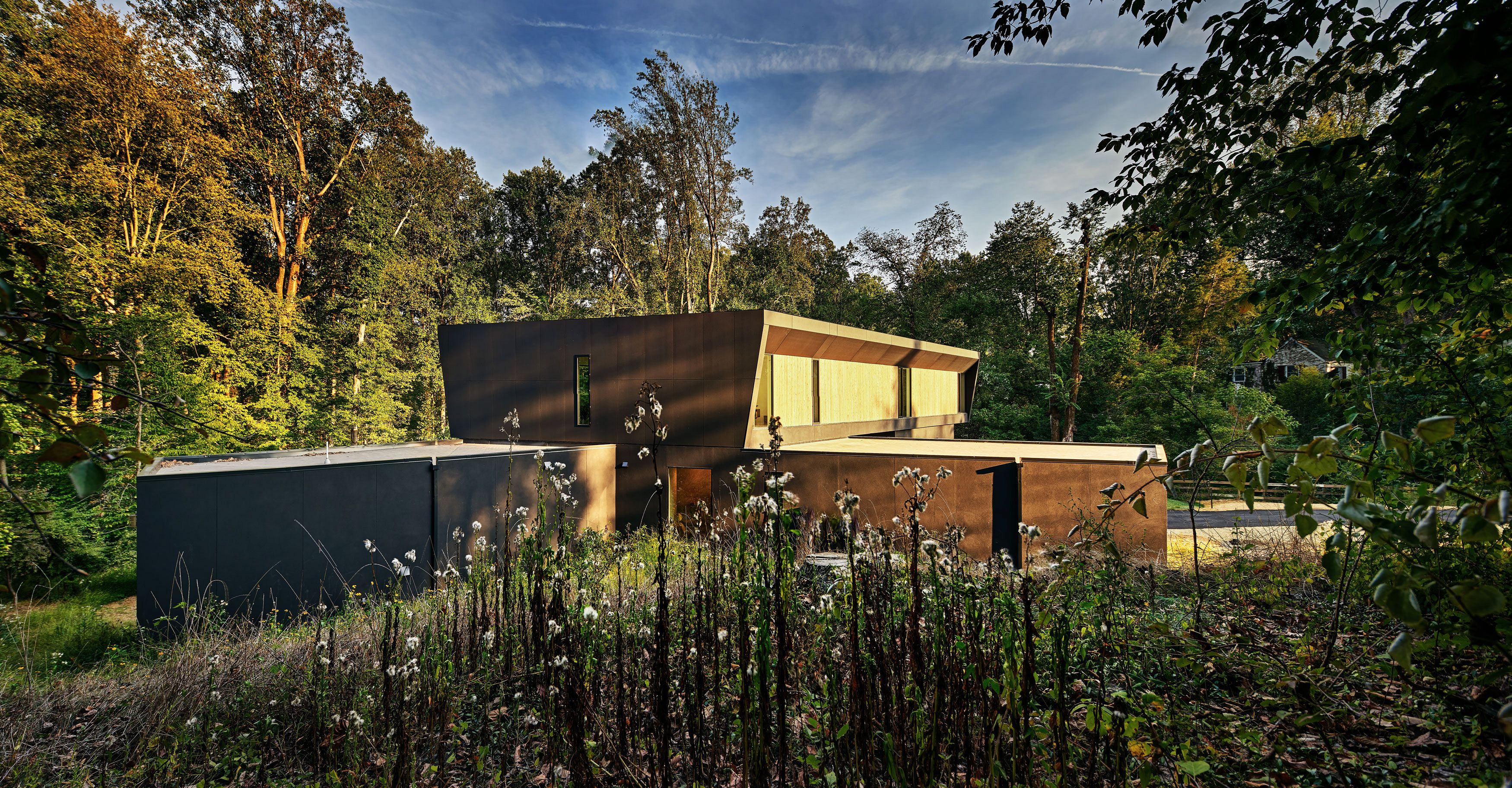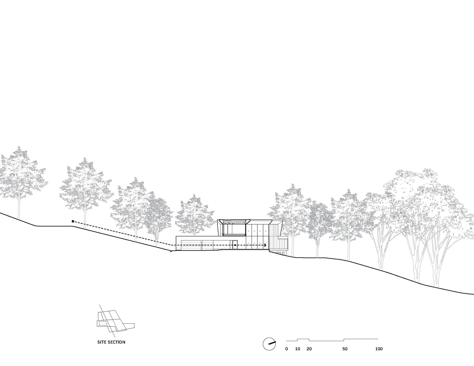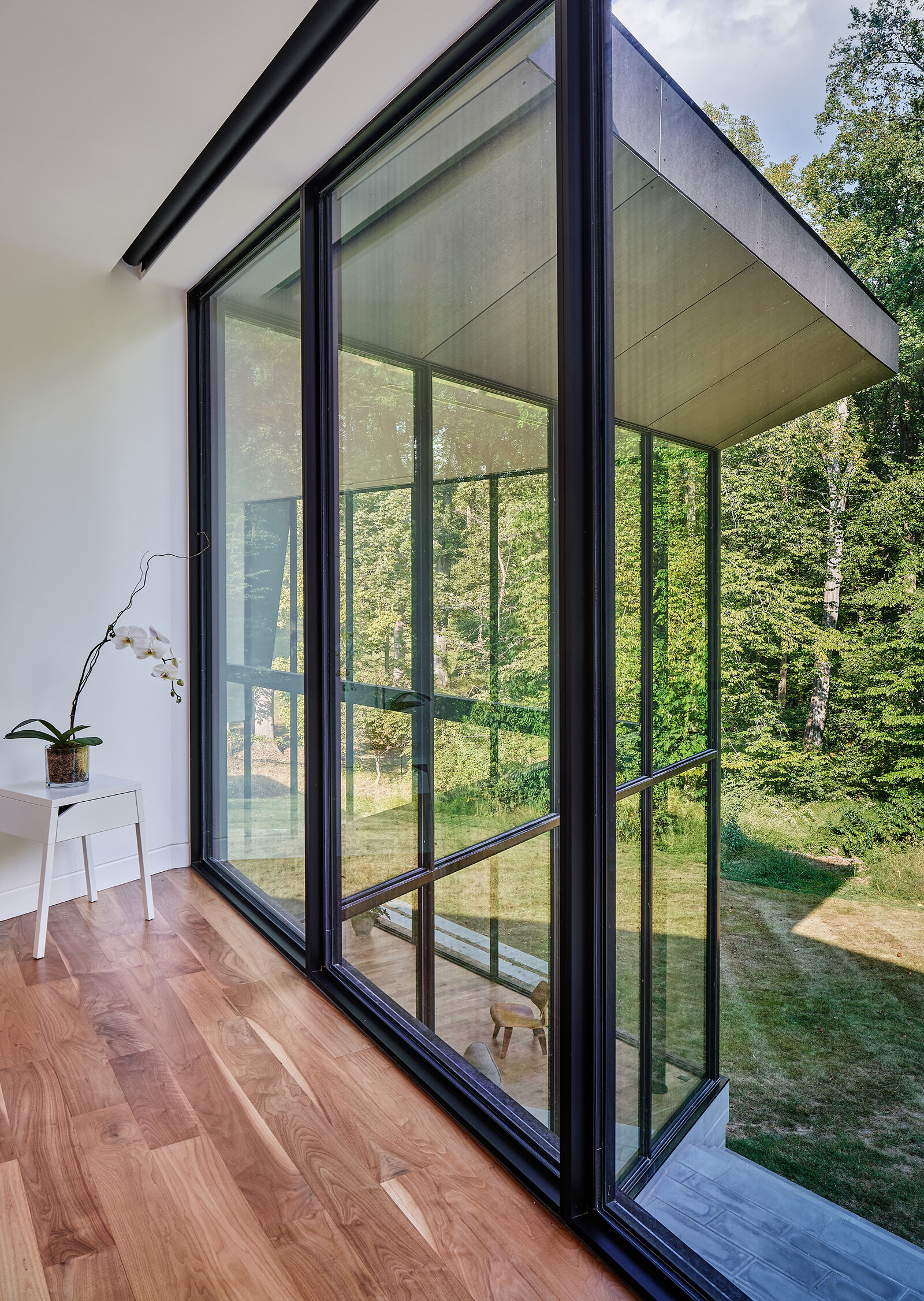 Floor-to-ceiling windows run along the length of the dining and kitchen areas to create a porous southeastern facade that pulls the forest inward. With its glazed southeastern face and knife-edge shading visor, Oblique House is designed to maximize solar exposure on short winter days and, with its corridor along the northwestern face, keep the house from overheating in the summer. Deep visors cast shade over the glazed living area and bedrooms to protect against harsh light in the summer months.