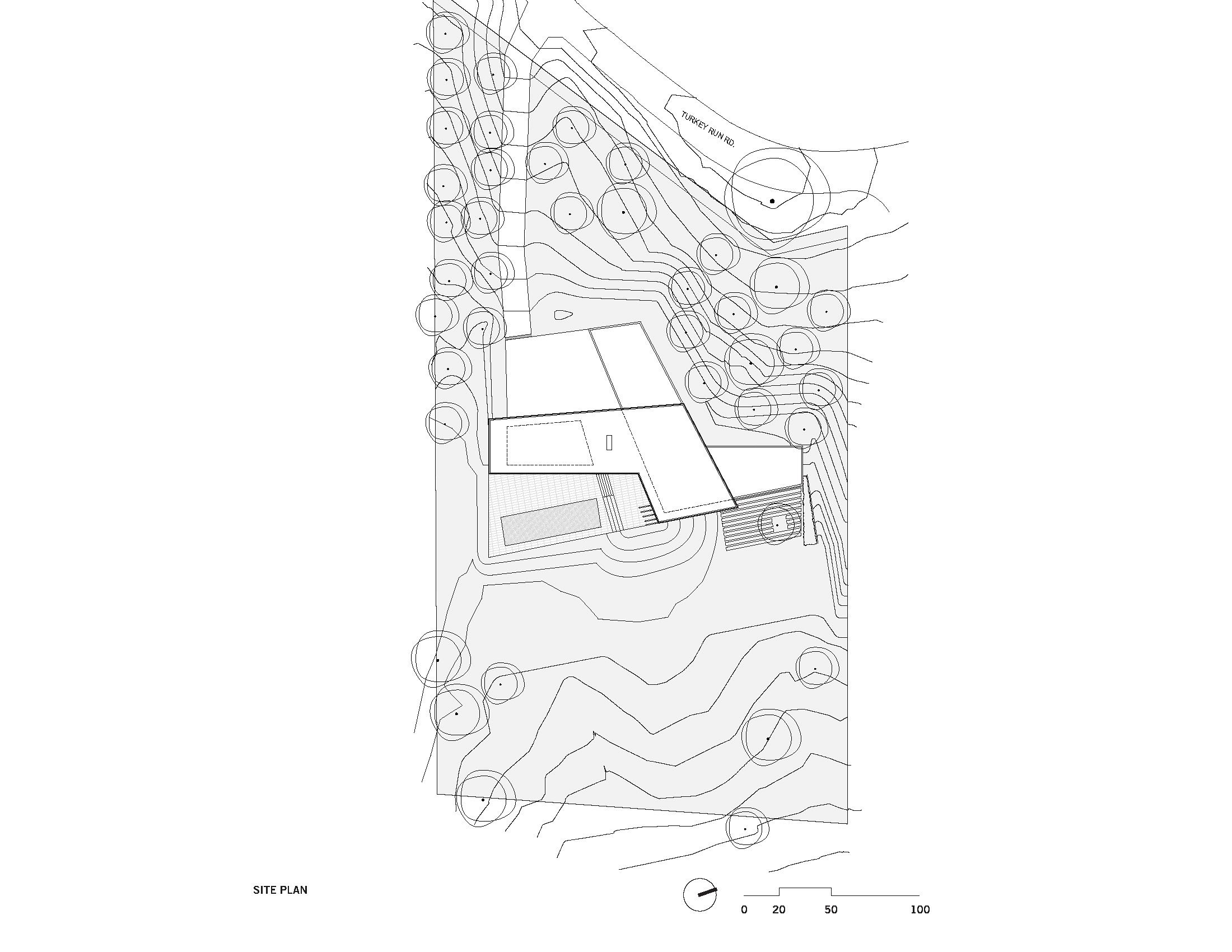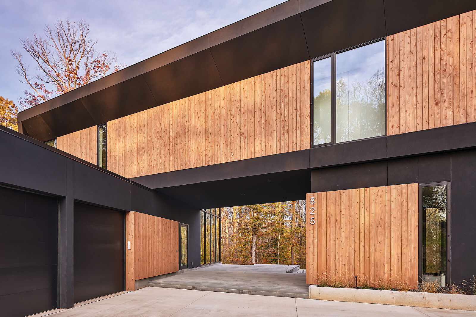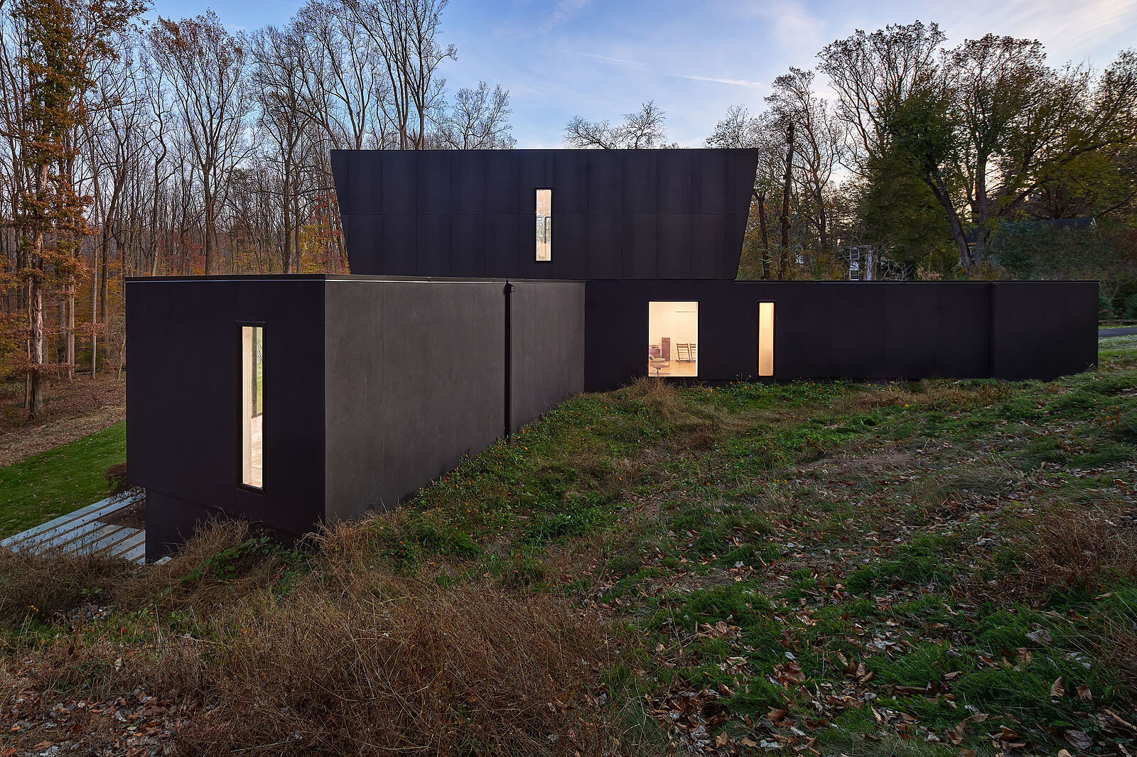 Nestled into Virginia’s deciduous forest, Oblique House engages its residents with their surroundings. The site’s gradual slope invites a continuous circulation through the entrance way, through the yard, and into the forest behind- a gentle slope leading to Langley Fork Park. The approach to the house includes a framed glimpse of the central view, revealed completely upon entering the house.