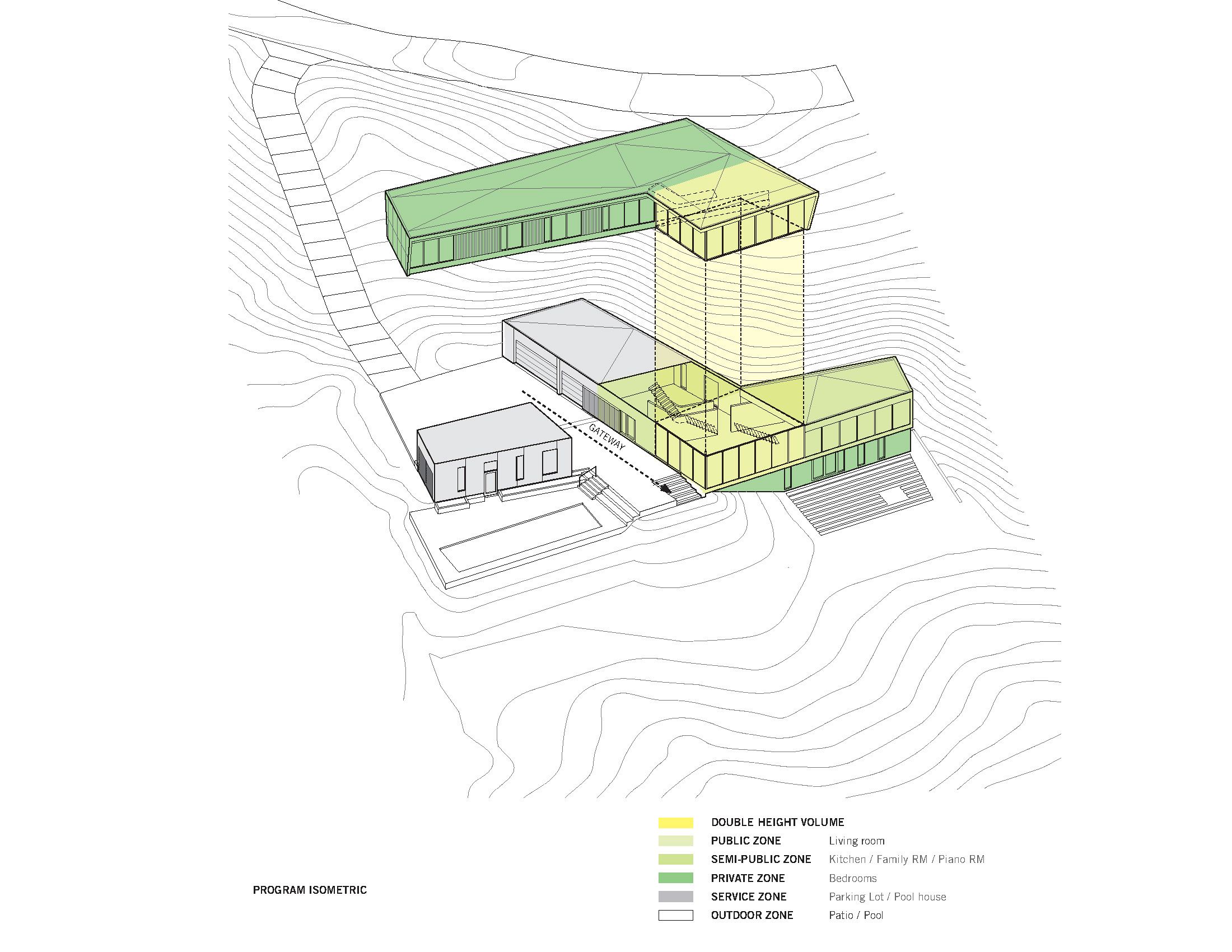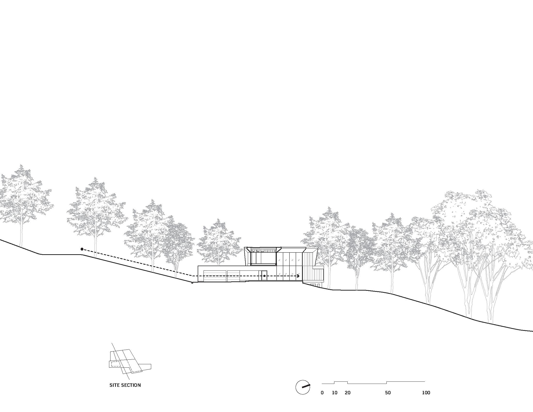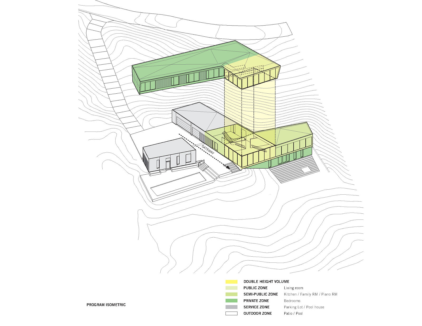 Two stacked L-shaped volumes overlap obliquely to create a doubleheight space, which orients a visitor to the house’s organization. The house’s lower bar, which contains living and dining space, and upper bar, housing the bedroom suites, revolve around the grand living space. This tall glazed room pushes the lower bar forward in pursuit of light and presents cascading views which visually connect the house’s public and private functions.